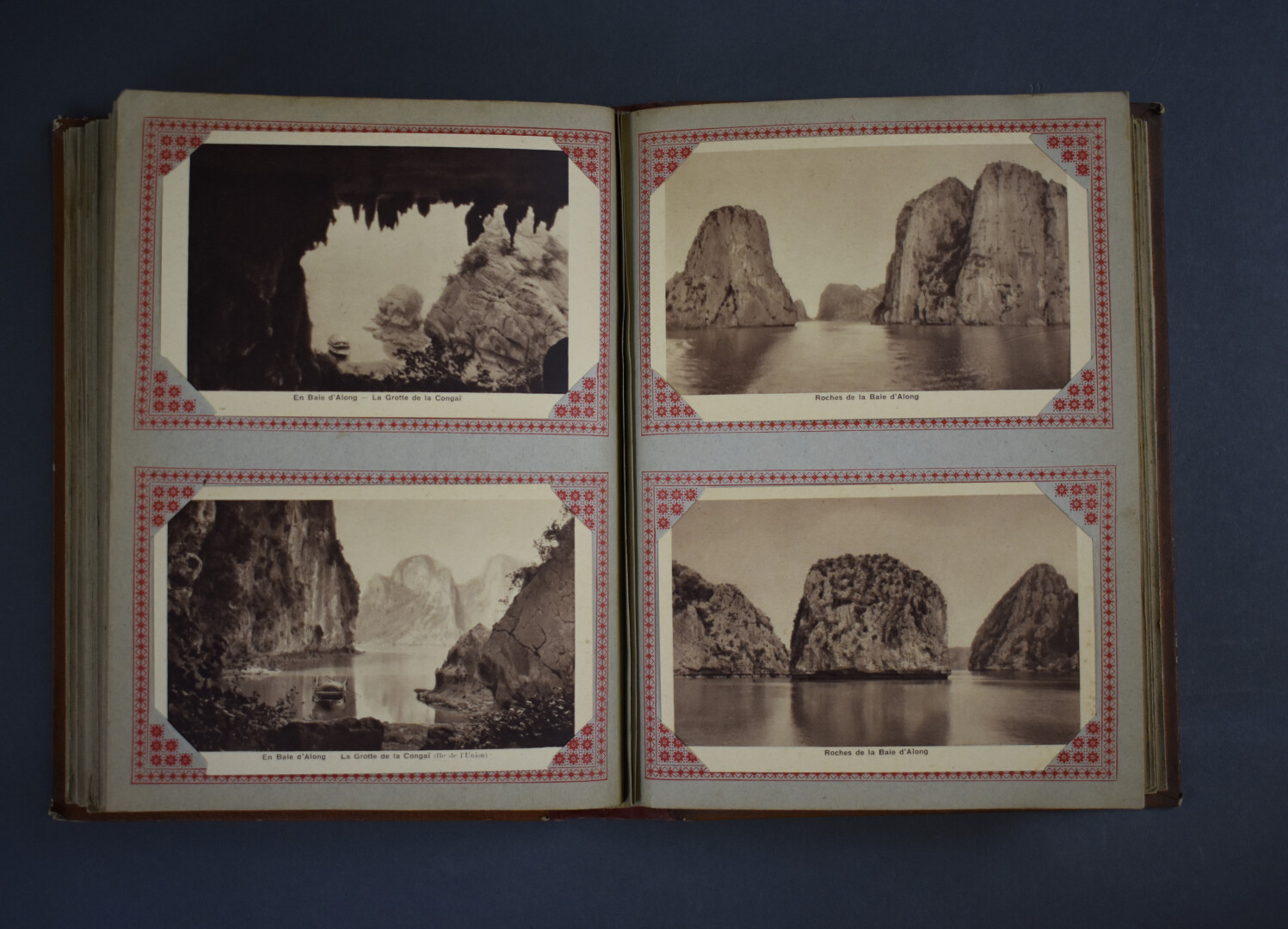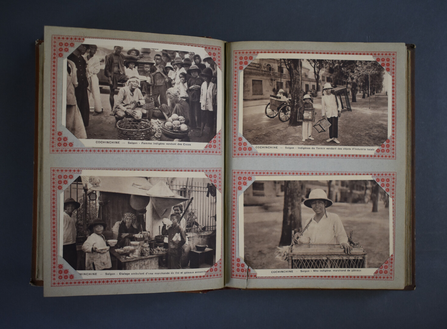 Album de 79 cartes postales Asie, dont Tribues Moïs, chasse au tigre, Cochinchine, Tonkin, baie d’Along, Saïgon, etc.