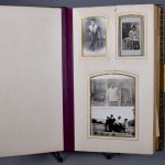 Album photo garni de cuir vert à décor appliqué de métal d’une fleur émaillée (quelques pages abîmées). 34 x 24 cm.