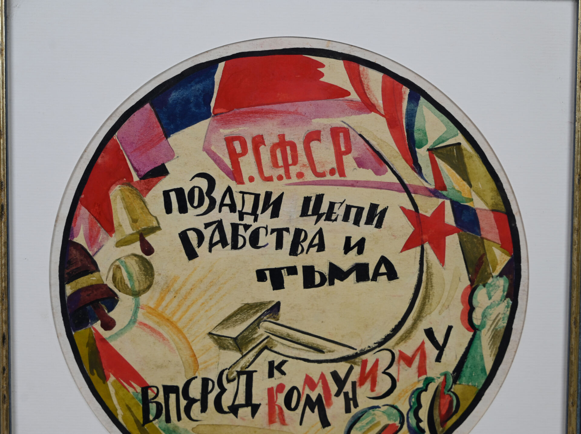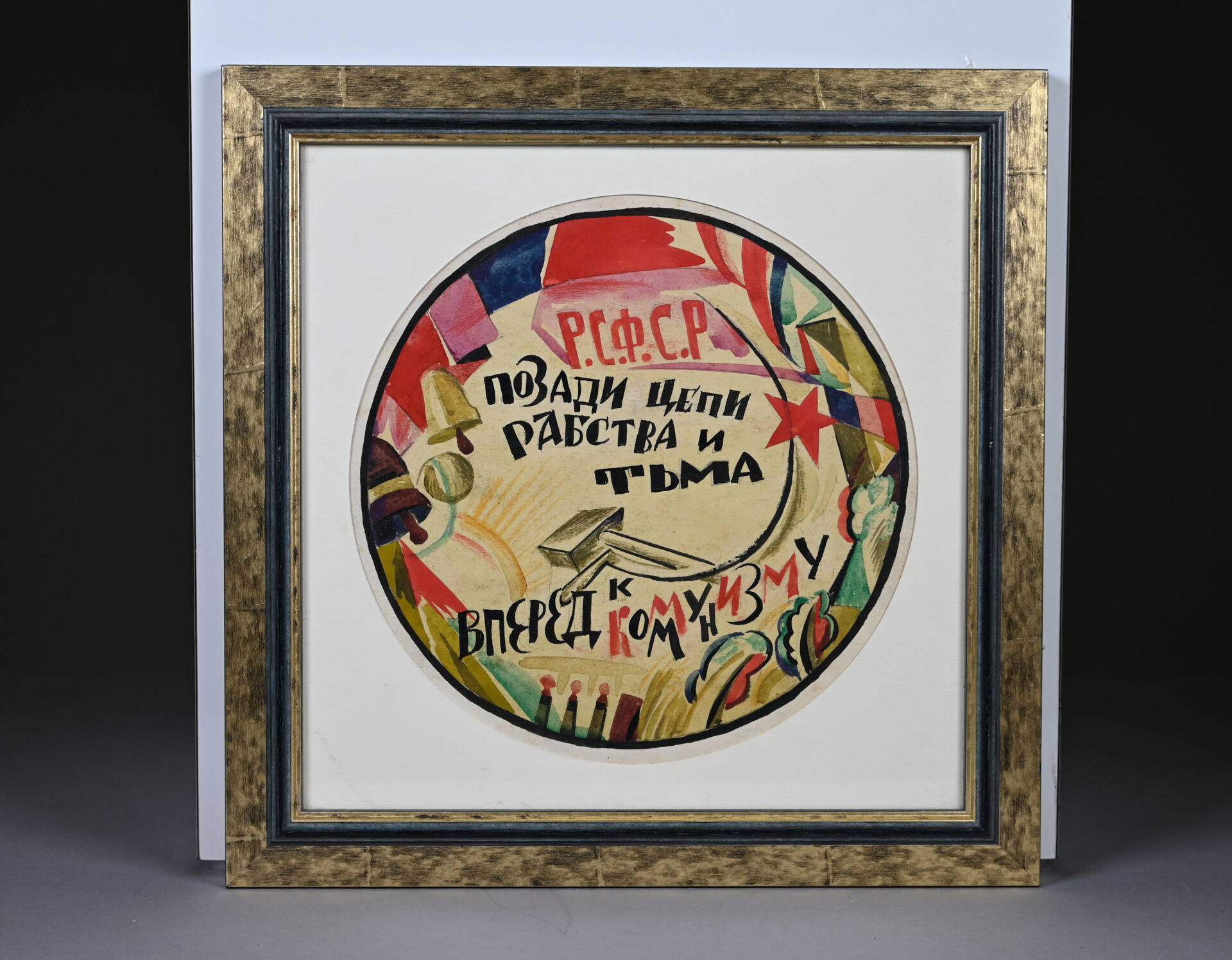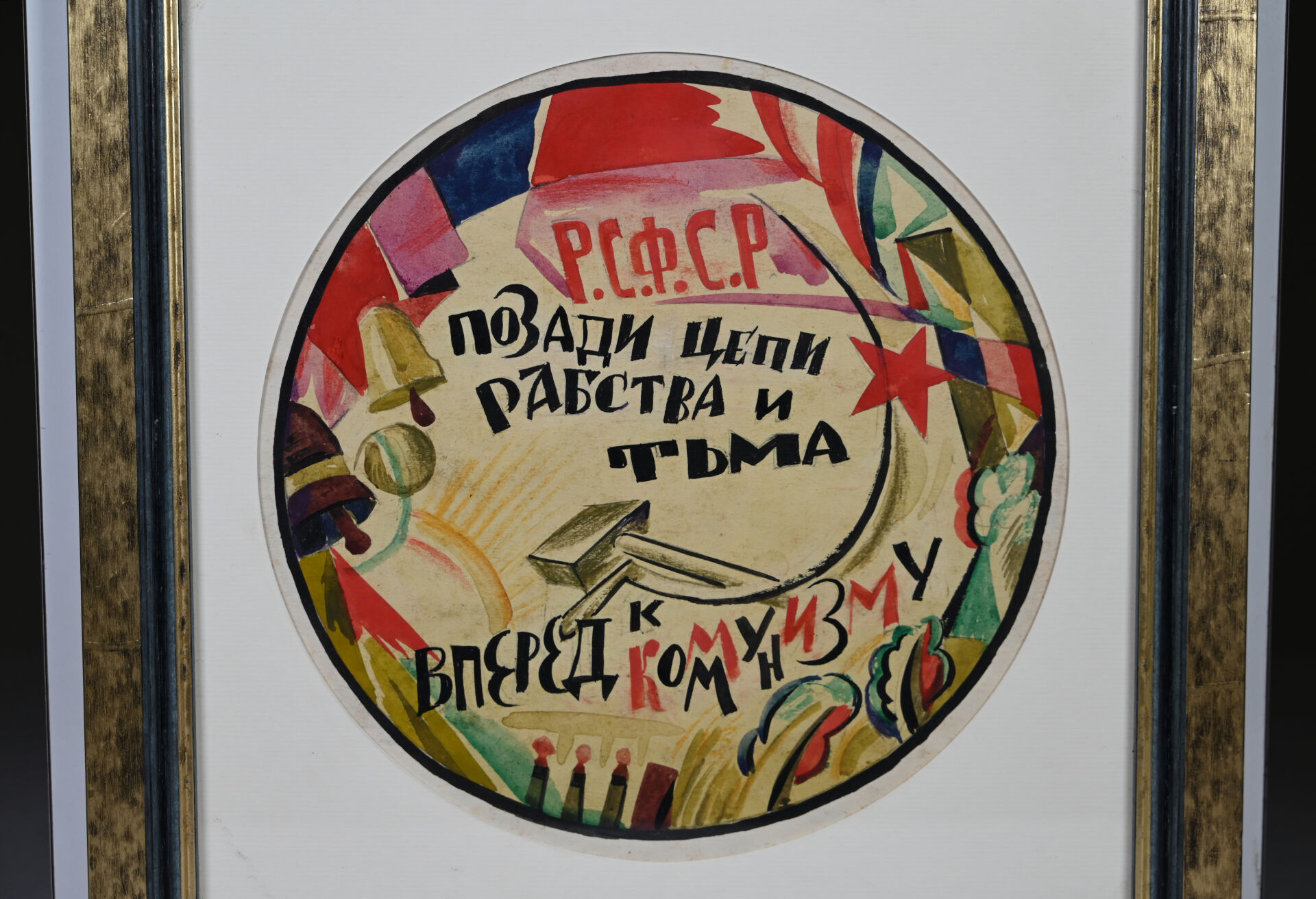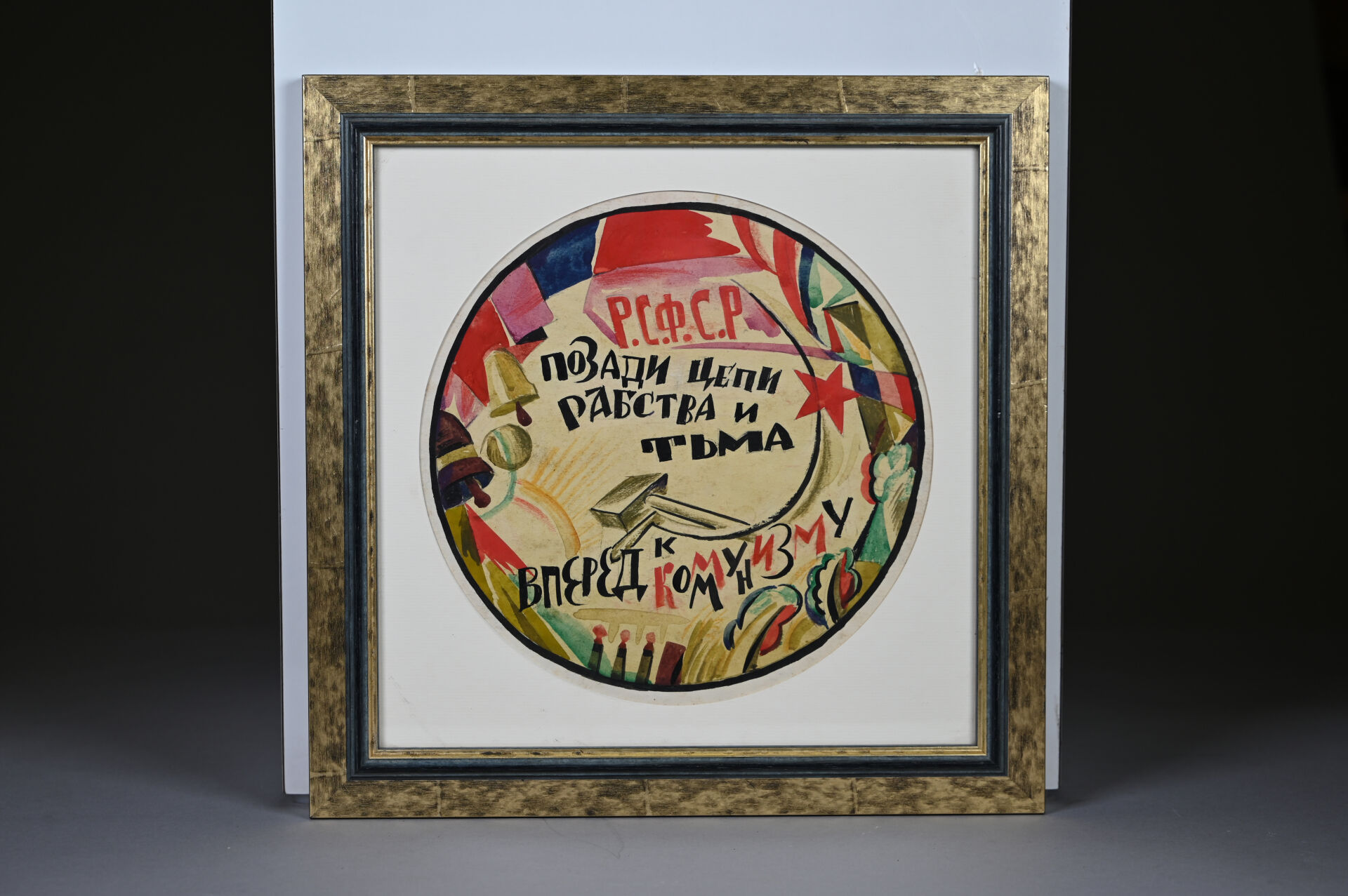 Alexandr SAIENKO (1899-1985). Projet d’assiette aux cloches. Dessin à vue circulaire à la gouache et au fusain. Avec tampon au dos. Diam. : 22 cm.