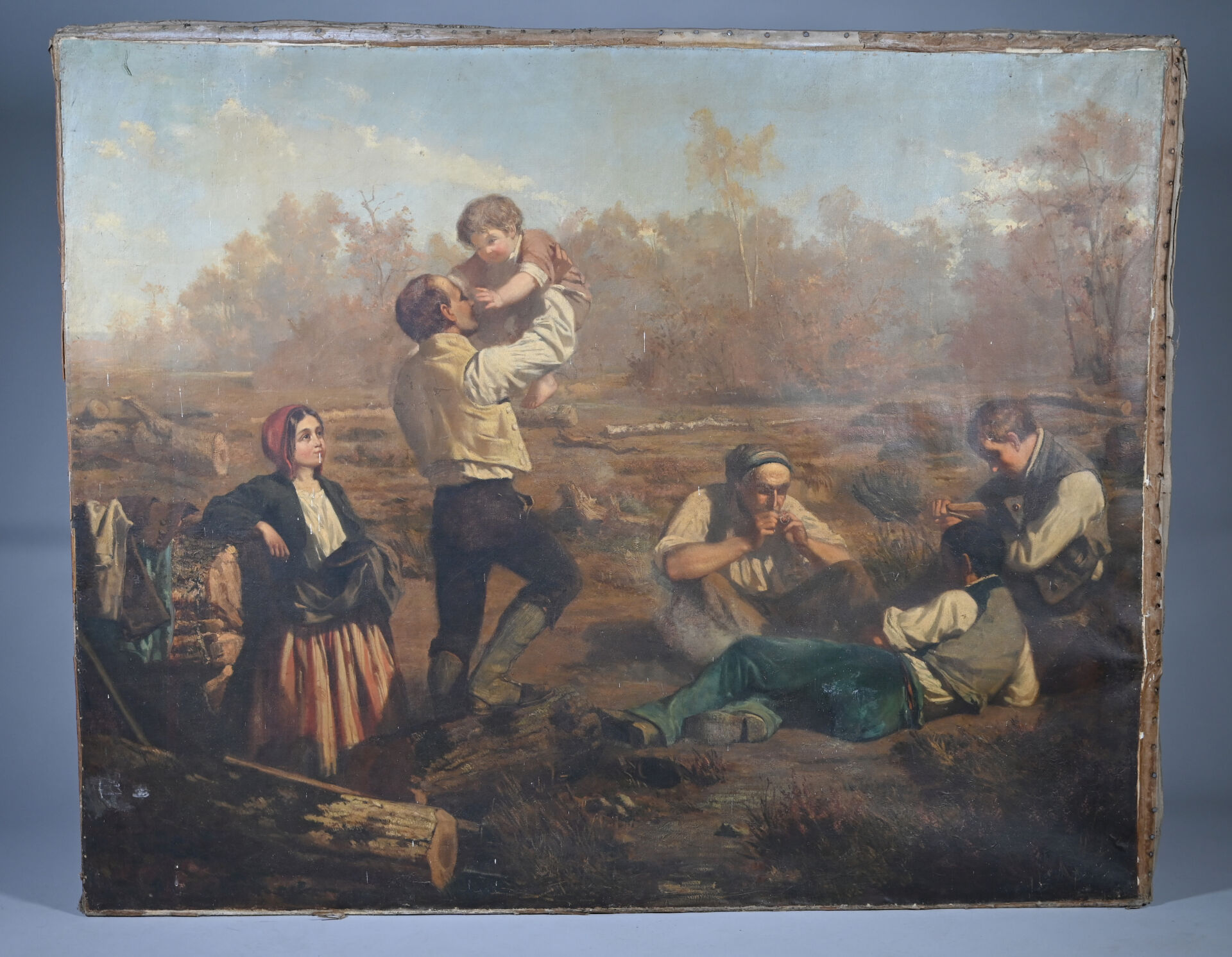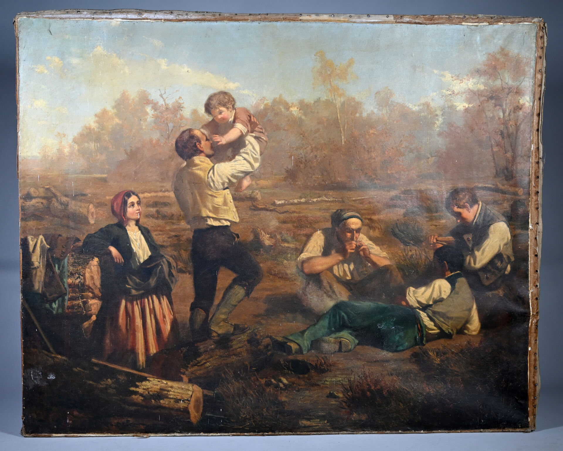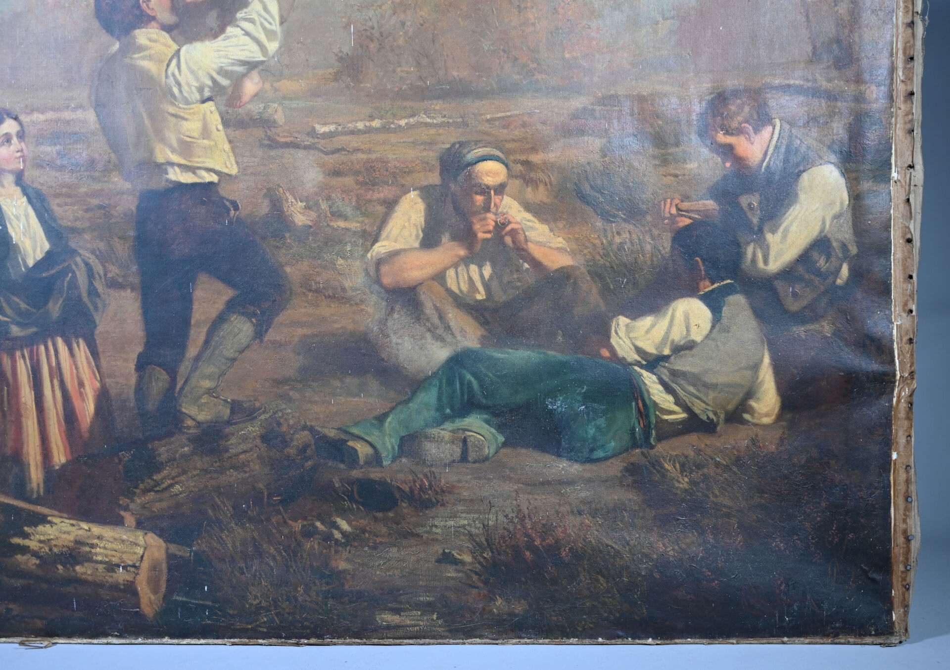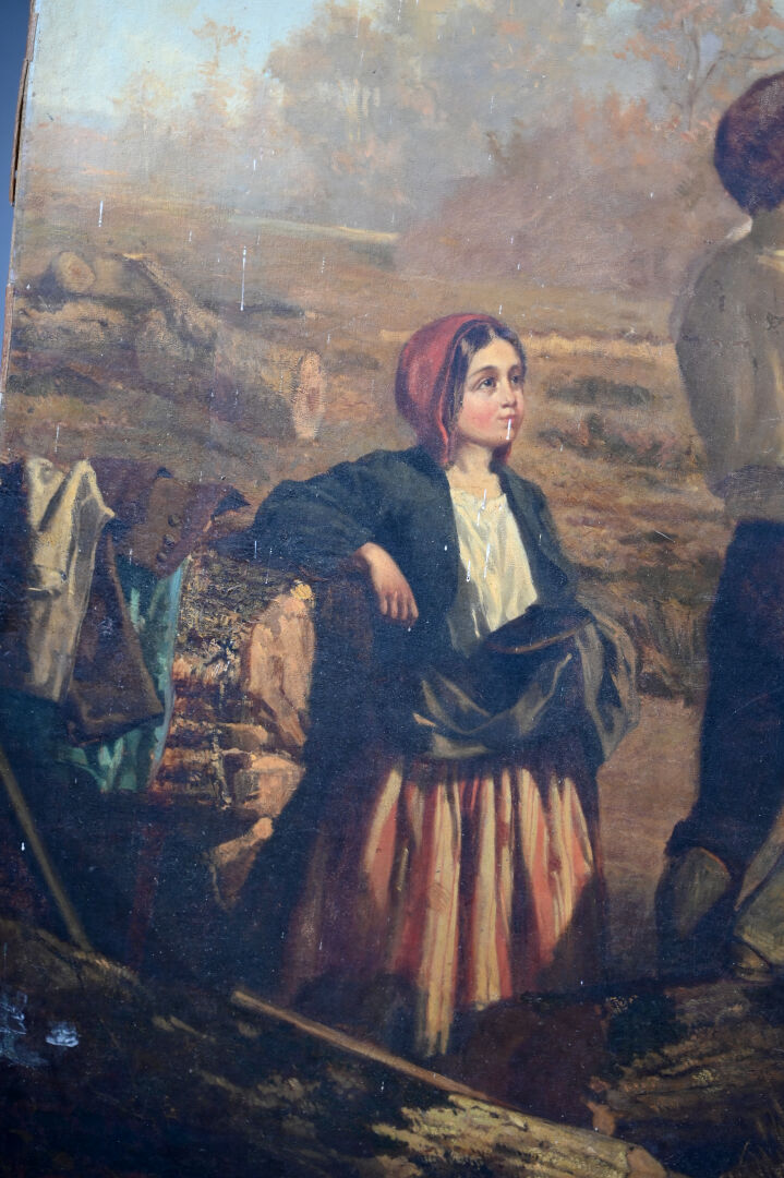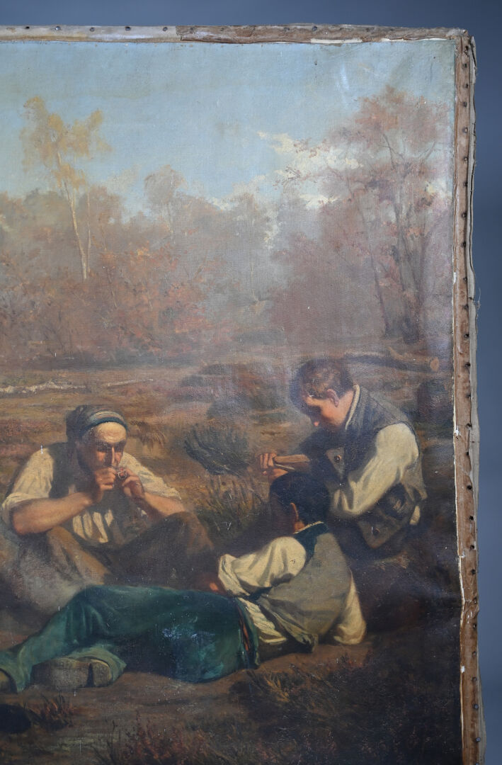 Alexandre PROTAIS (1826-1890) Le repos des bucherons. Huile sur toile signée en bas à droite Toile lâche, taches, manquent des clous, en partie désolidarisé du châssis). 129 x 159 cm.
