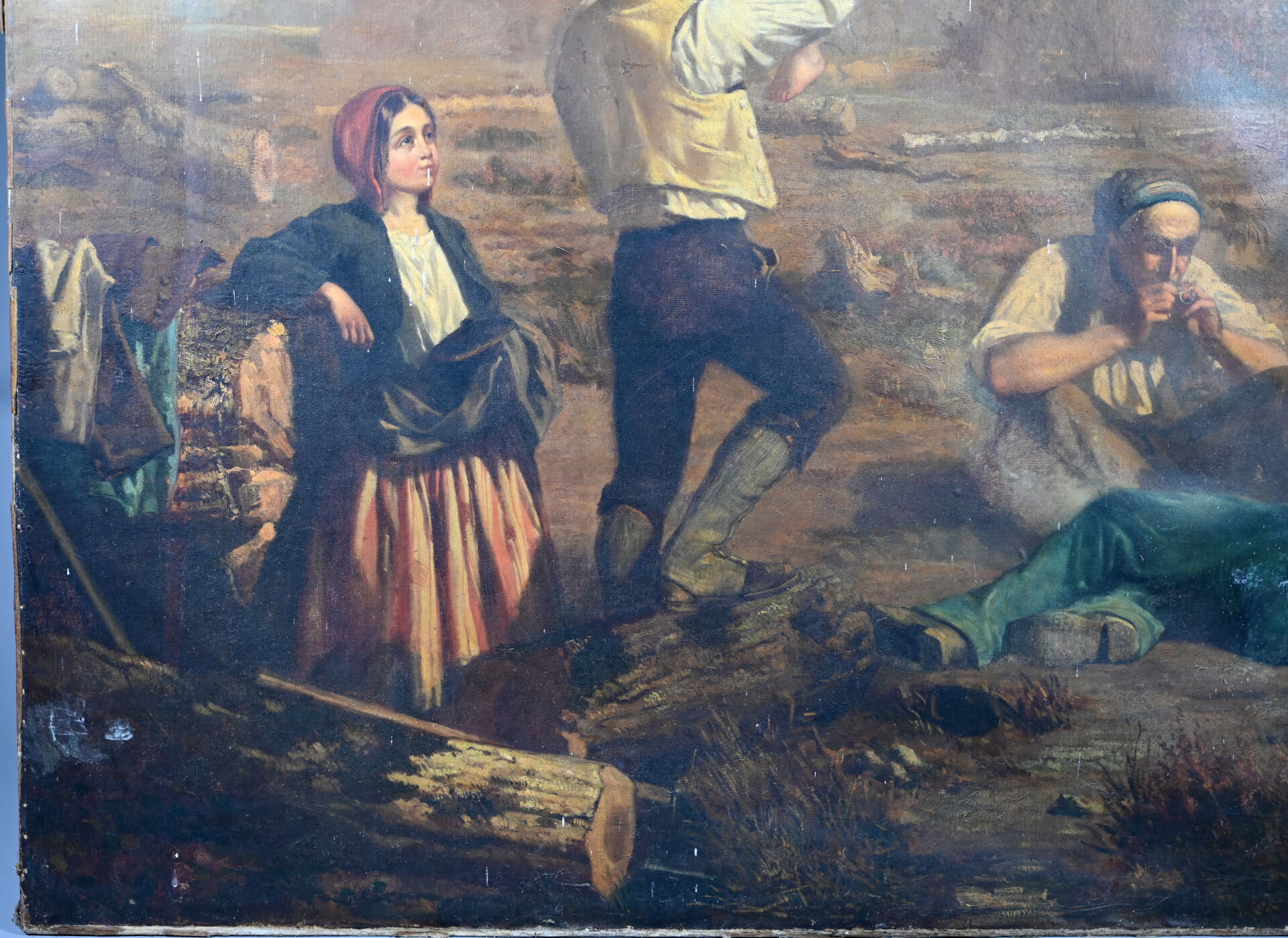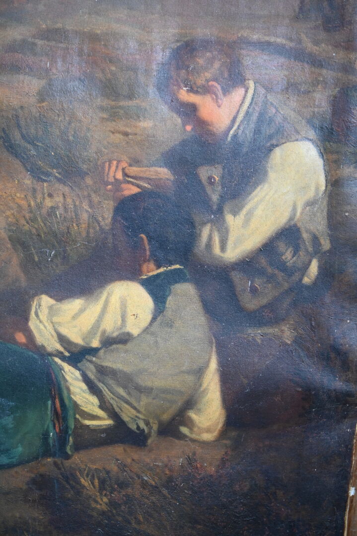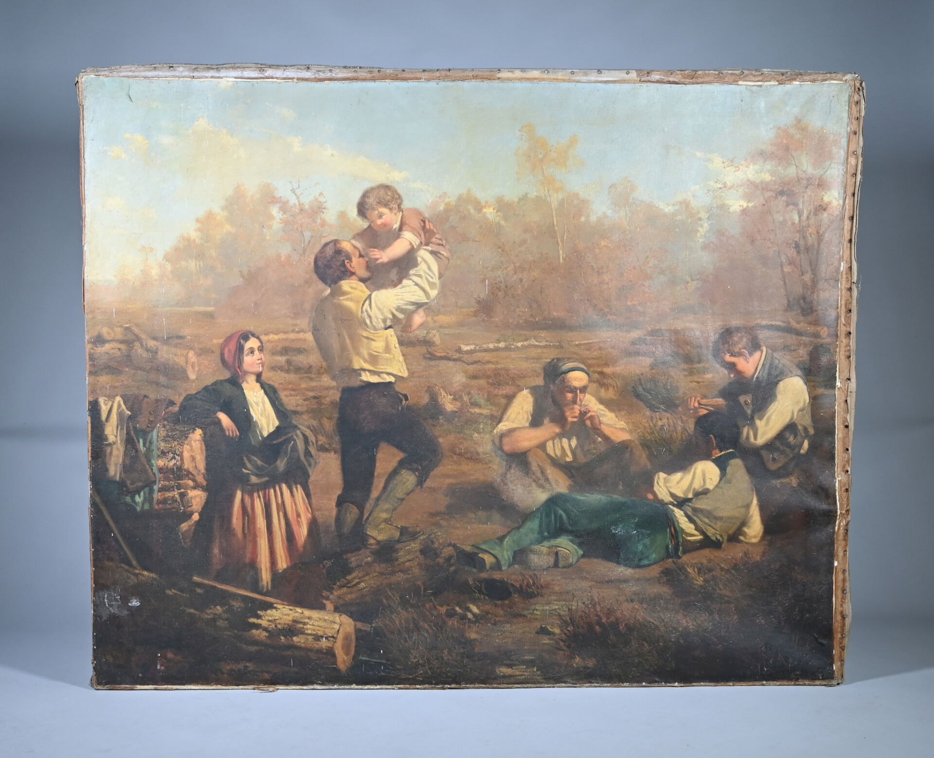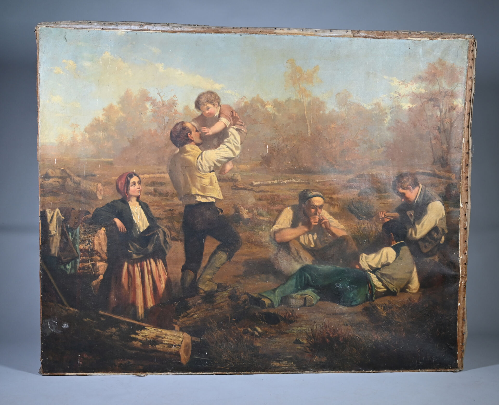 Alexandre PROTAIS (1826-1890) Le repos des bucherons. Huile sur toile signée en bas à droite Toile lâche, taches, manquent des clous, en partie désolidarisé du châssis). 129 x 159 cm.