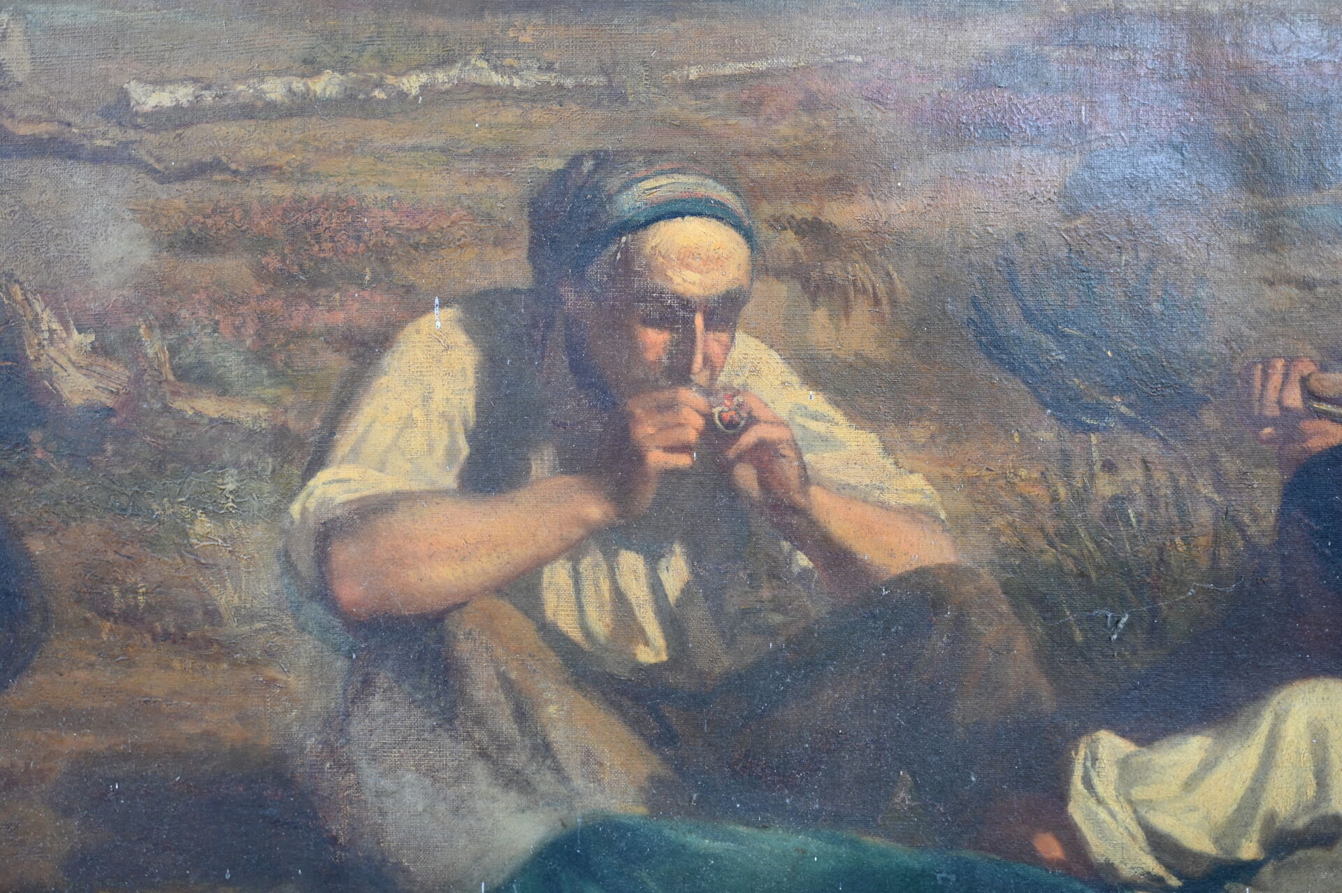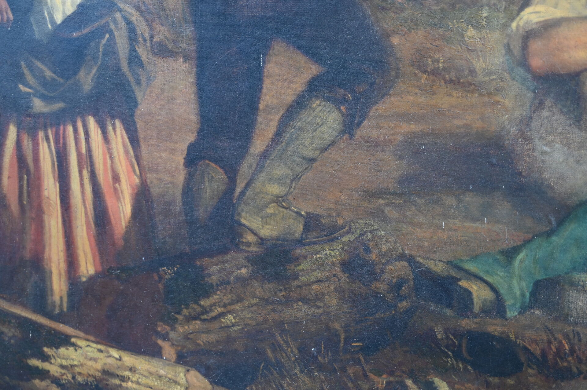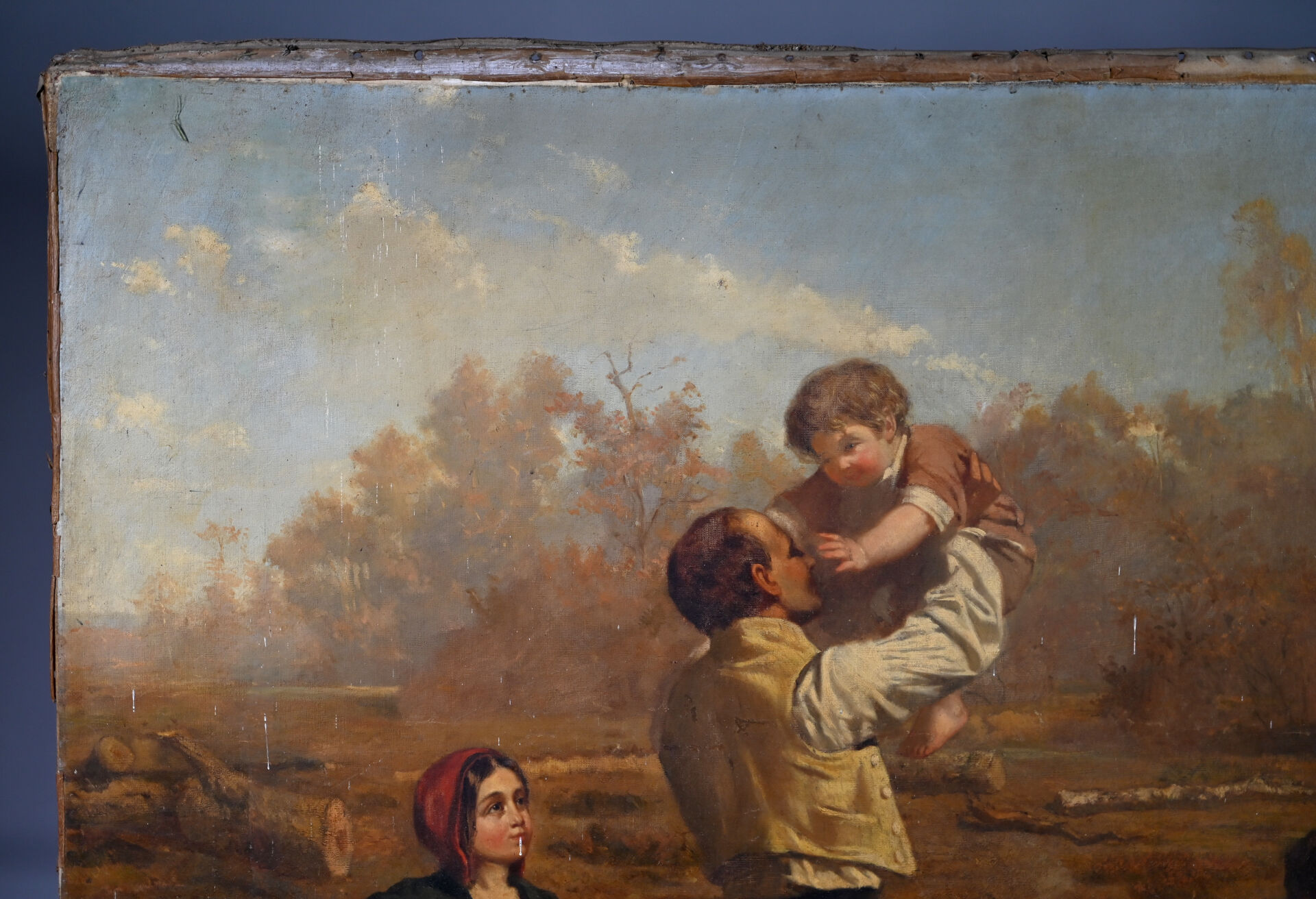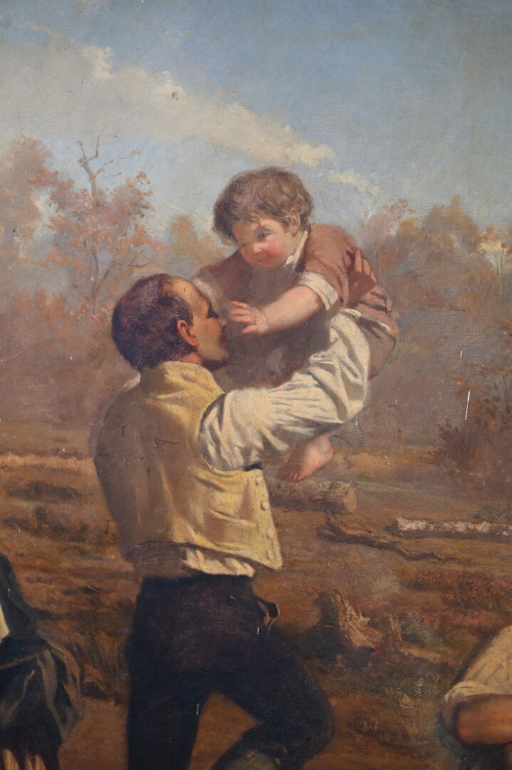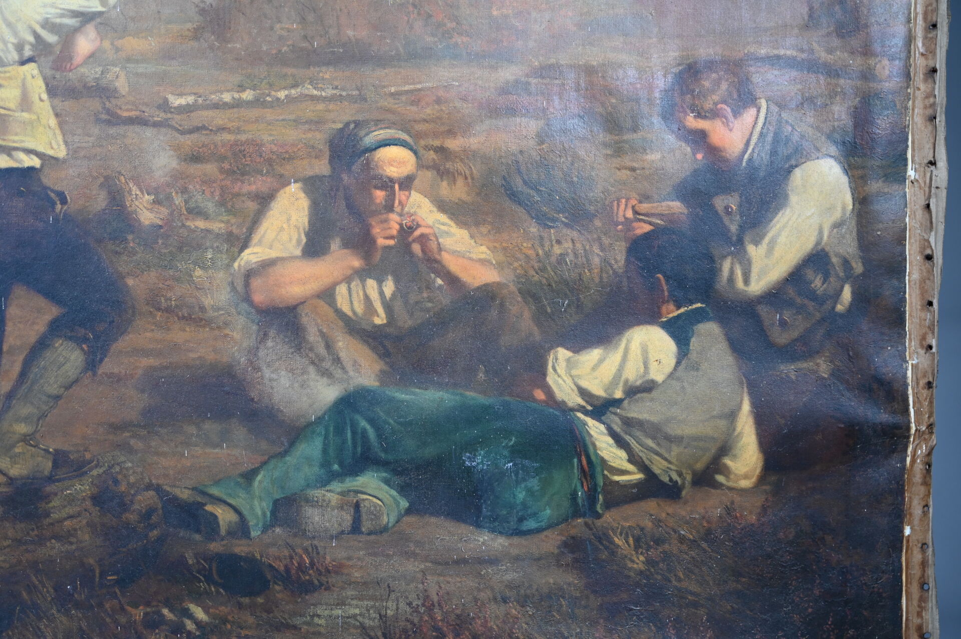 Alexandre PROTAIS (1826-1890) Le repos des bucherons. Huile sur toile signée en bas à droite Toile lâche, taches, manquent des clous, en partie désolidarisé du châssis). 129 x 159 cm.