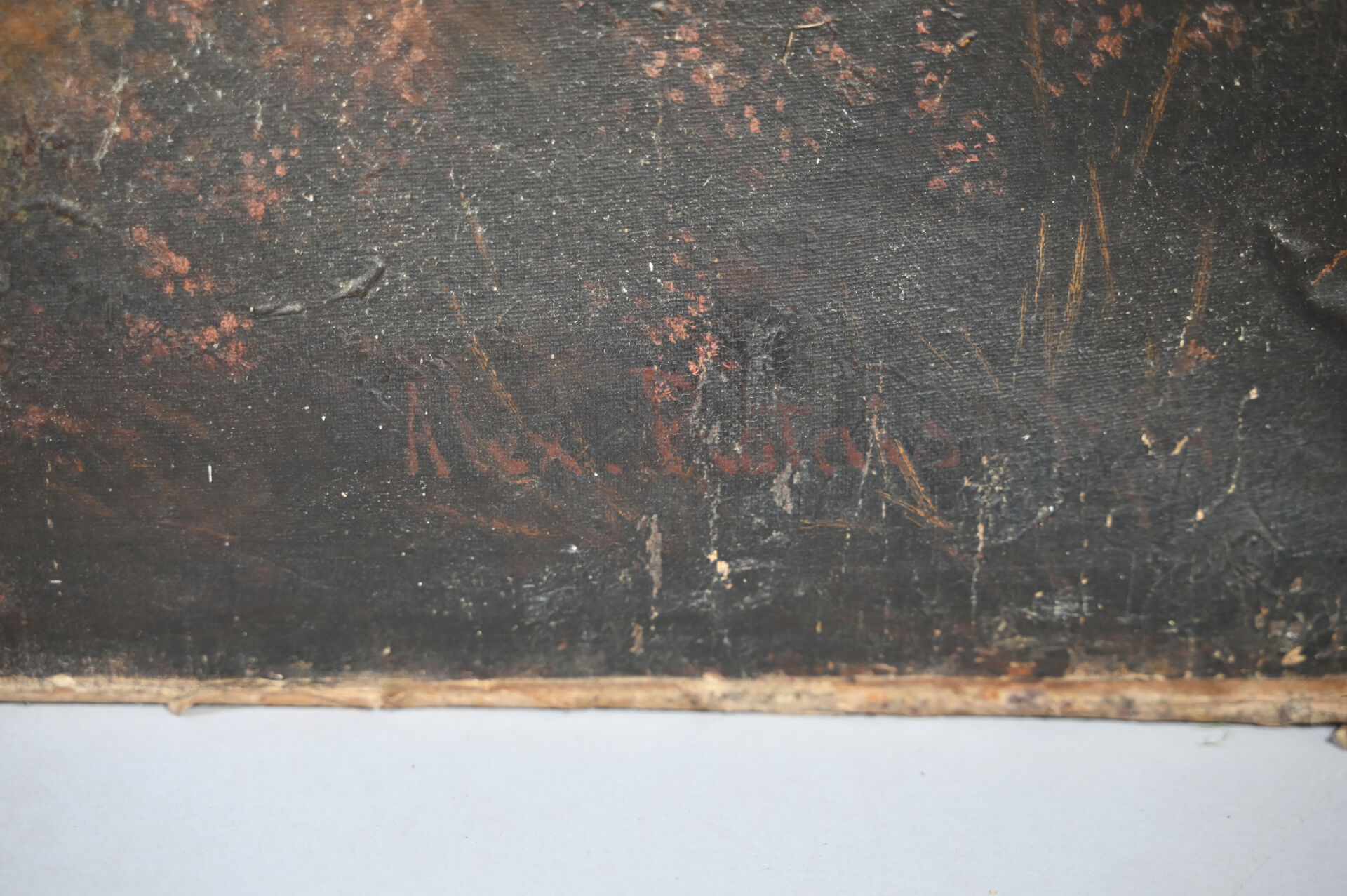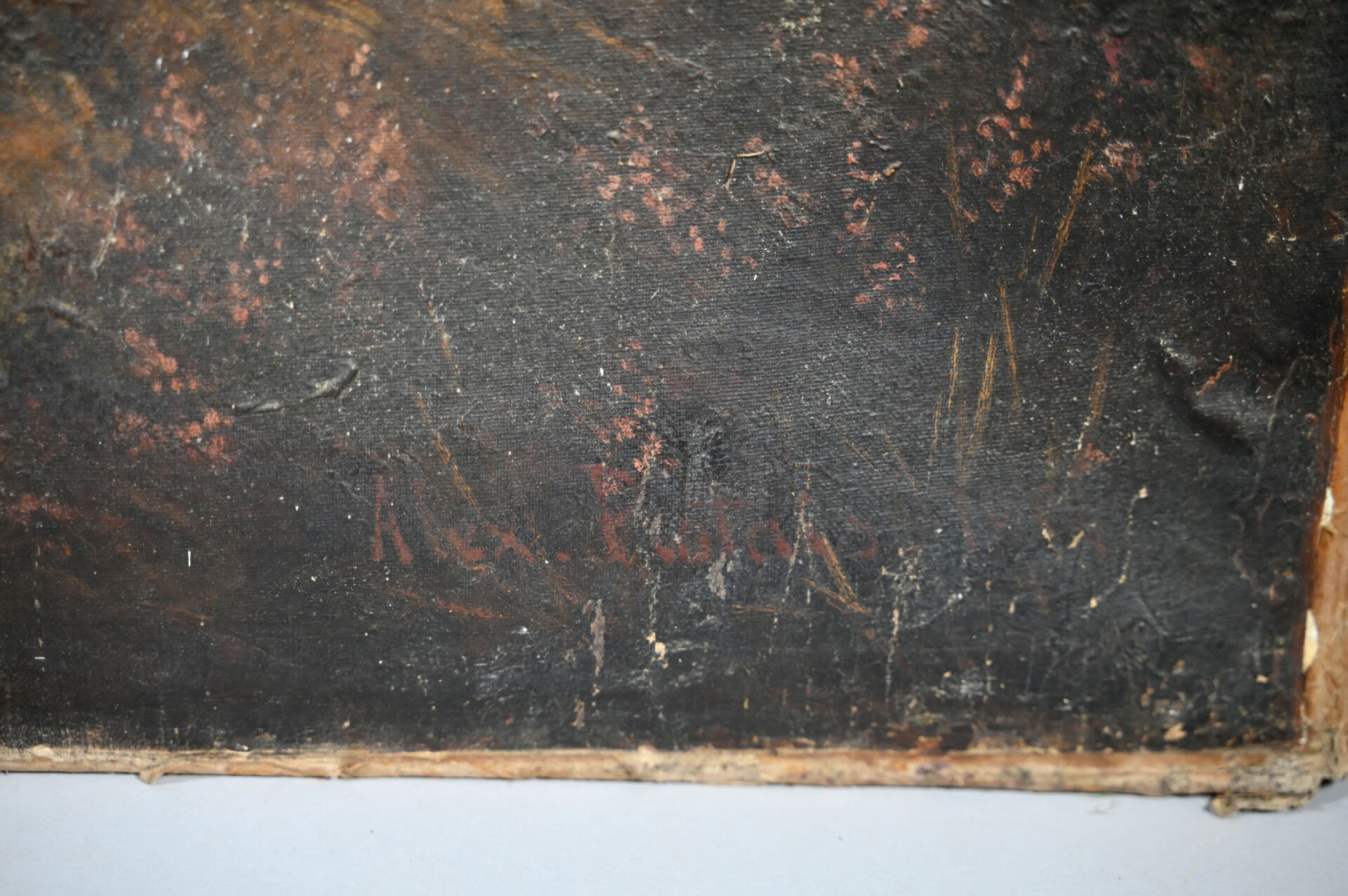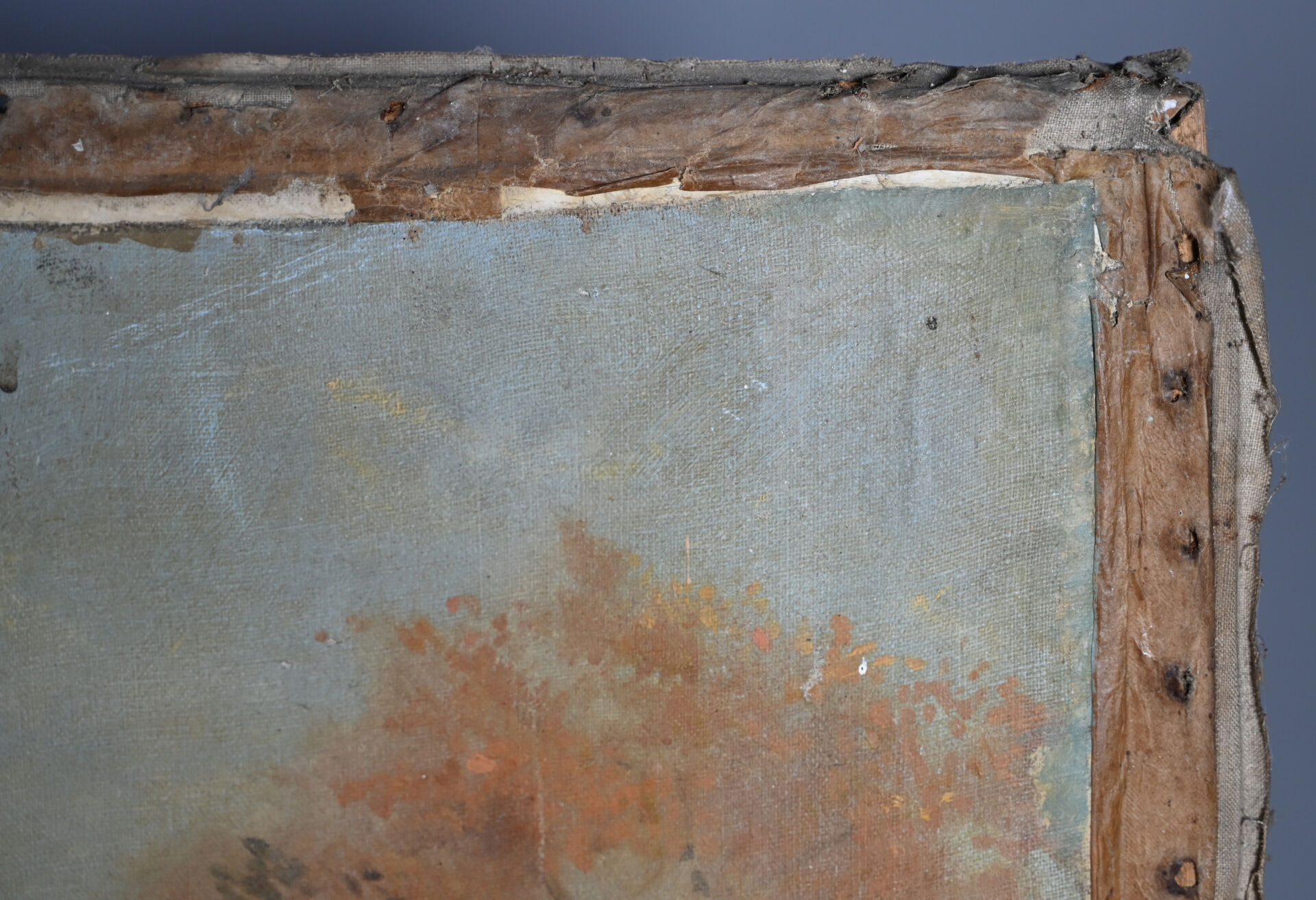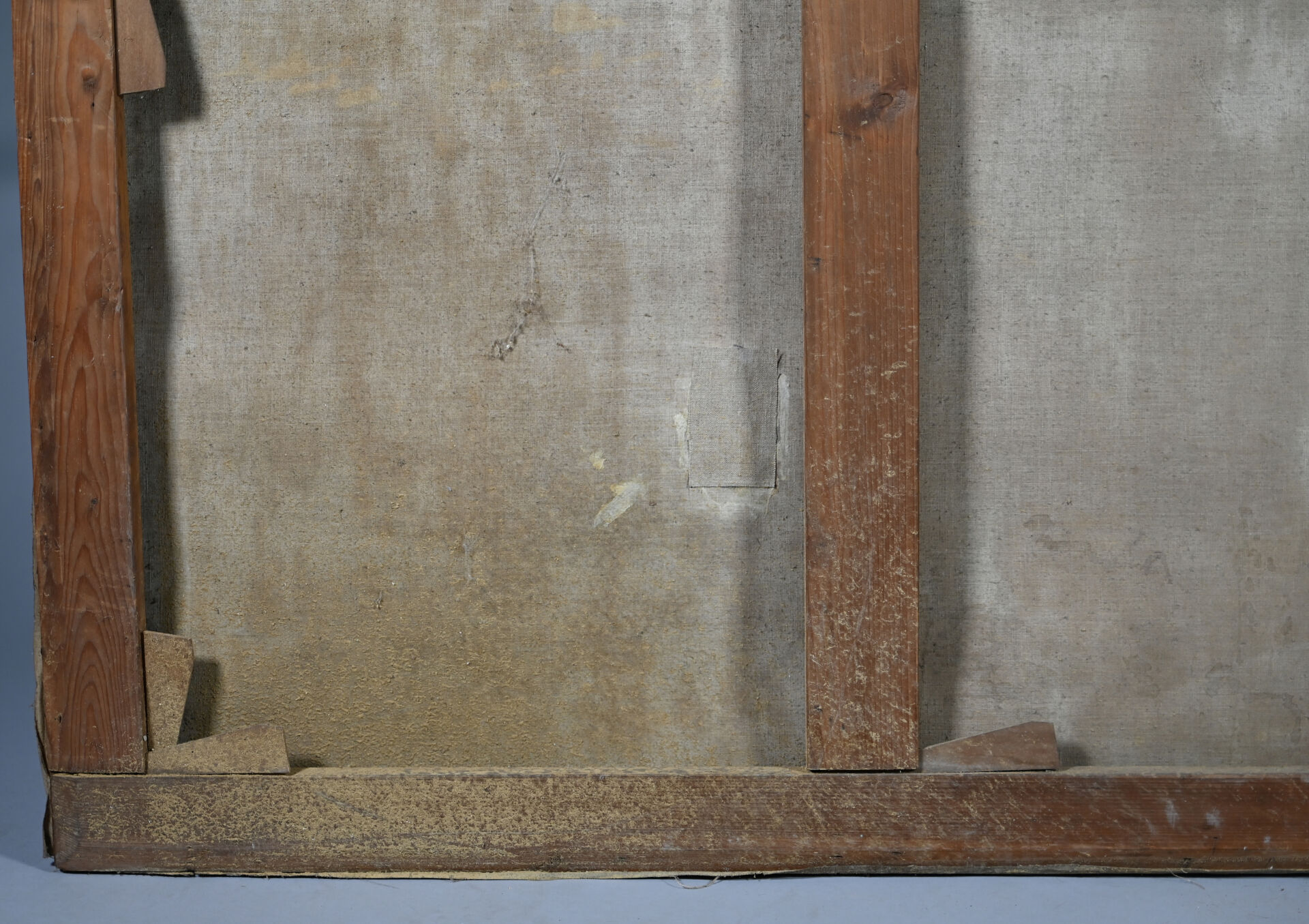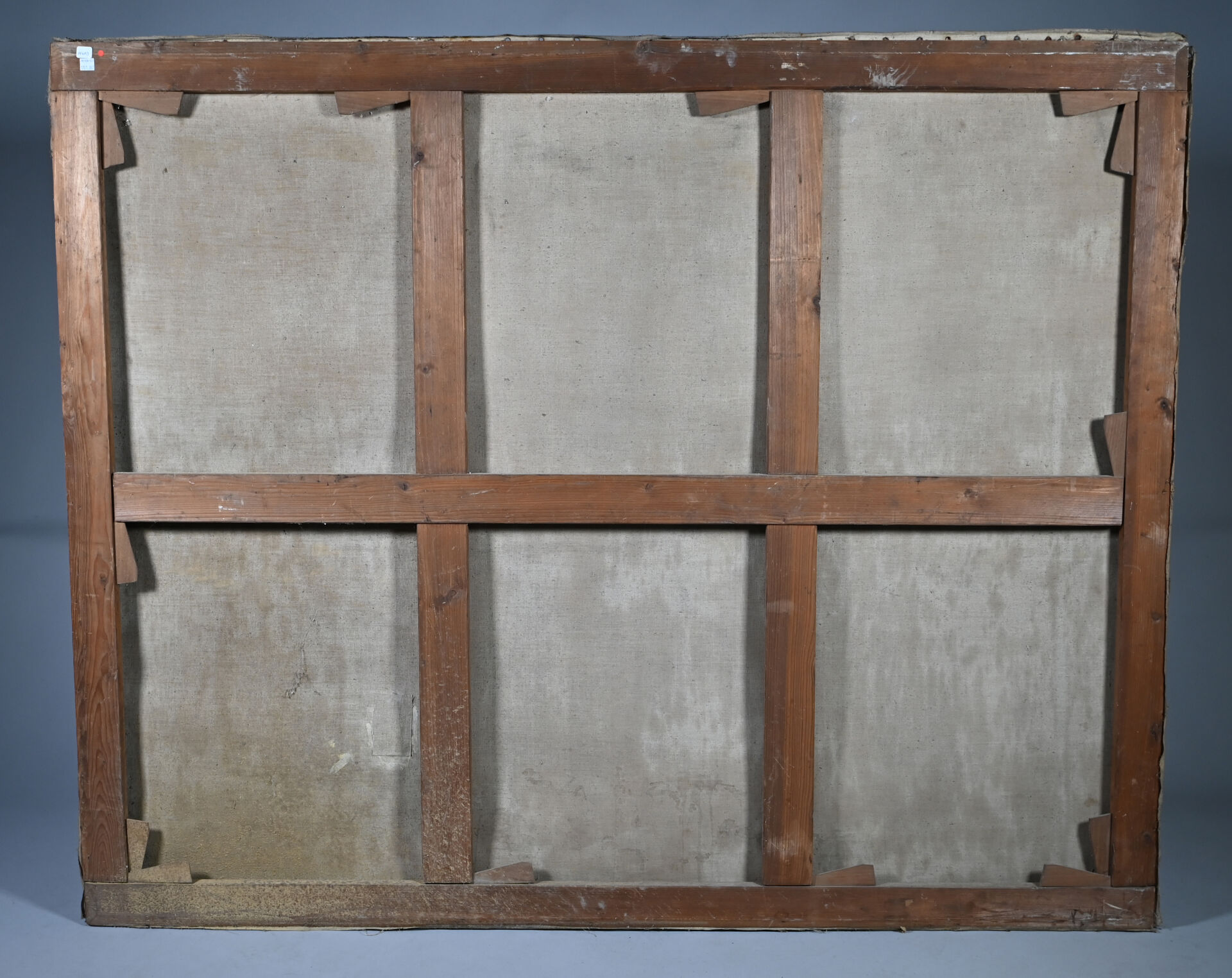 Toile lâche, taches, manquent des clous, en partie désolidarisé du châssis).