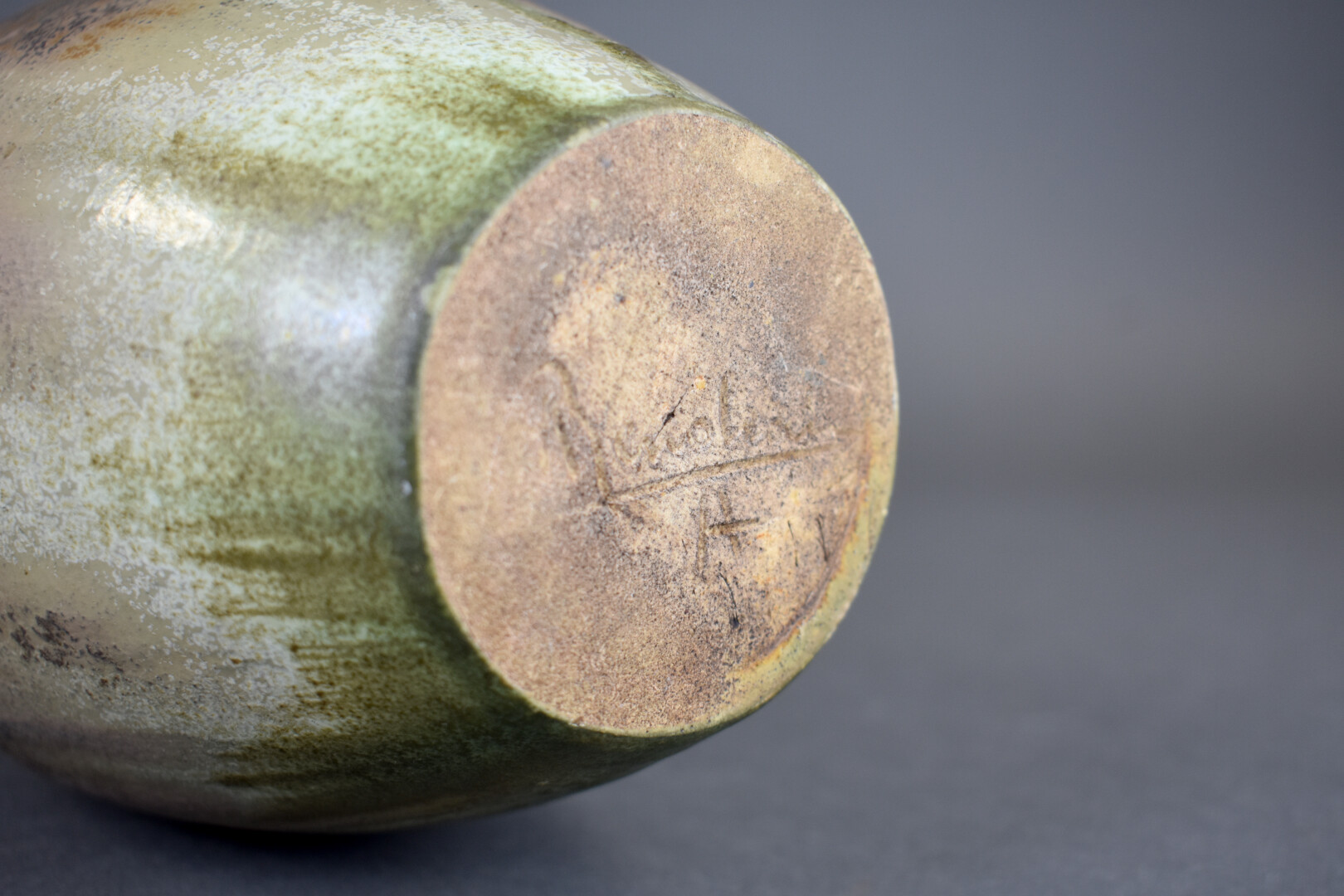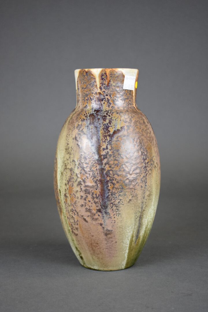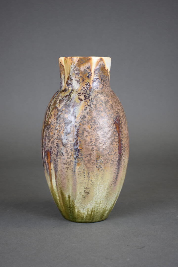 Alfred RENOLEAU (1854-1930). Vase ovoïde à col resseré en grès émaillé à coulures beiges et bordeau. Signé à la pointe au dessous. Vers 1900. Haut. : 25 cm.