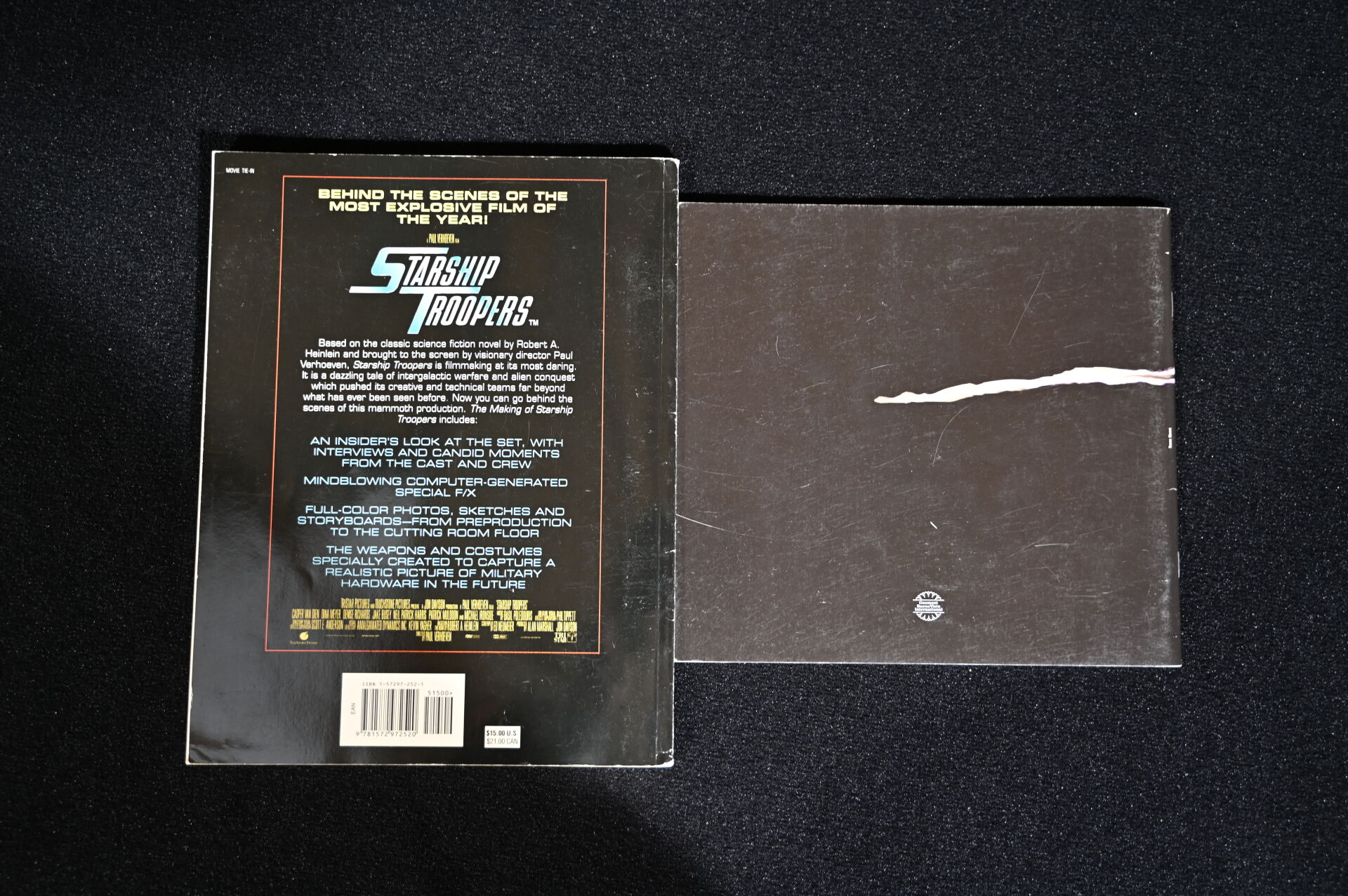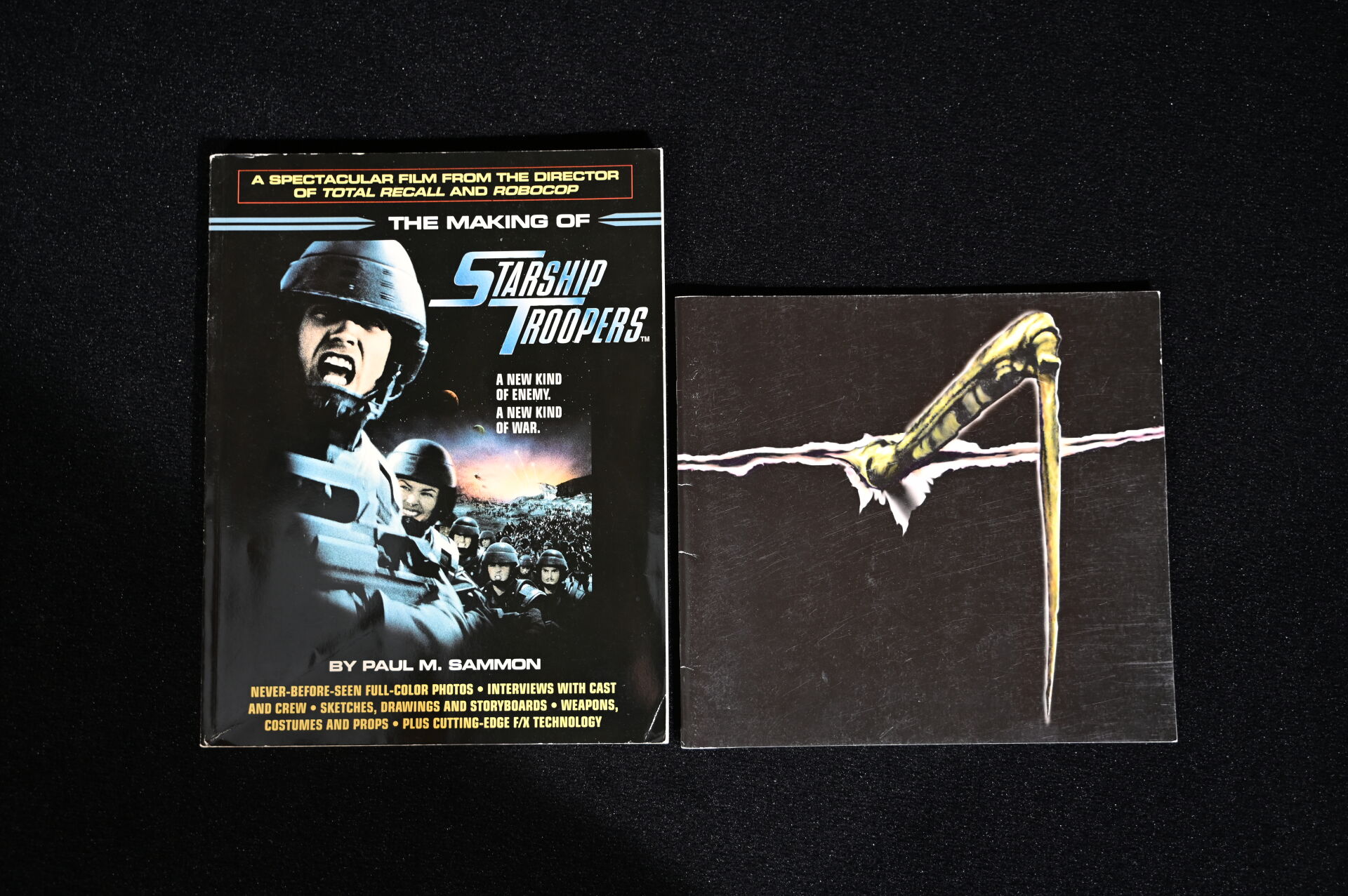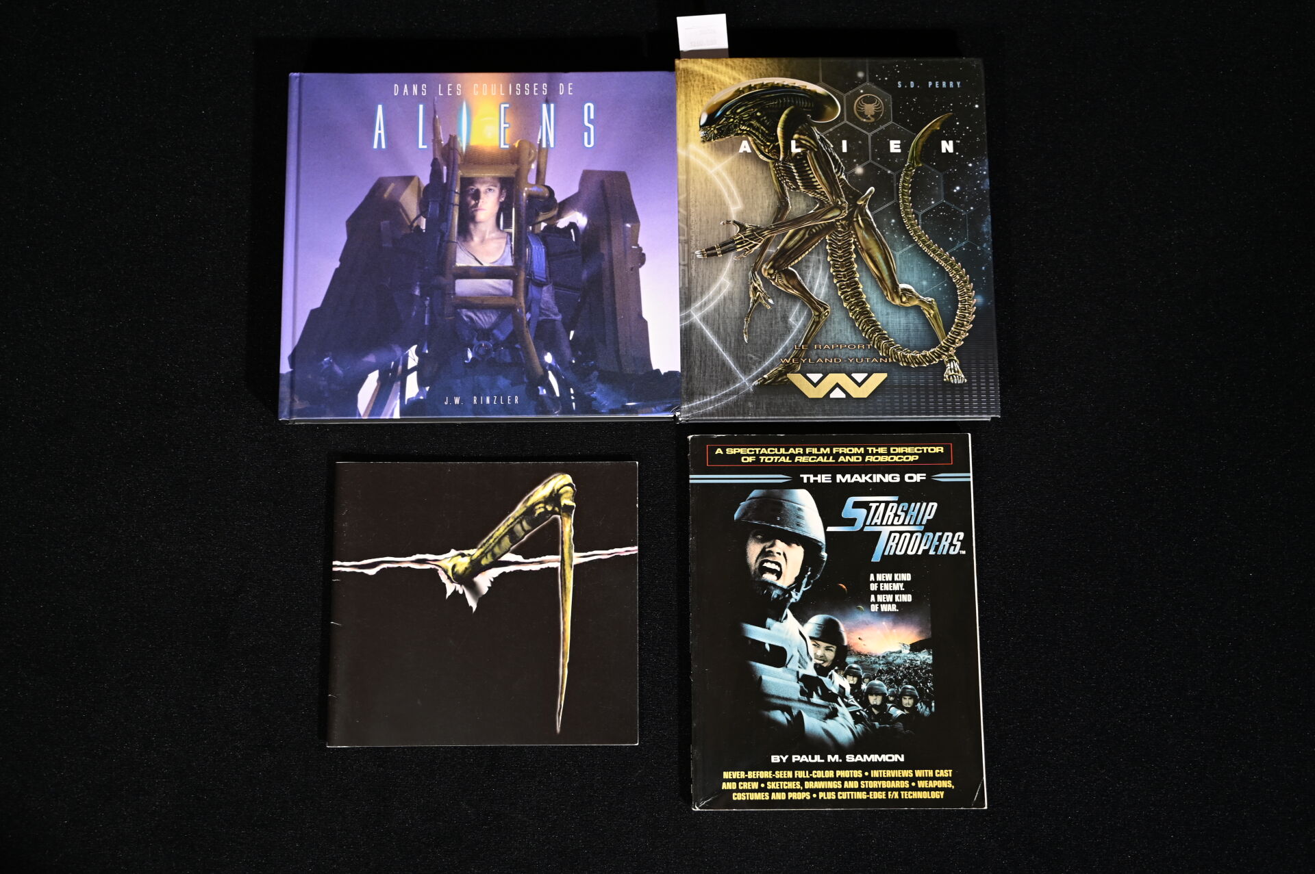 ALIEN. Ensemble de deux ouvrages dont « Dans les coulisses de Aliens » de J.W. Rinzler Huginn & Muninn, 2020 et « Alien – Le rapport Weyland-Yutani » de S.D. Perry Huginn & Muninn, 2014. On joint des images et stickers liés au film, et un ouvrage STARSHIP TROOPERS.