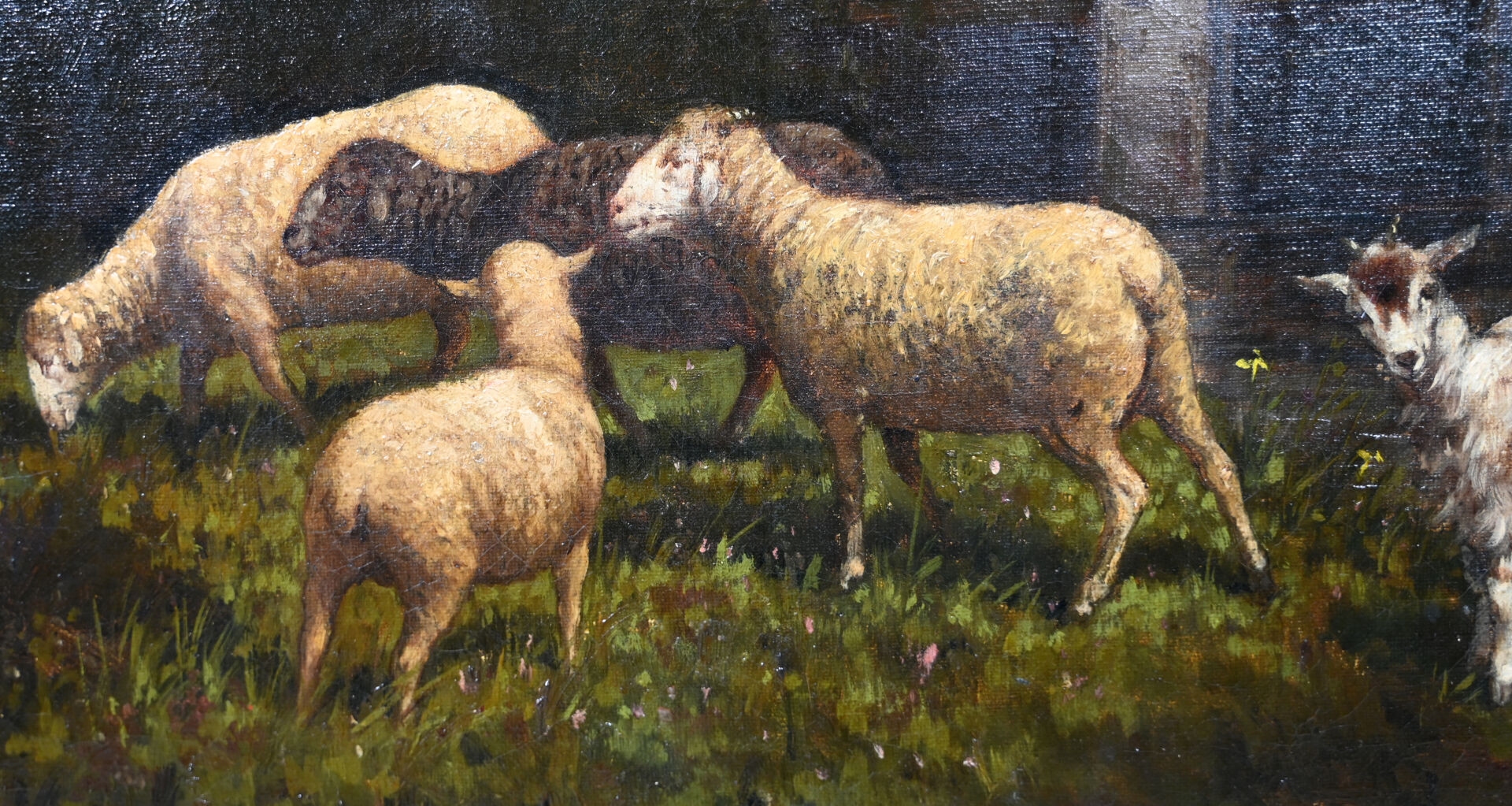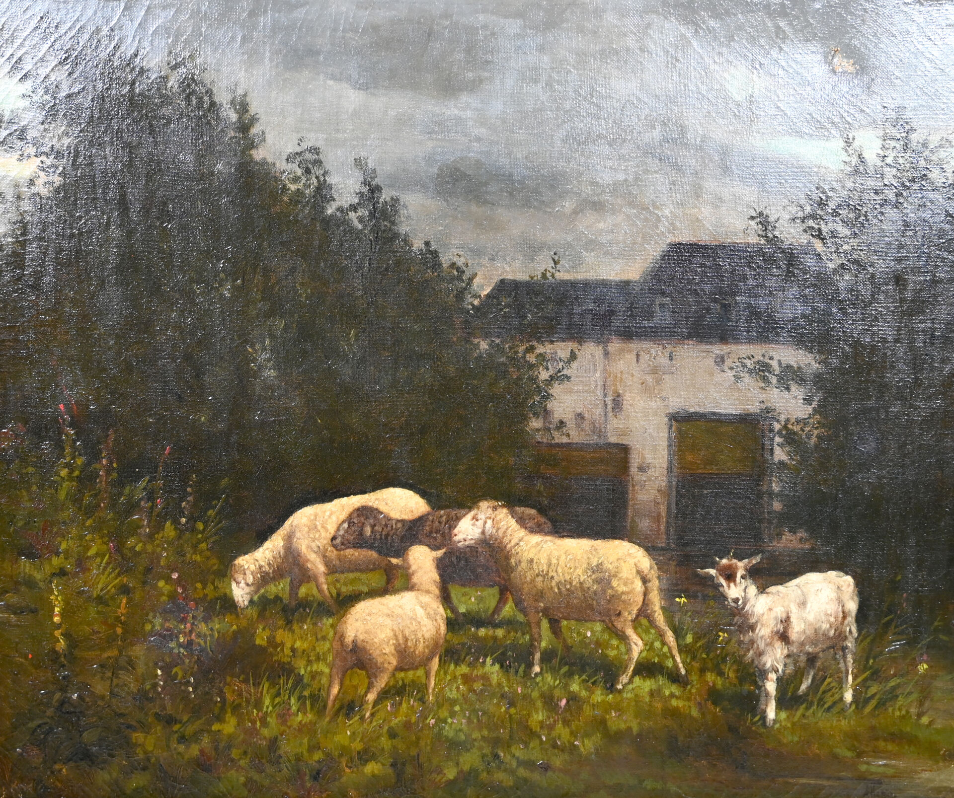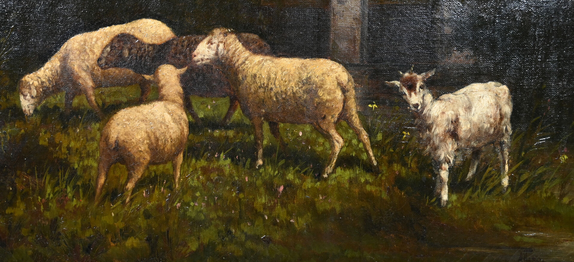 ALLARD ( XIXe-XXe). Les moutons. Huile sur toile signée en bas à droite (percée, restaurations). 54,5 x 65 cm.