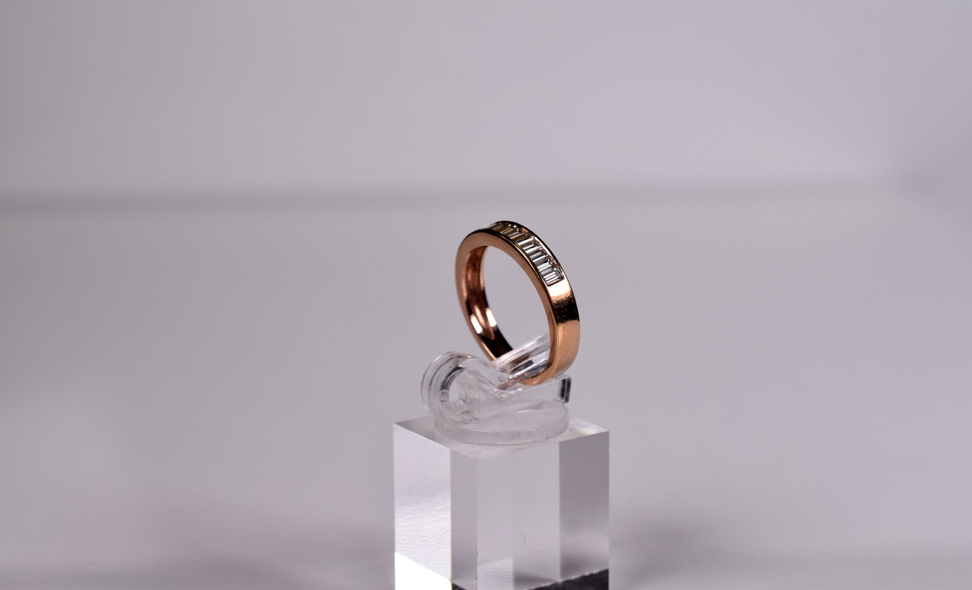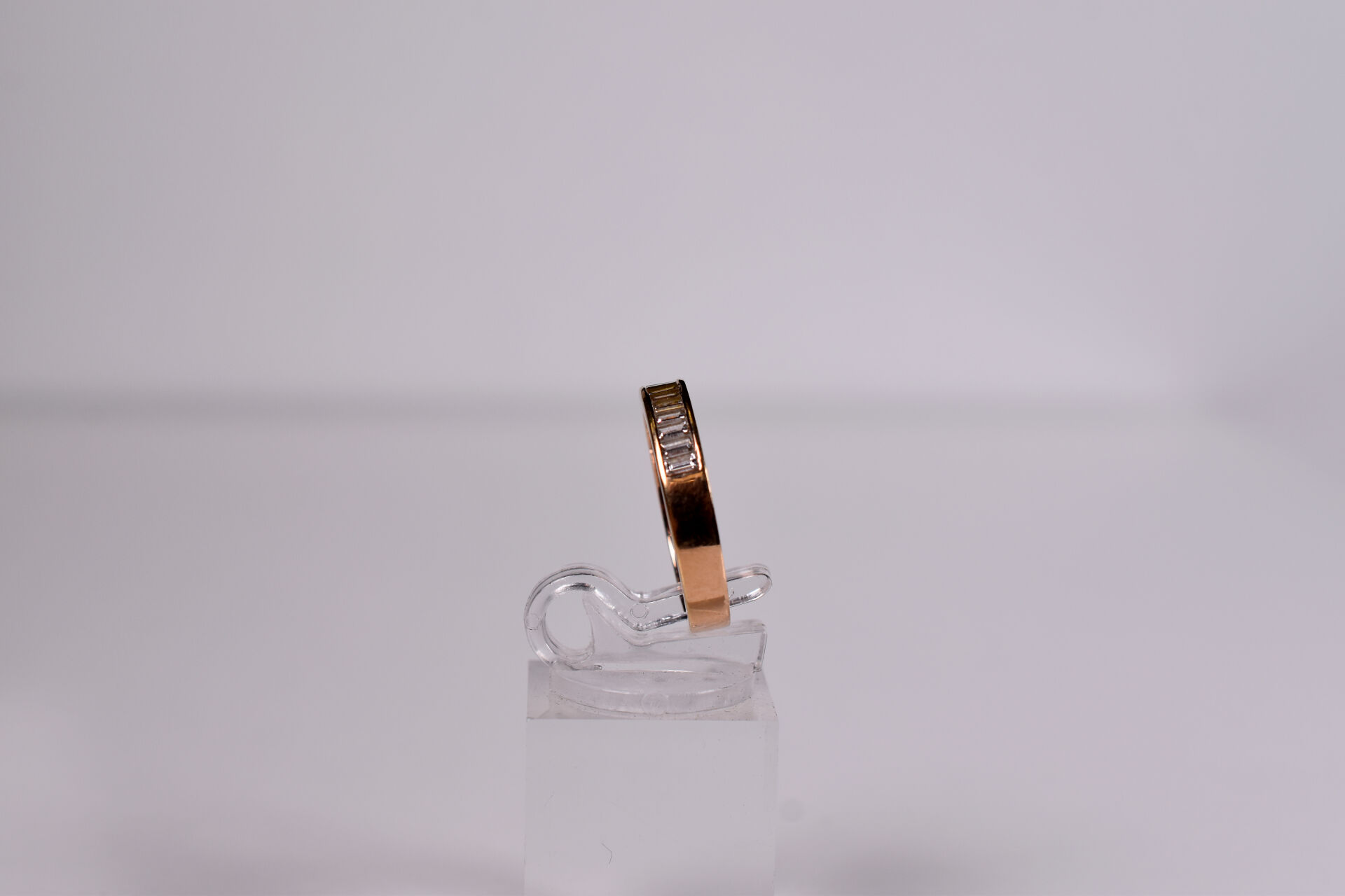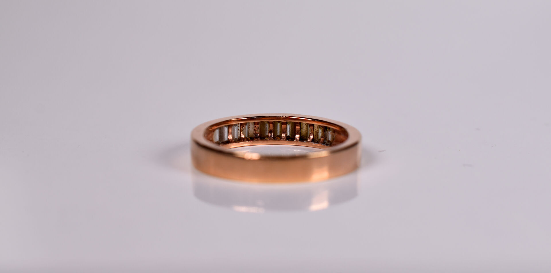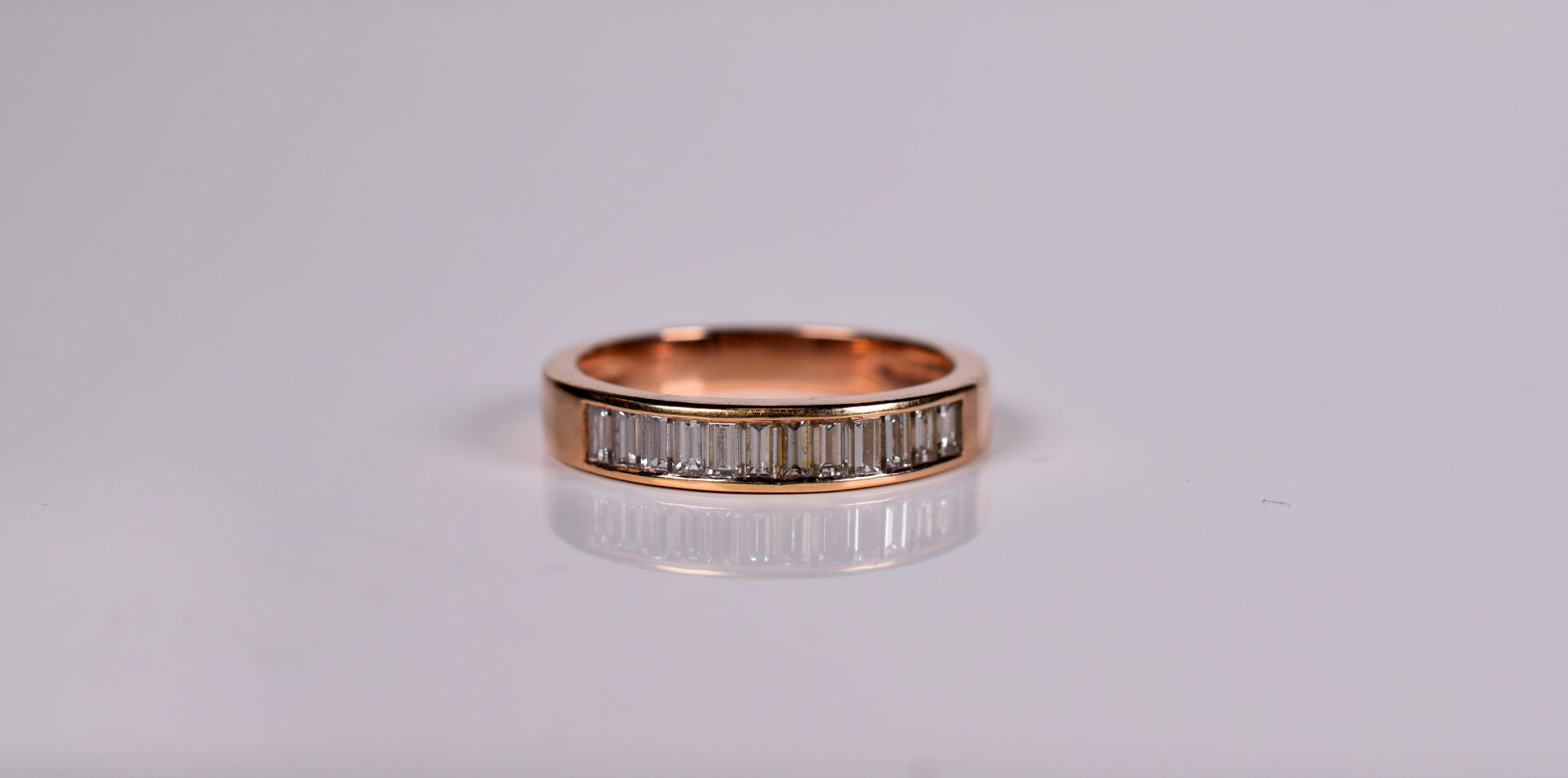 Alliance en or rose 18k 750/1000e sertie de 12 diamants baguettes de 0,05 carat chacun. TDD. : 57. Poids brut. : 4,5g.