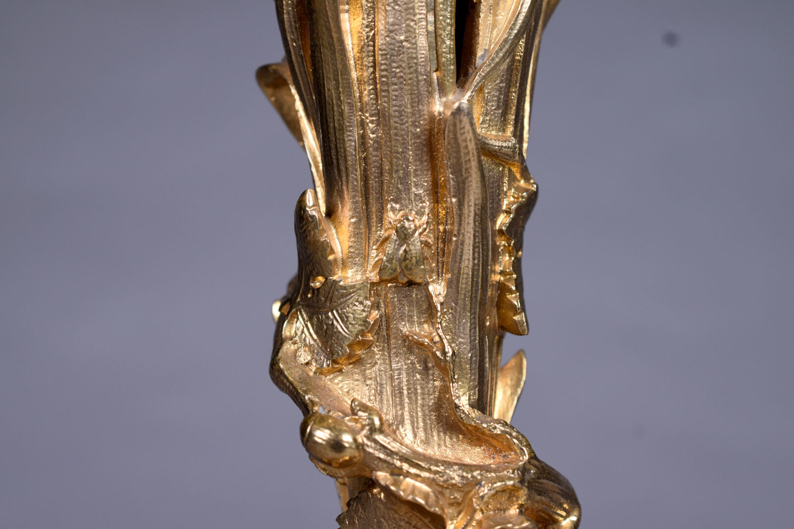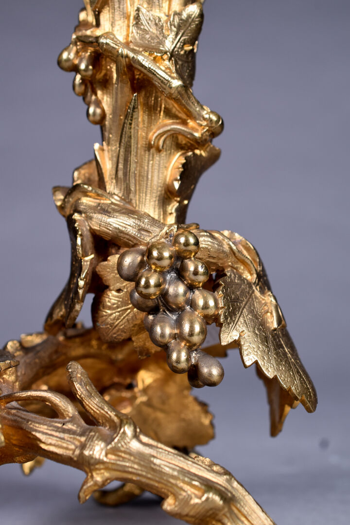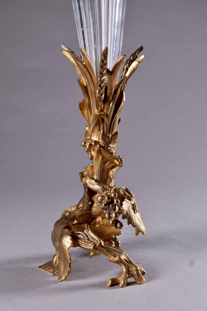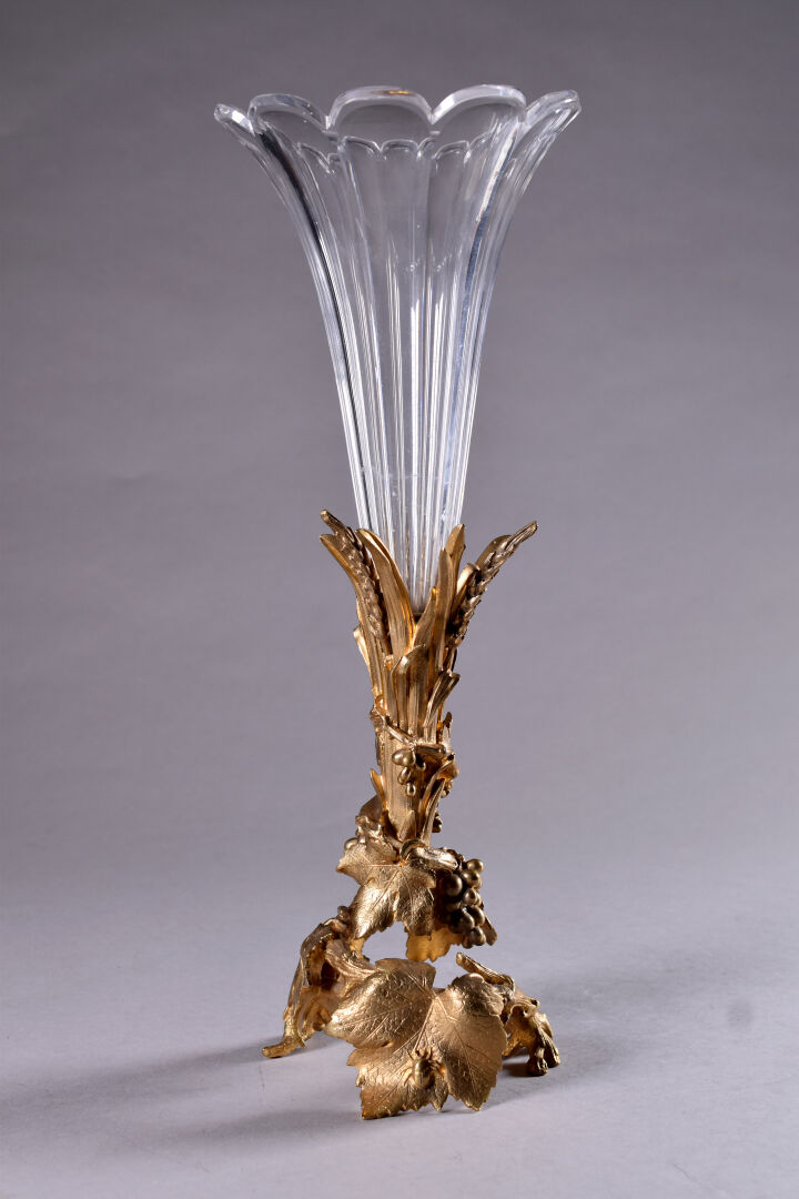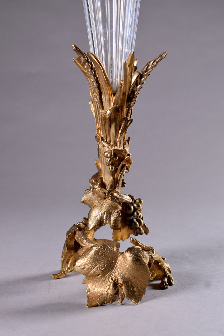 Alphonse GIROUX et Cie. Vase cornet à cotes pincées en cristal. La monture en bronze ciselé doré figurant des pampres de vignes avec des insectes. Haut. :