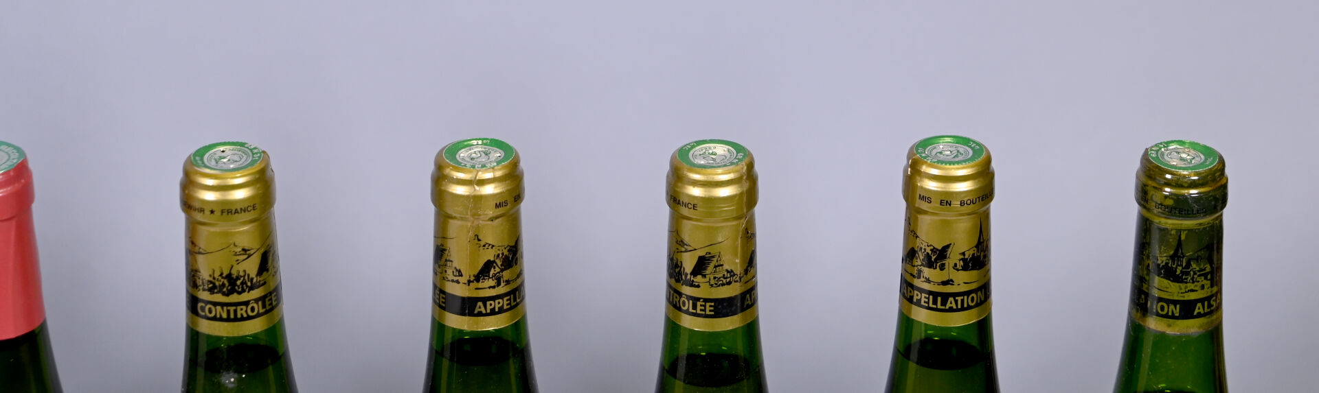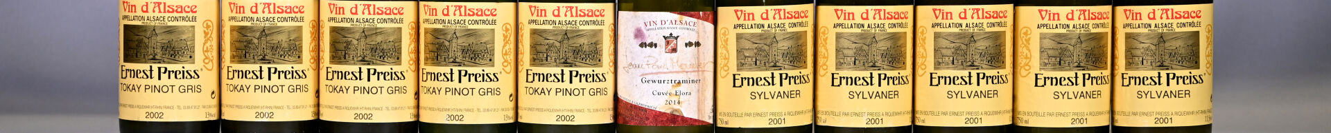ALSACE – Ensemble de 11 bouteilles composé de : 5 bouteilles, Alsace, Ernest Preiss, Tokay Pinot Gris, 2002. En l’état. 5 bouteilles, Alsace, Ernest Preiss, Sylvaner, 2001. Un niveau à 3,5 cm. En l’état. 1 bouteille, Alsace, Jean-Paul Mauler, Gewurztraminer, Cuvée Elora, 2014. En l’état.