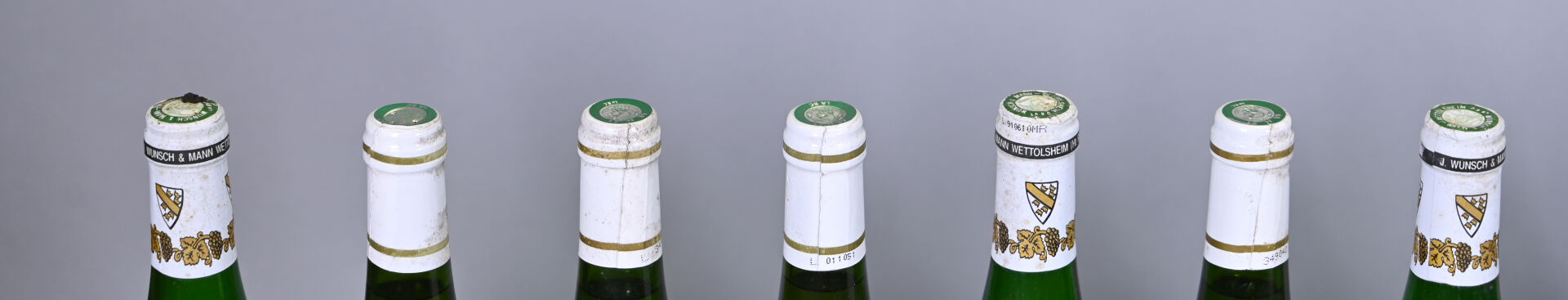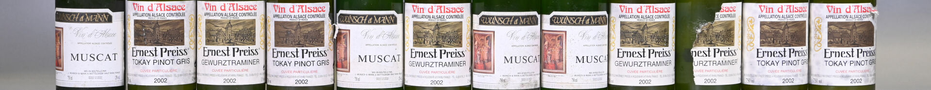 ALSACE – Ensemble de 12 bouteilles composé de : 4 bouteilles, Alsace, Ernest Preiss, Gewurztraminer, Cuvée Particulière, 2002. En l’état. 4 bouteilles, Alsace, Ernest Preiss, Tokay Pinot Gris, Cuvée Particulière, 2002. En l’état. – 4 bouteilles, Alsace, Wunsch et Mann, Muscat, 1990. En l’état.