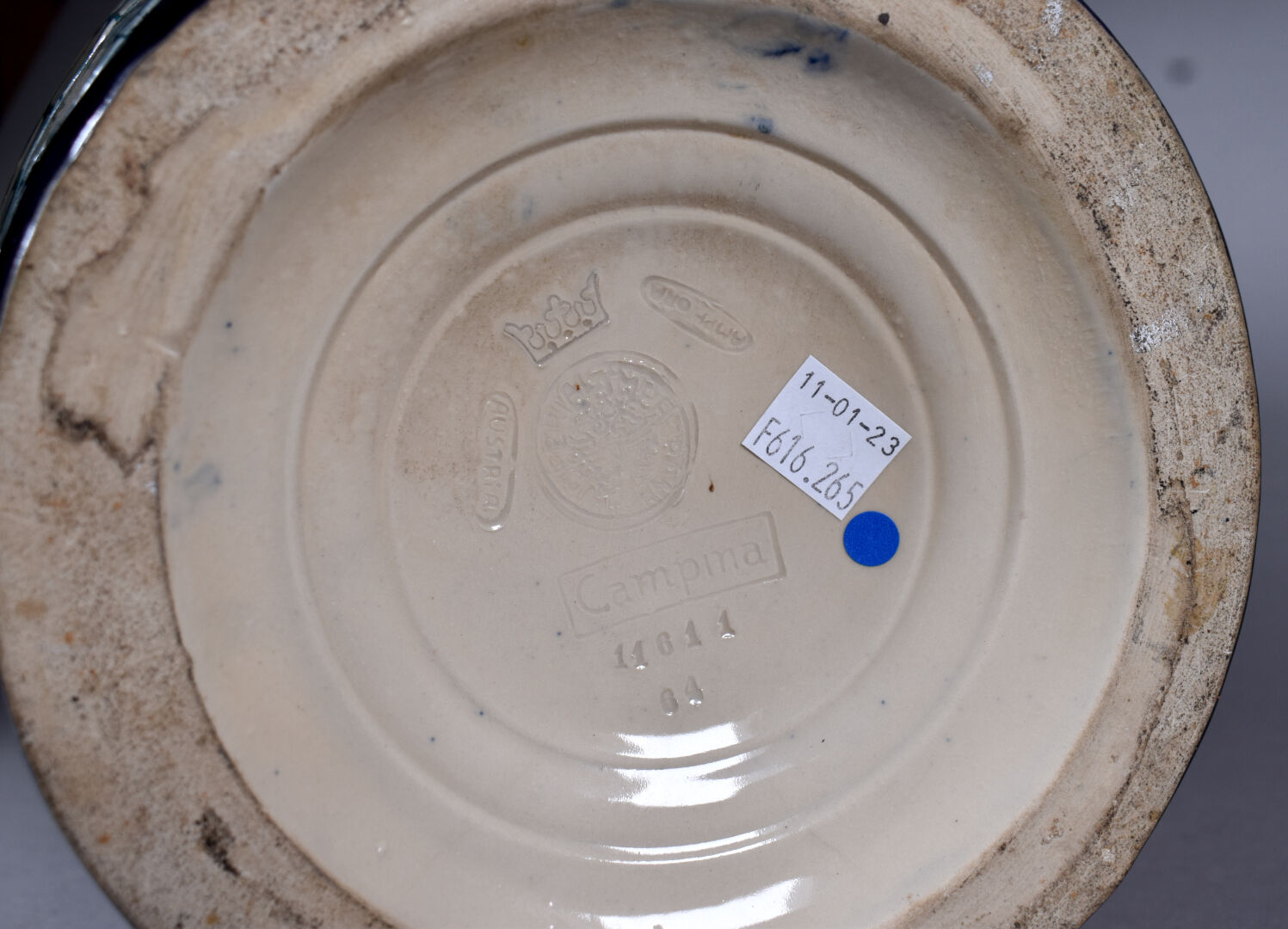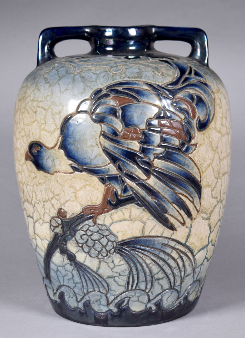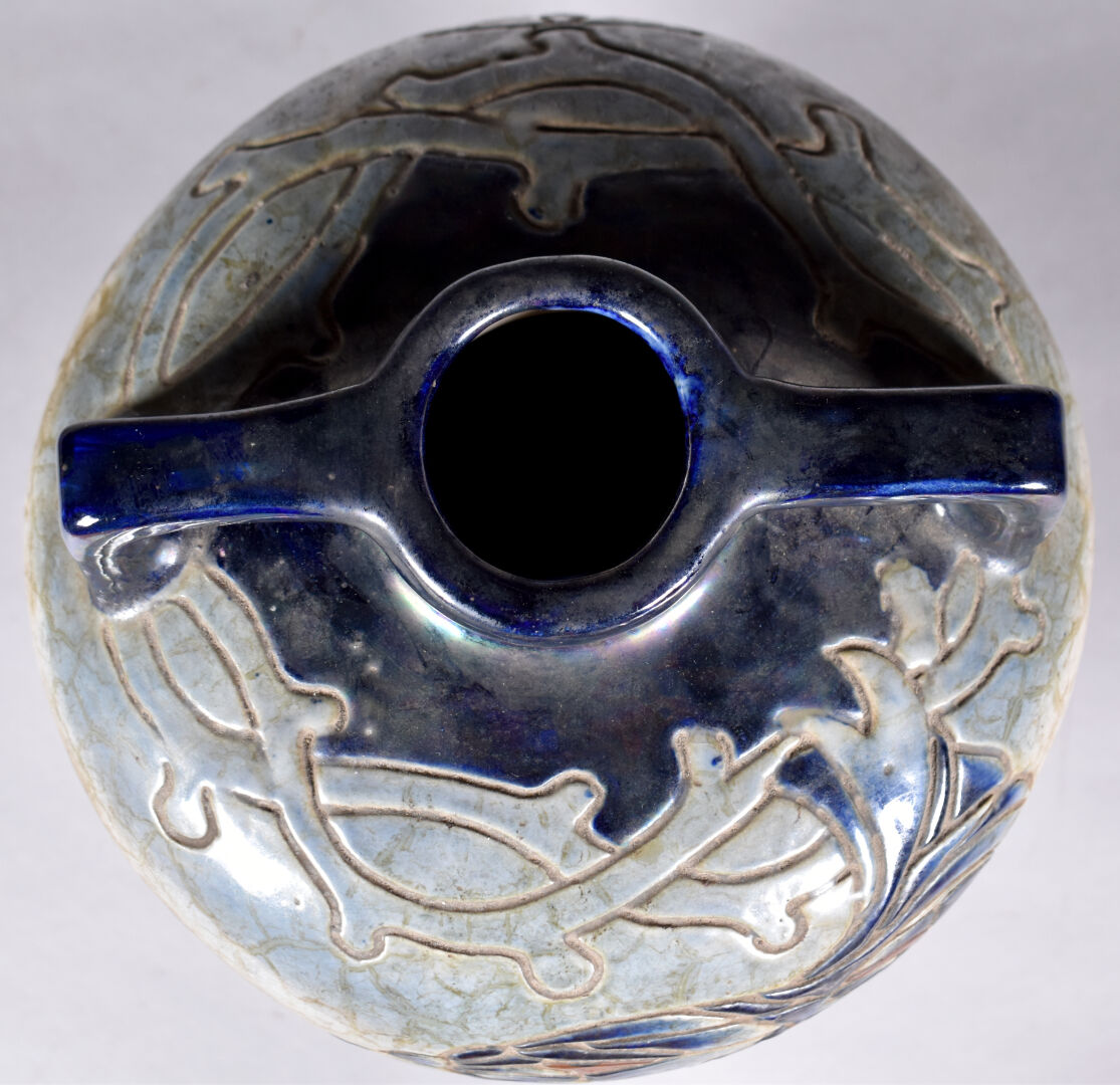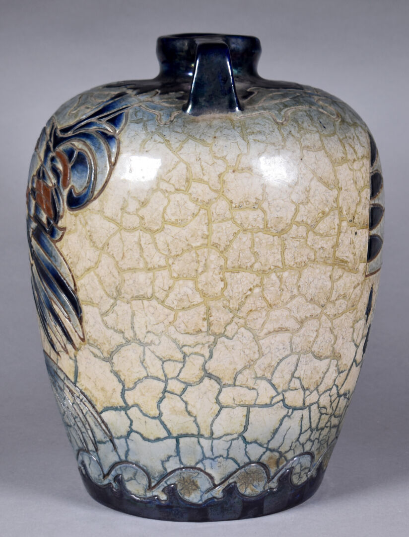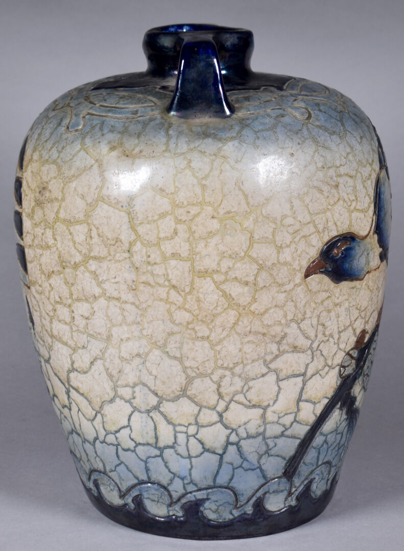 AMPHORA. Grand vase bombé à petit col en céramique émaillée en gris et bleu à reflets métalliques sur un fond craquelé d’un oiseau branché. Marqué au dessous. Haut. : 34,5 cm.