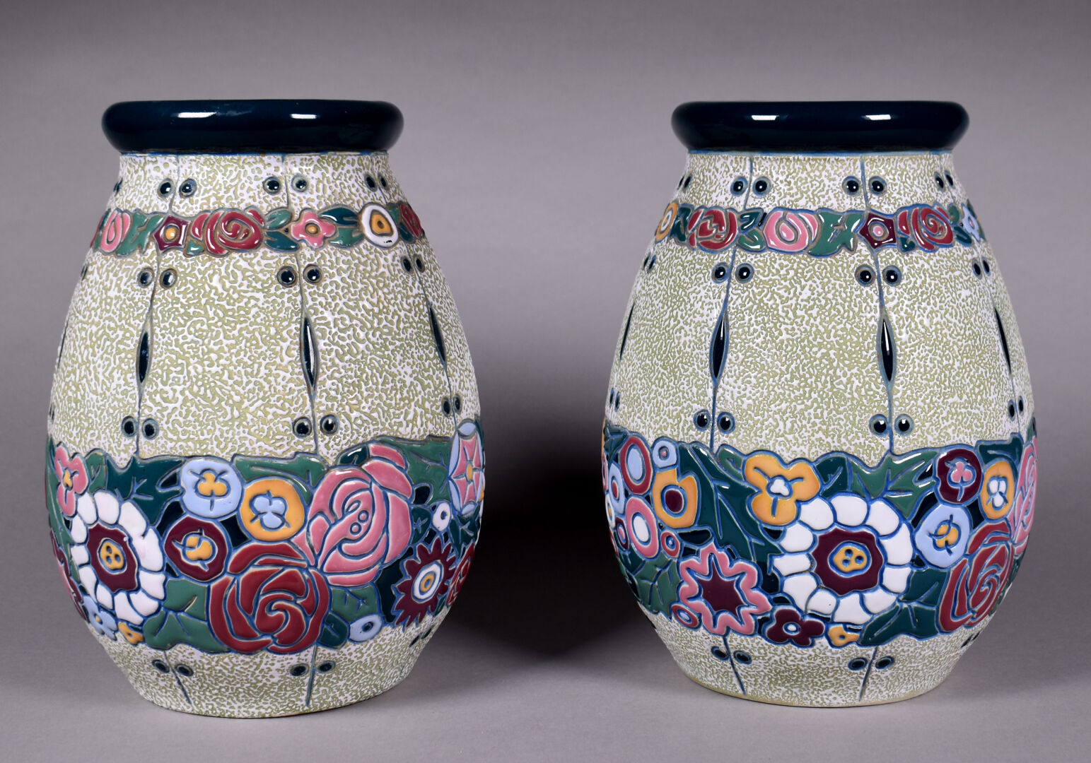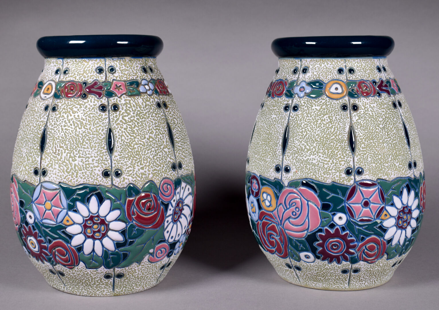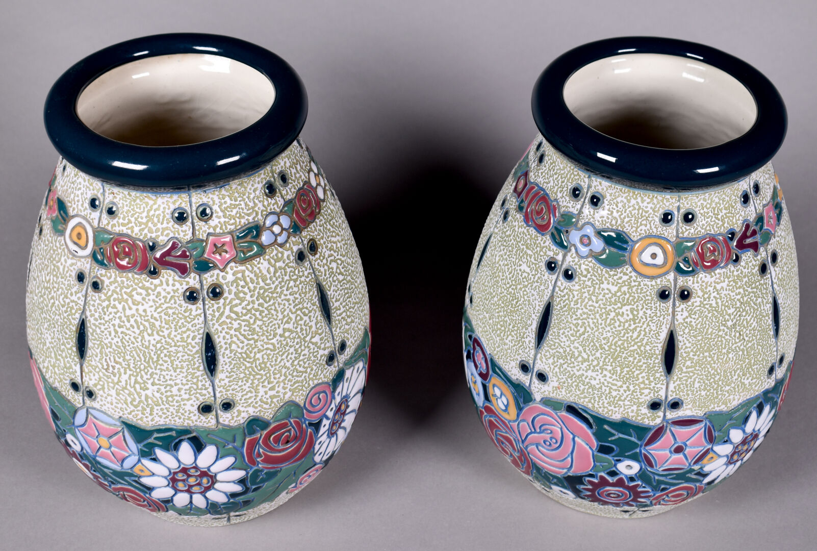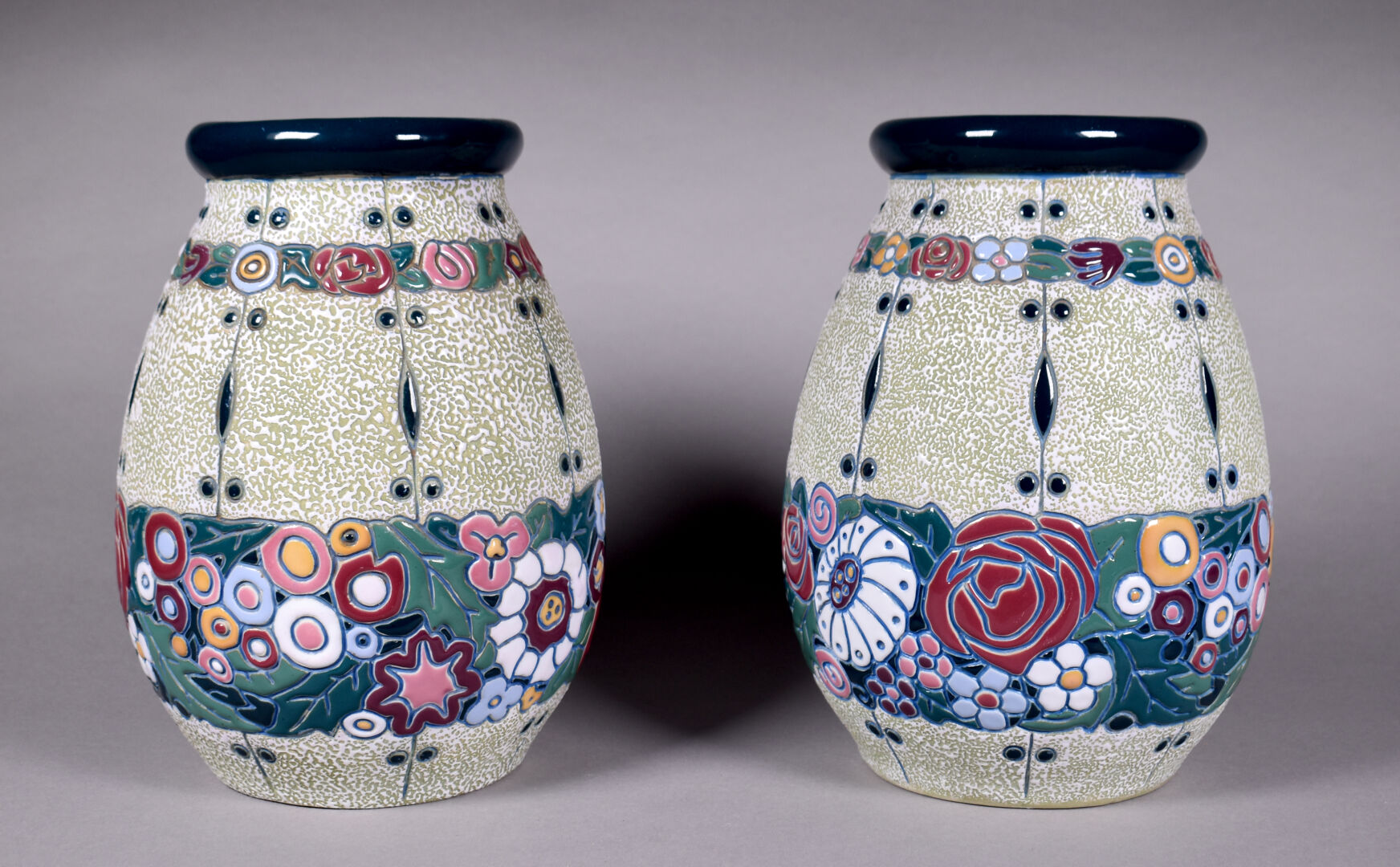 AMPHORA. Paire de vases ovoïdes en céramique émaillée d’un décor de fleurs dans le gout Art Déco. Signés au dessous. Haut. : 27,5 cm.