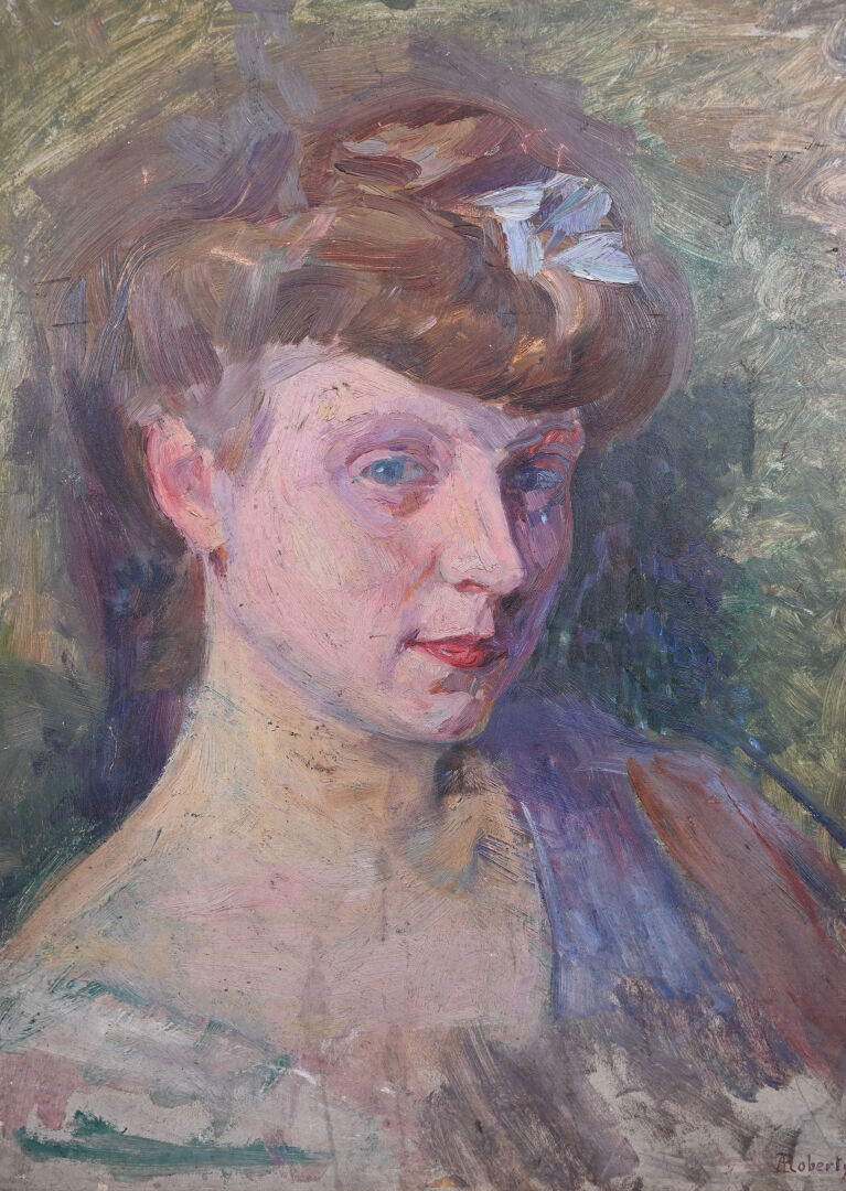 André Félix ROBERTY (1877-1963). Portrait de femme au chignon. Huile sur panneau signée en bas à droite (un manque). 46 x 36,5 cm
