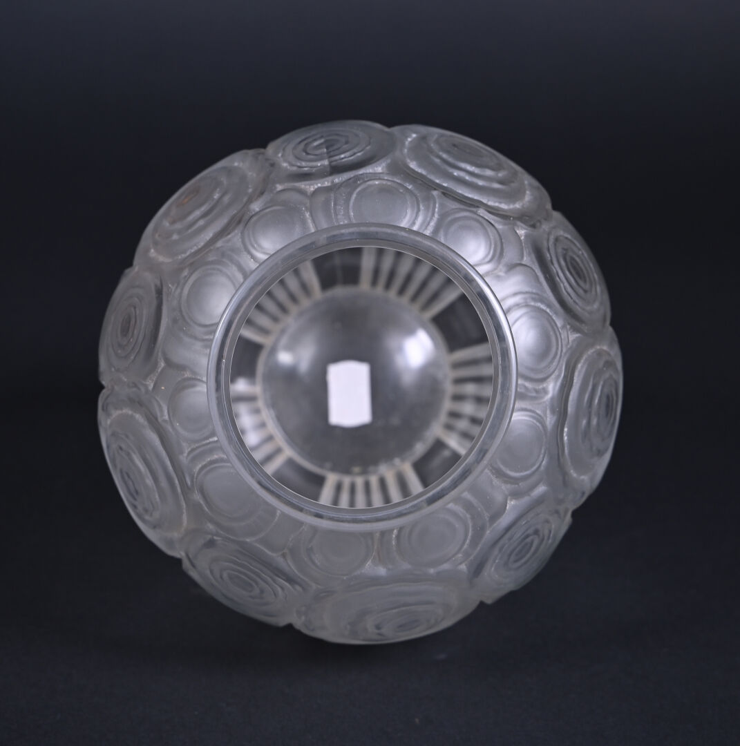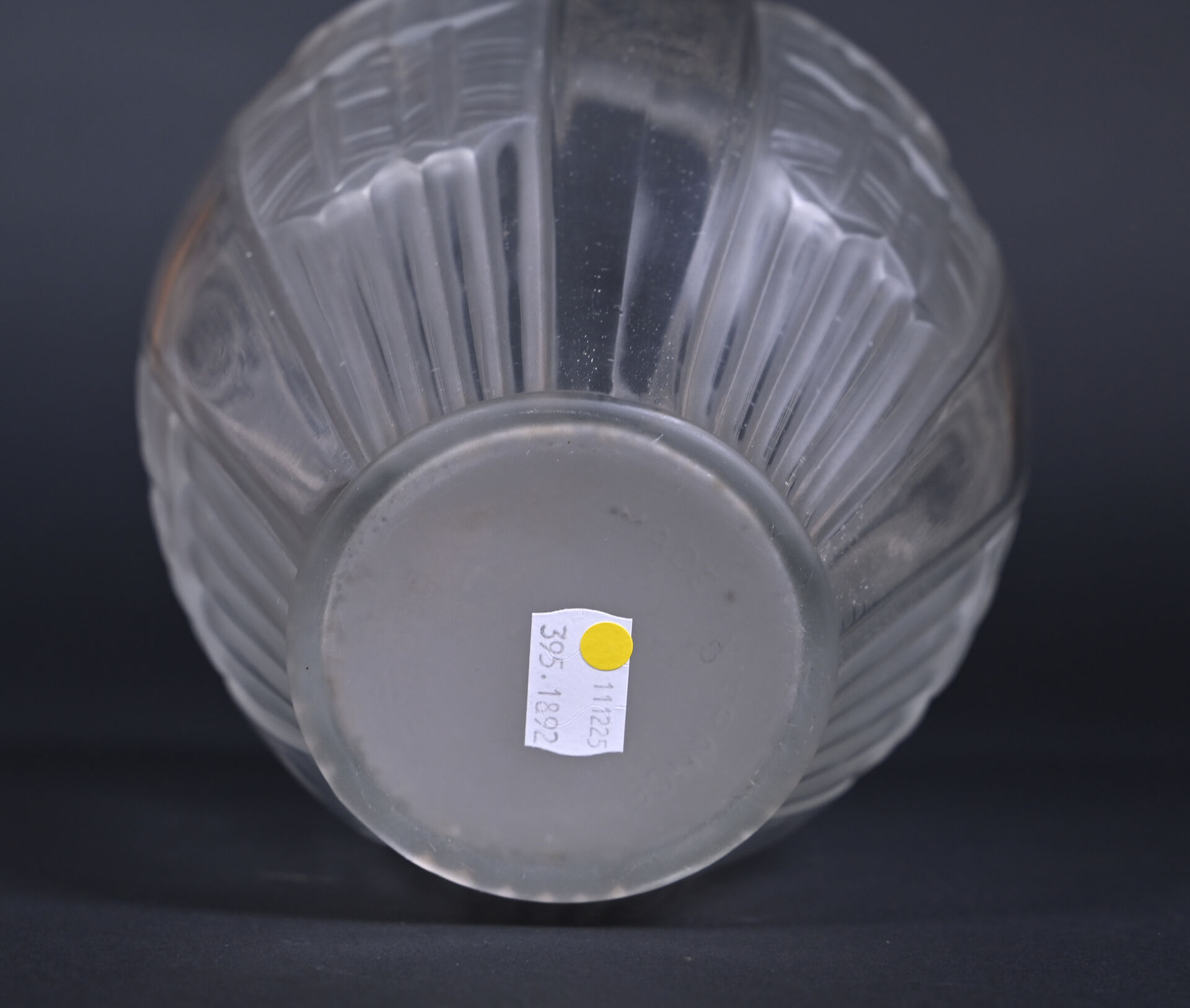 André HUNEBELLE (1896 – 1985). Vase ovoïde en verre moulé clair partiellement dépoli à décor de fleurs et motifs géométriques. Signé. Vers 1930. Haut. : 23 cm.
