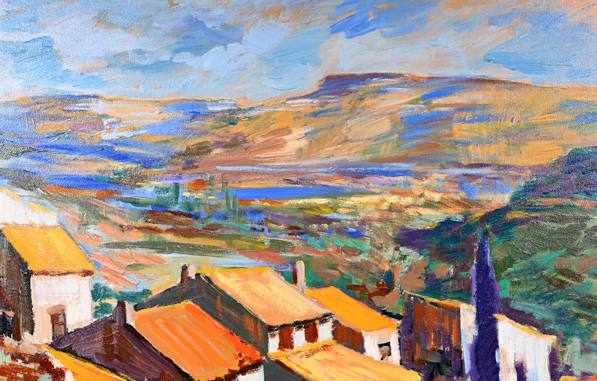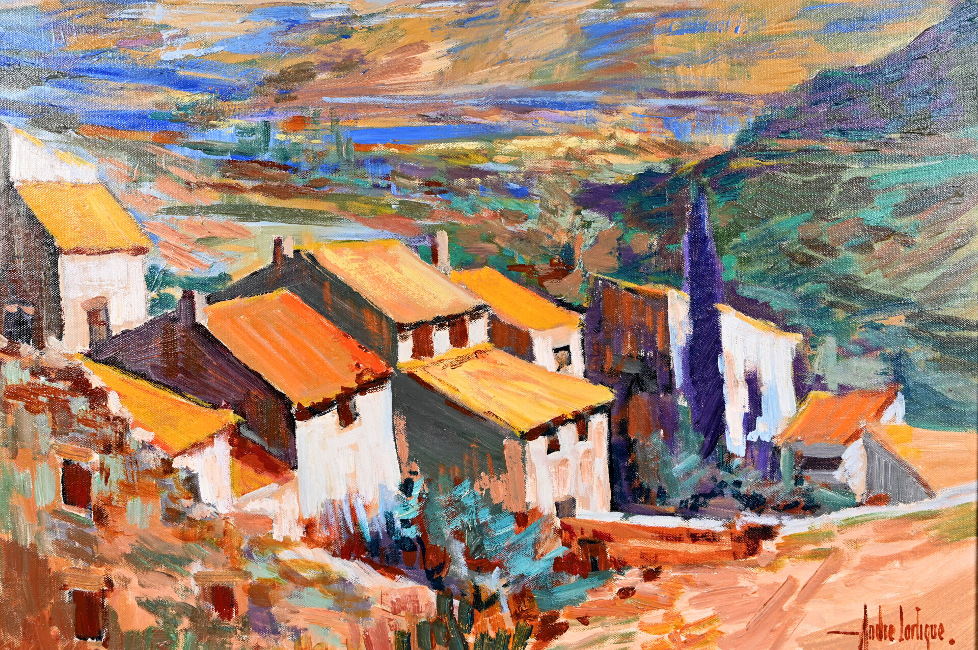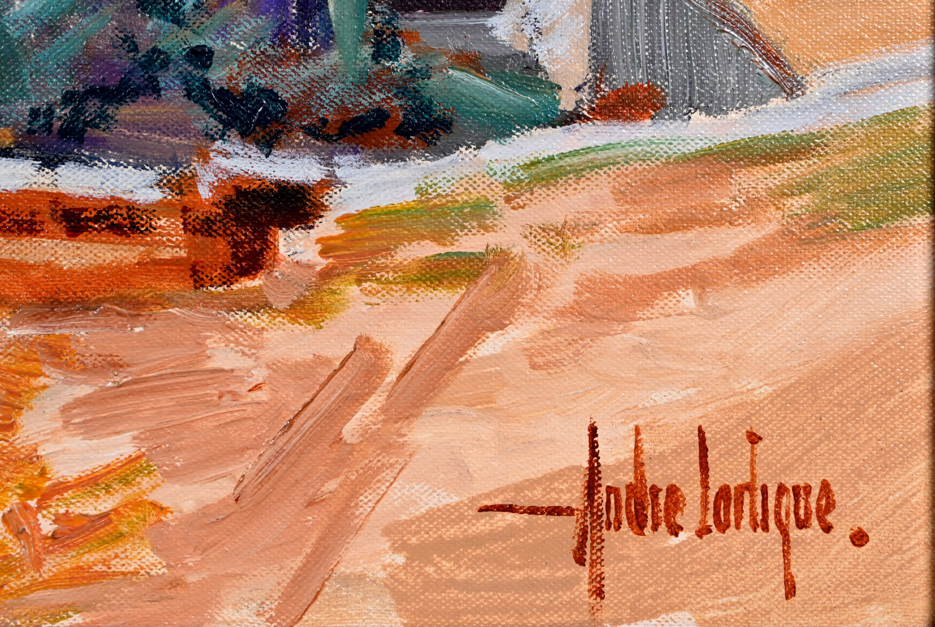 André LARTIGUE (1924-1993). « Paysage de Minerve » Huile sur toile signée en bas à droite, située et datée 1991 au dos avec cachet d’atelier. 53,5 x 65 cm.