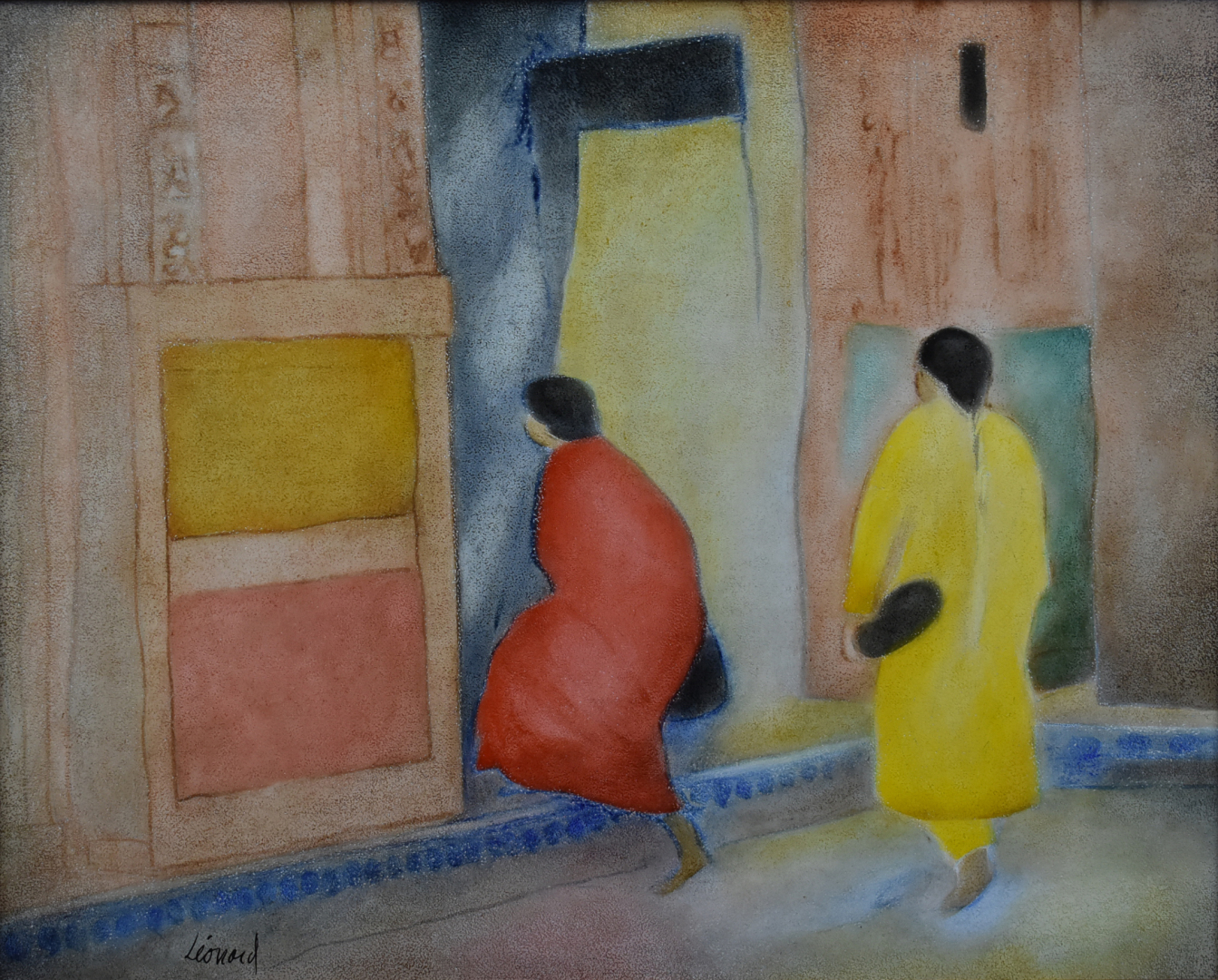 André LEONARD (Né en 1945). Deux femmes dans la rue de dos. Huile sur toile signée en bas à gauche. 33 x 41 cm.