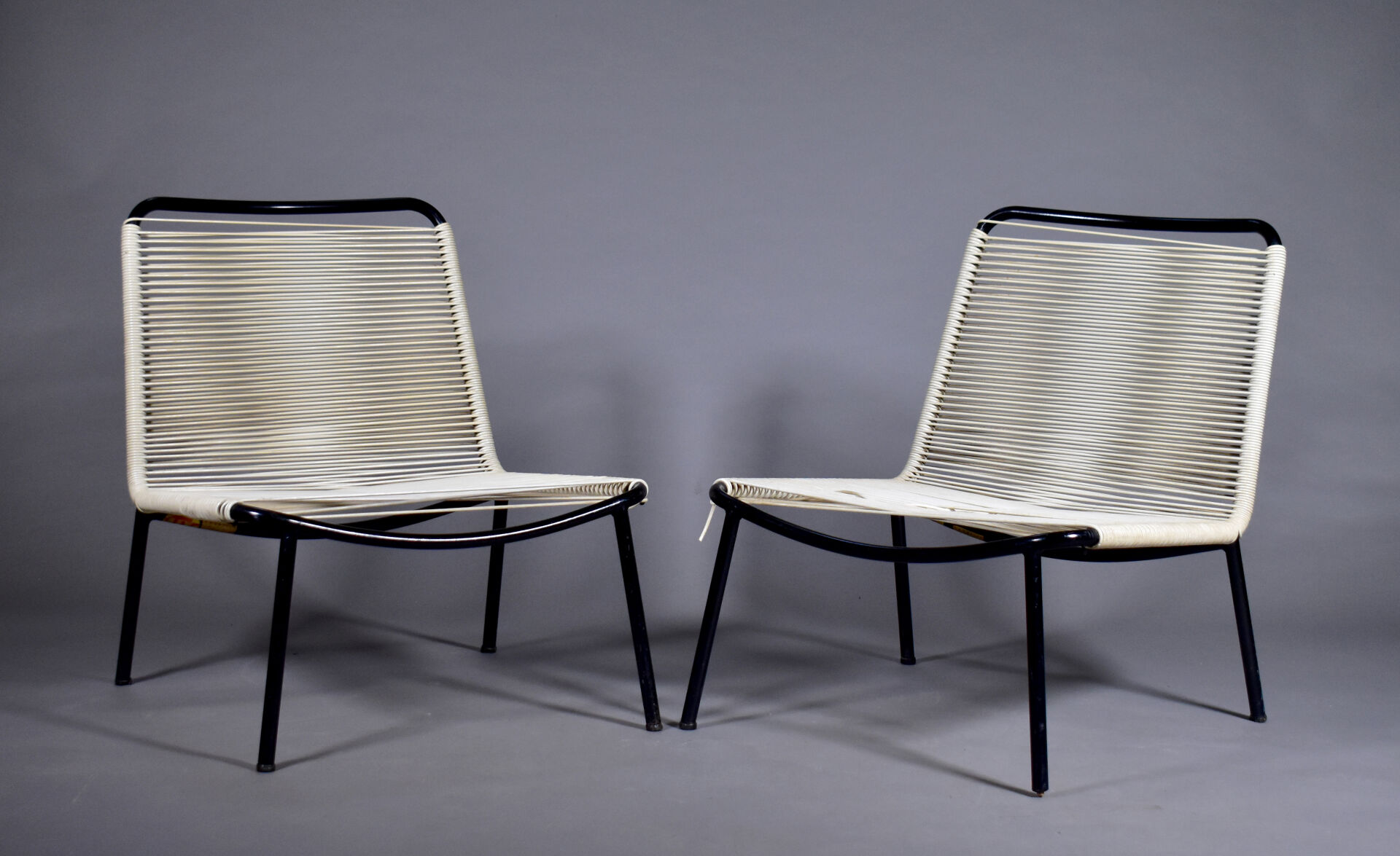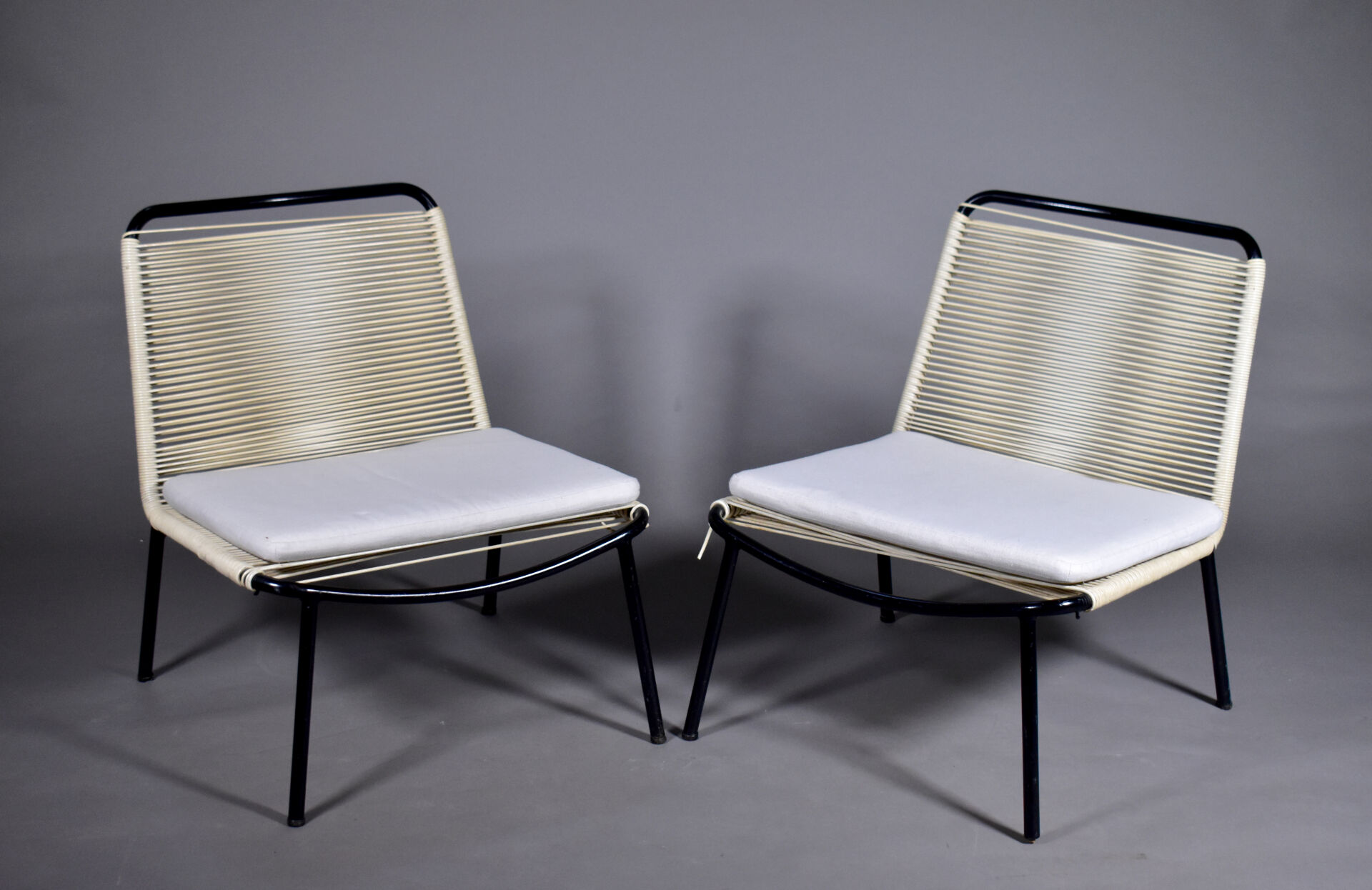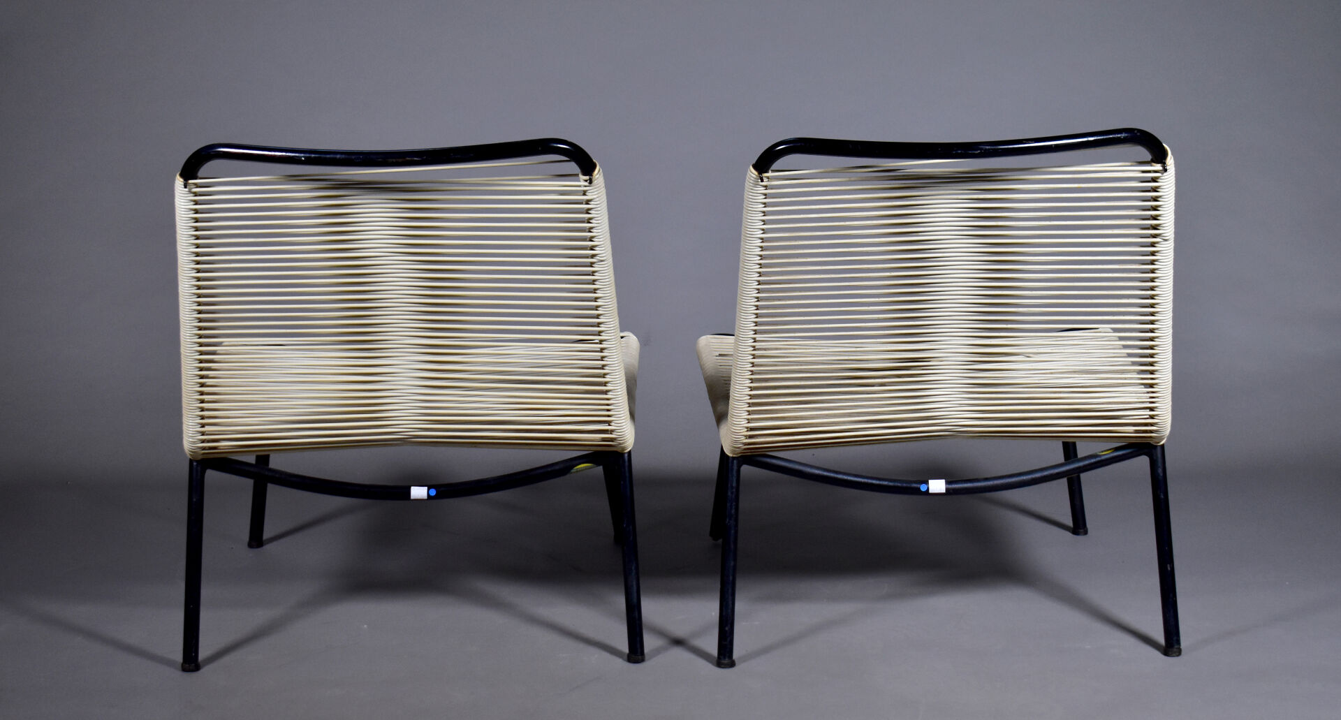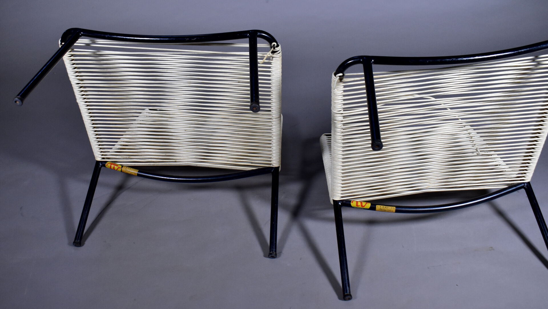 André MONPOIX (1925-1976) Meubles TV éditeurs. Paire de chauffeuses en métal tubulaire noir garnies de scoubidou blanc (un cassé, usures d’usage). Avec étiquette. On joint deux coussins d’assise. Haut. : 68,5 cm.