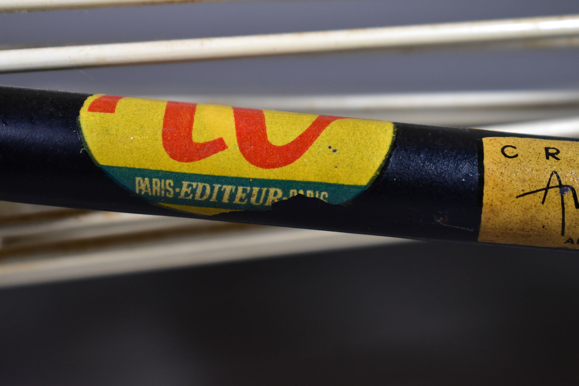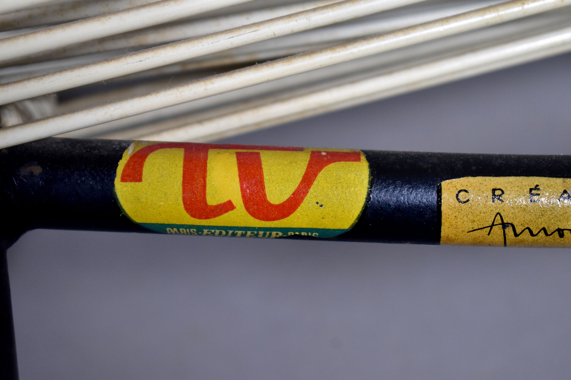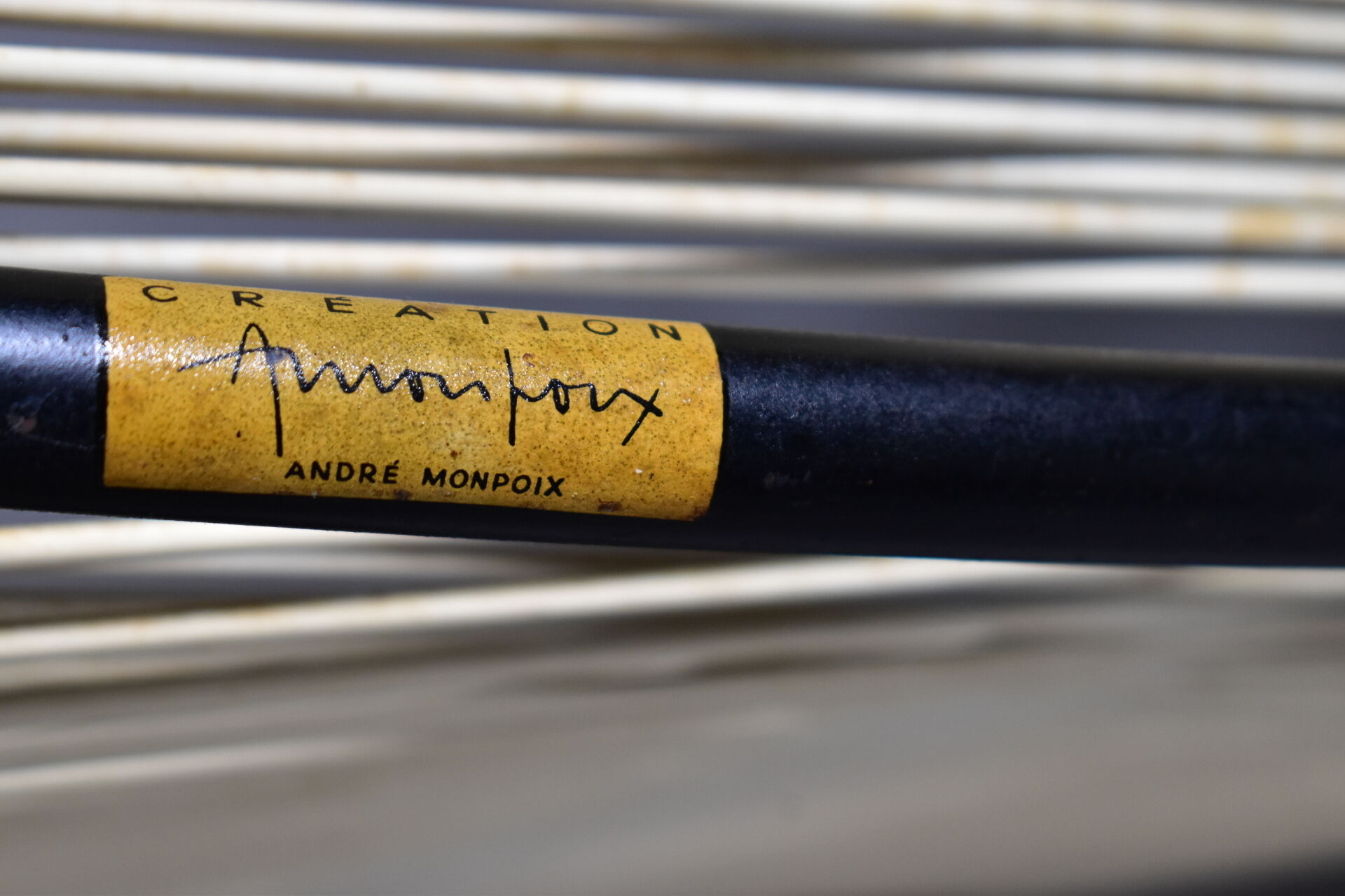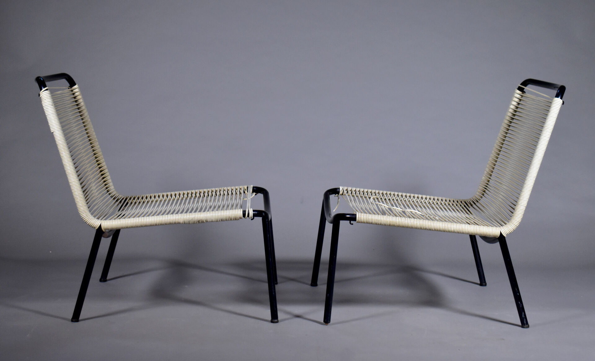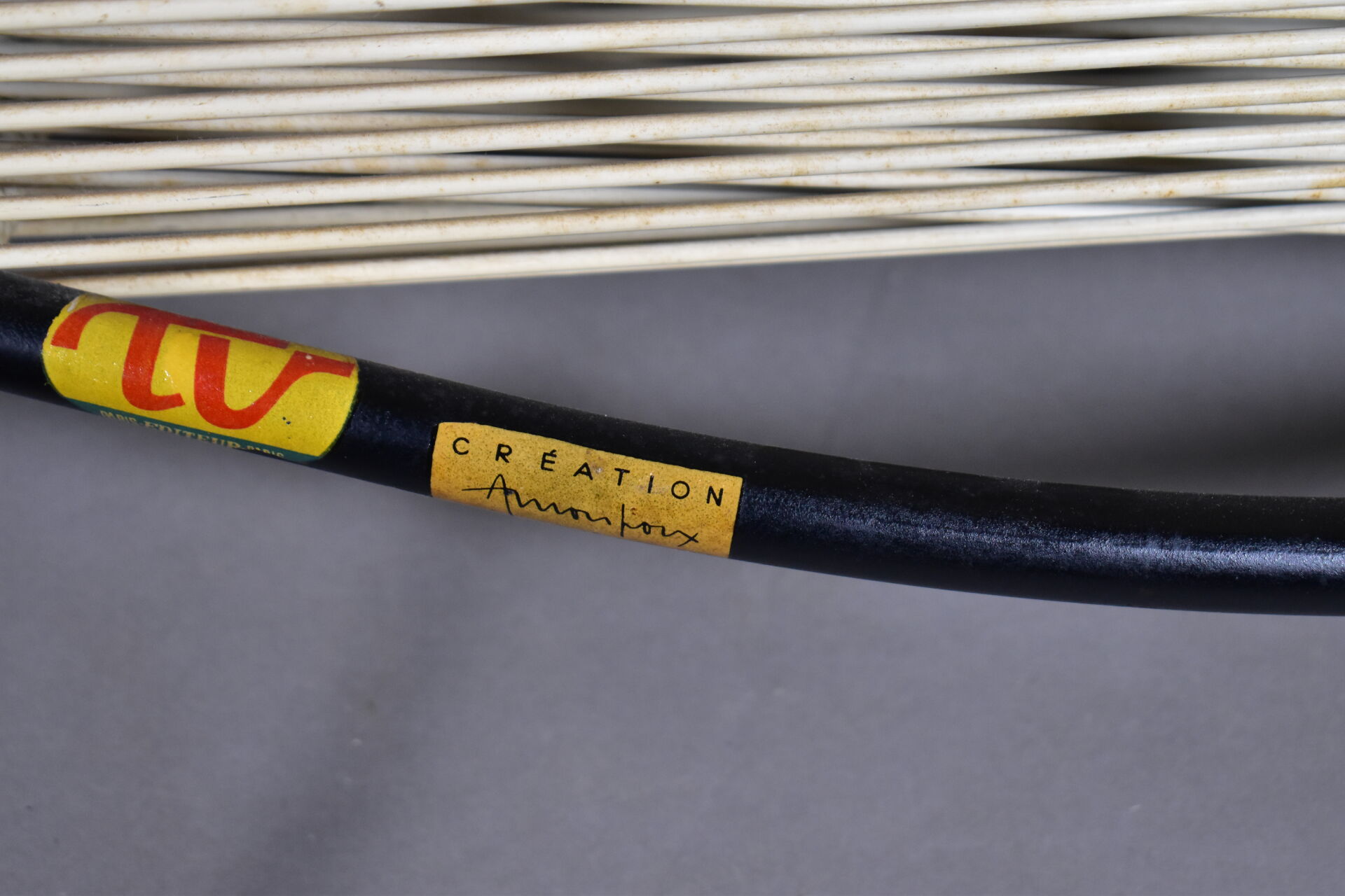 André MONPOIX (1925-1976) Meubles TV éditeurs. Paire de chauffeuses en métal tubulaire noir garnies de scoubidou blanc (un cassé, usures d’usage). Avec étiquette. On joint deux coussins d’assise. Haut. : 68,5 cm.