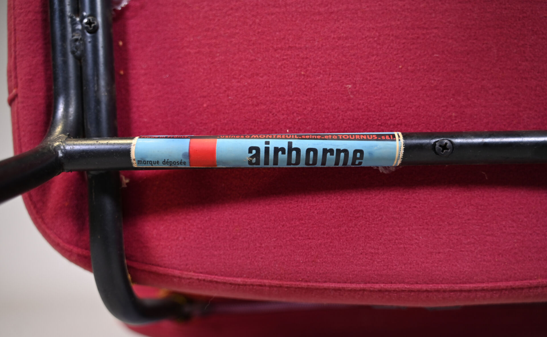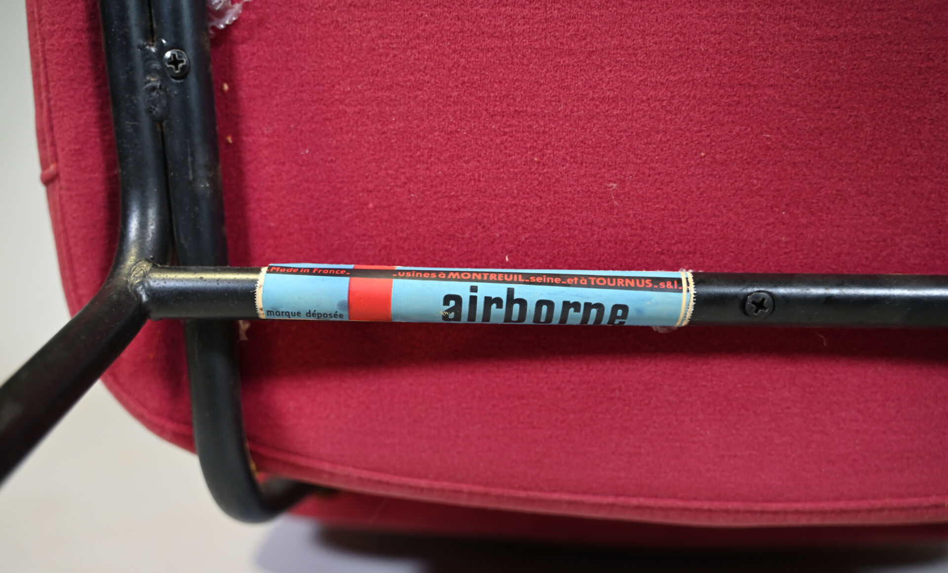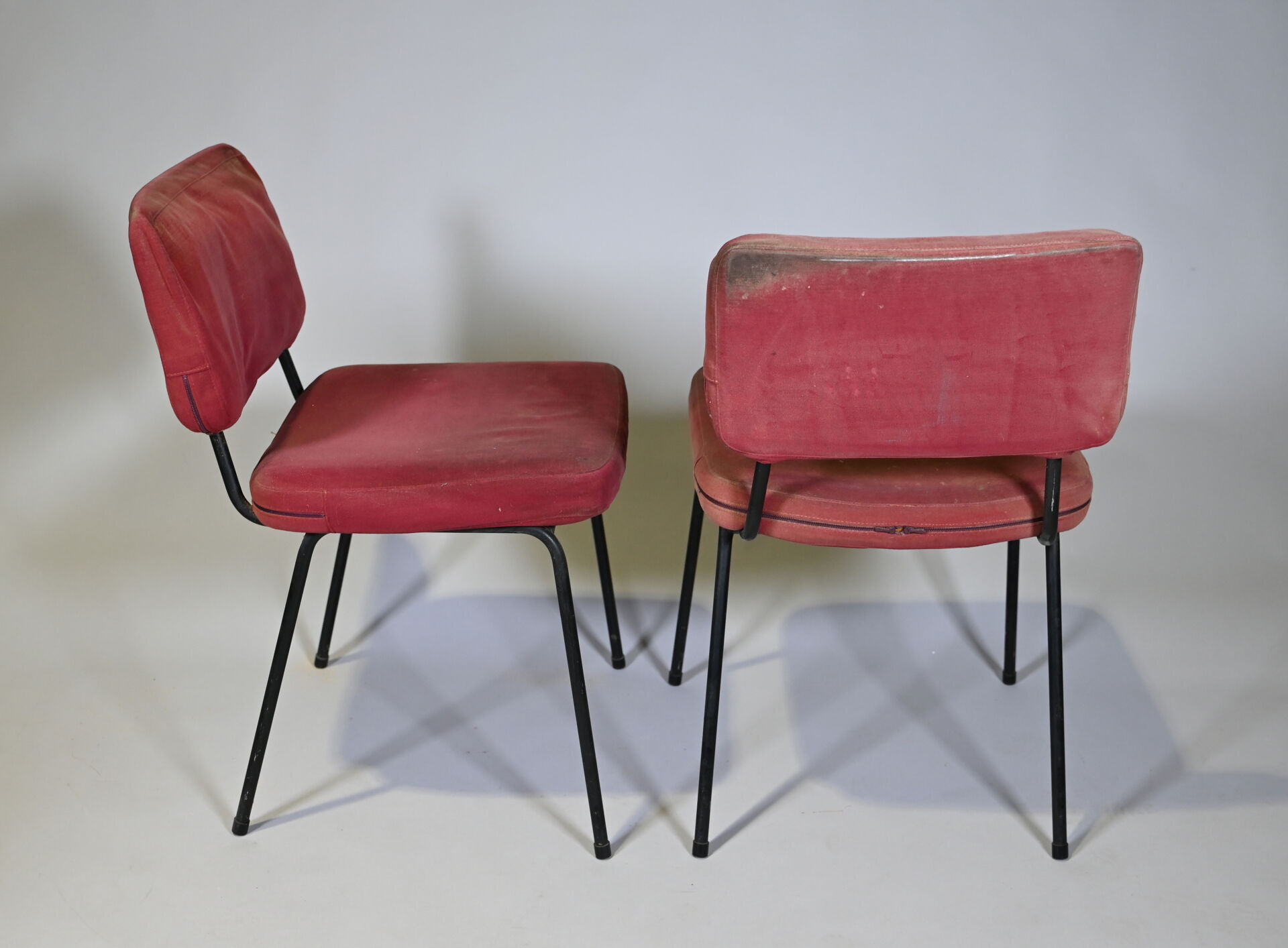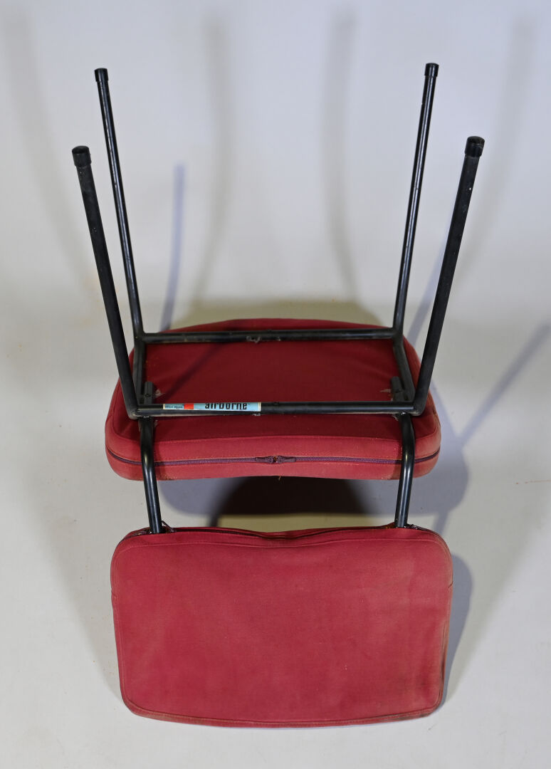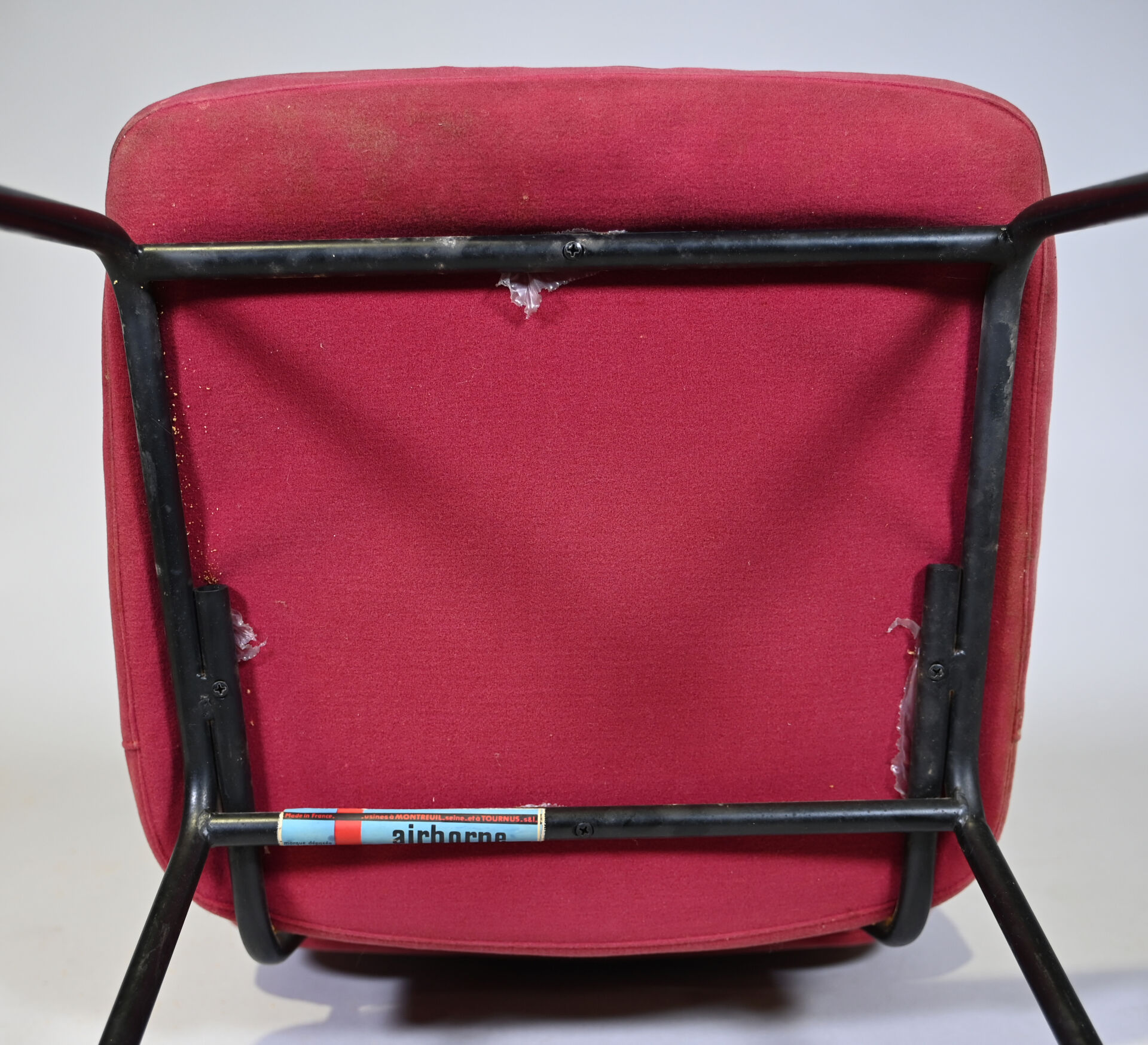 André SIMARD (1926 – 2021), Édition Airborne. Suite de 3 chaises garnies de tissu rouge, structure en métal tubulaire noir (usures). Etiquette d’éditeur. Travail des années 1960. Haut. 74 cm.
