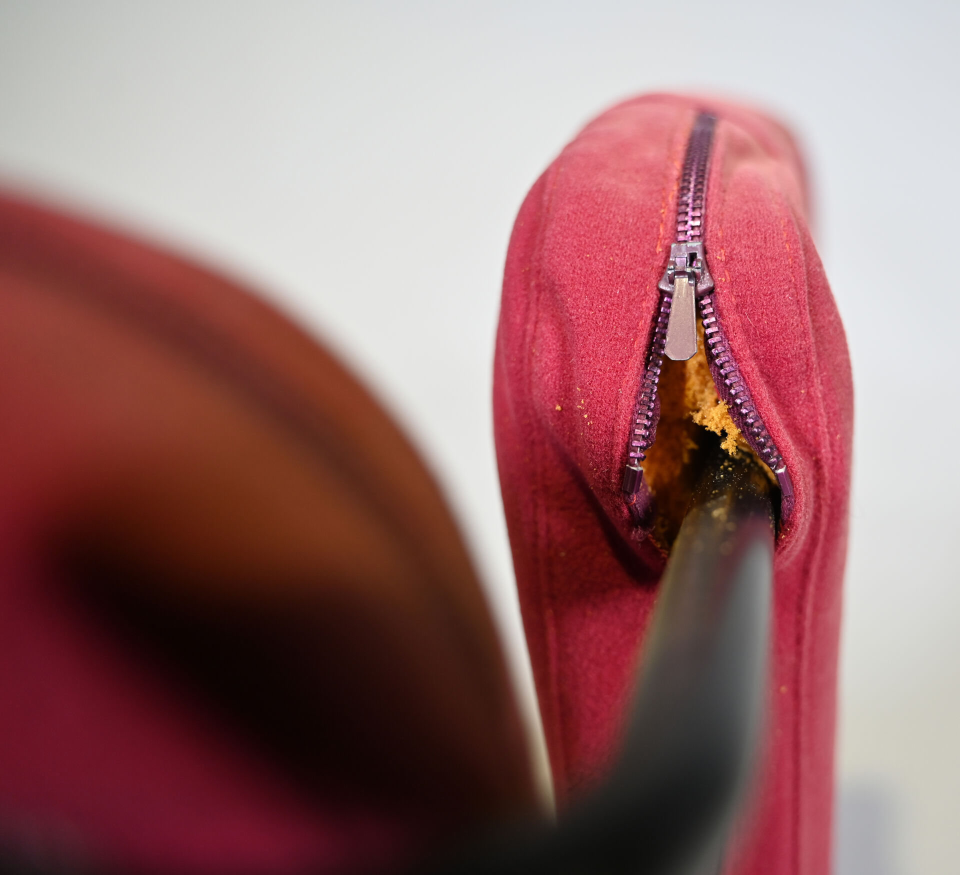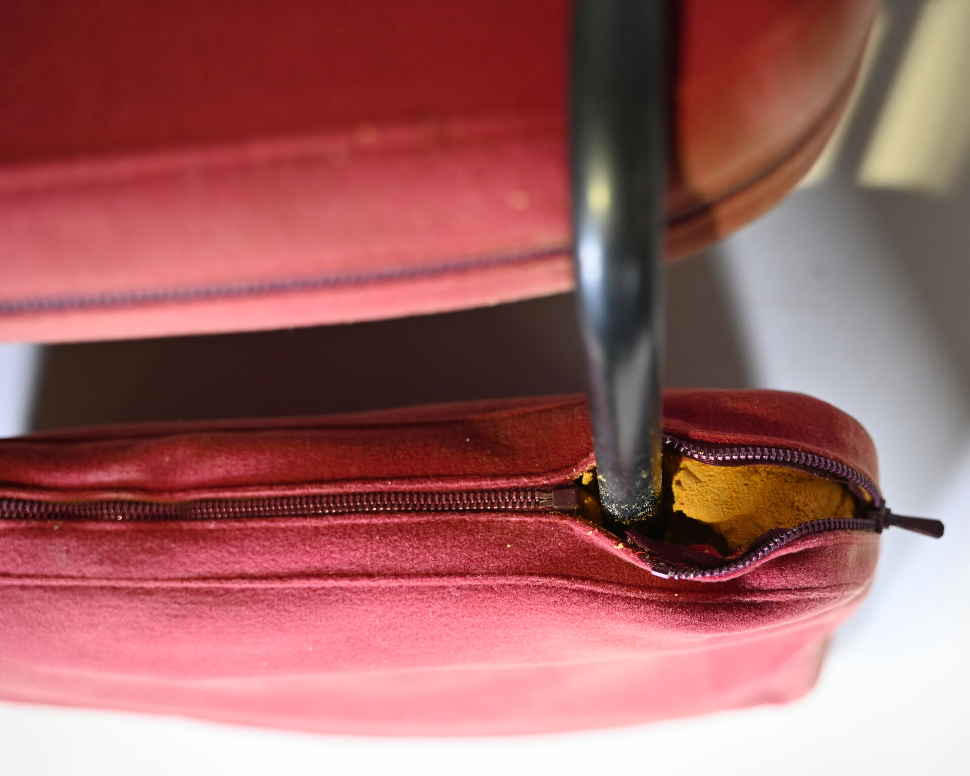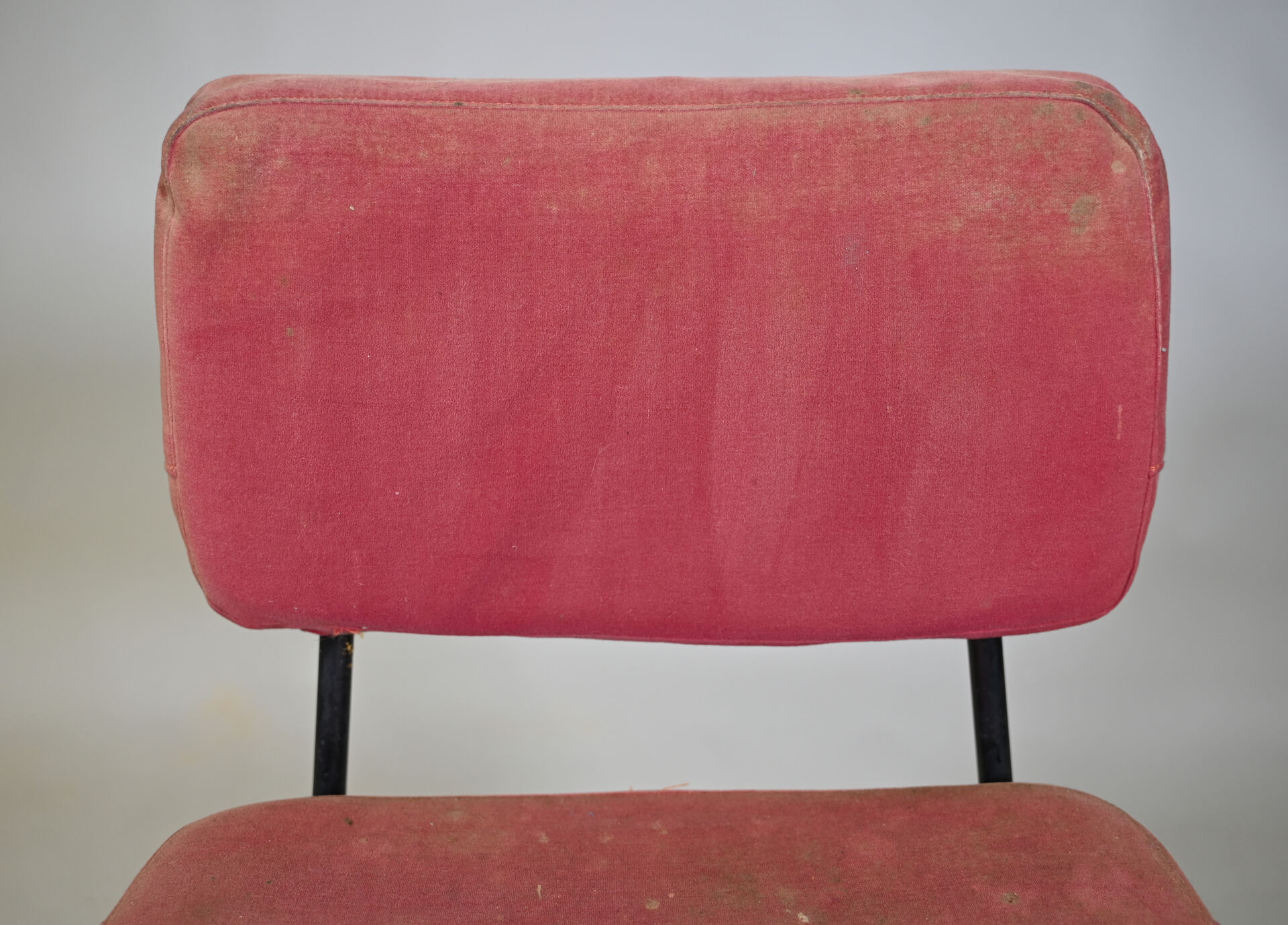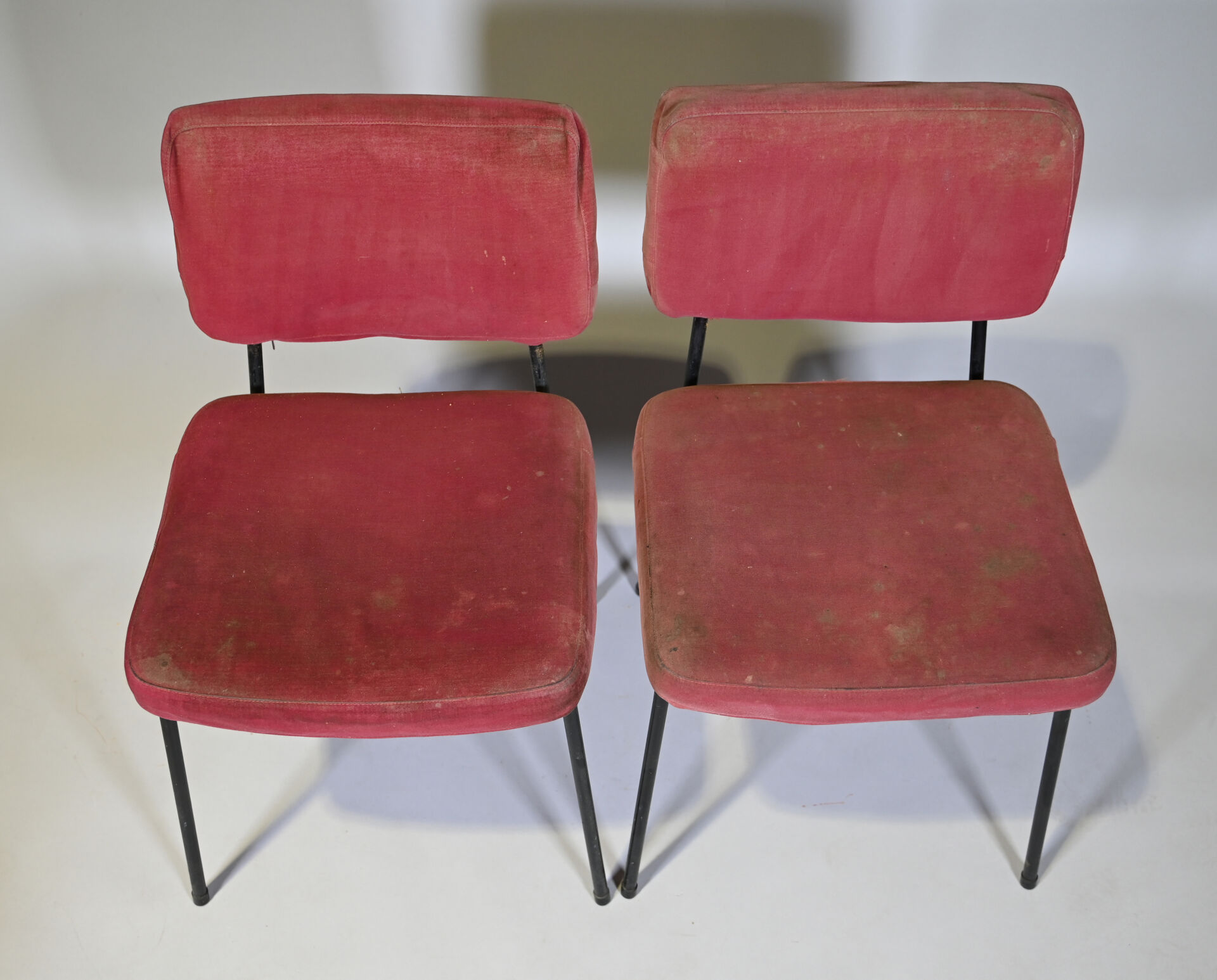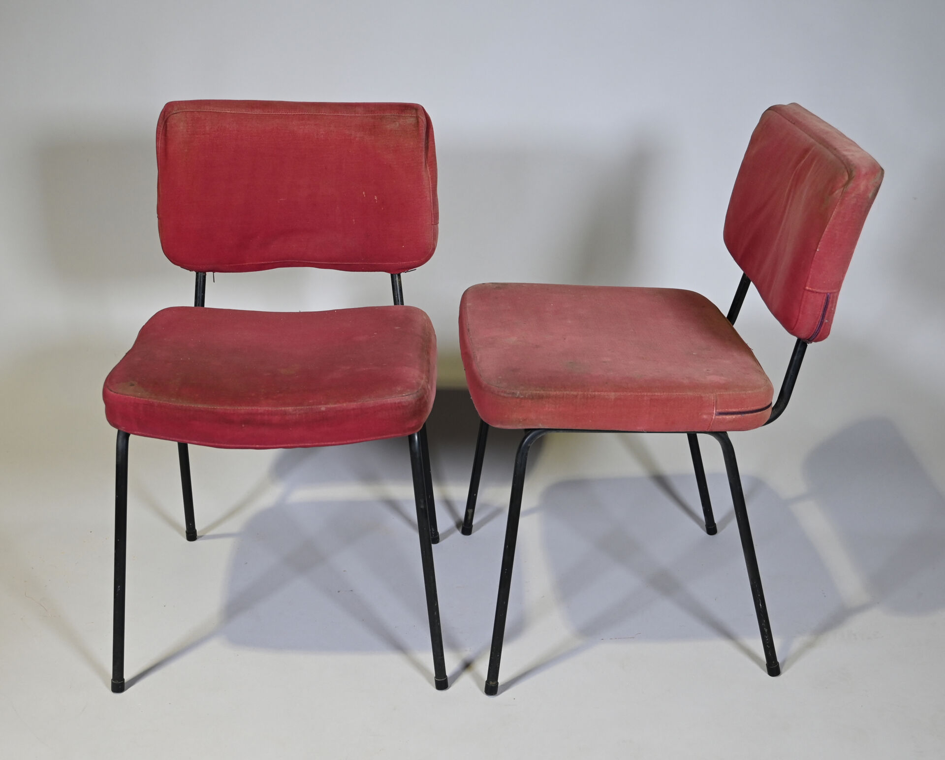 André SIMARD (1926 – 2021), Édition Airborne. Suite de 3 chaises garnies de tissu rouge, structure en métal tubulaire noir (usures). Etiquette d’éditeur. Travail des années 1960. Haut. 74 cm.