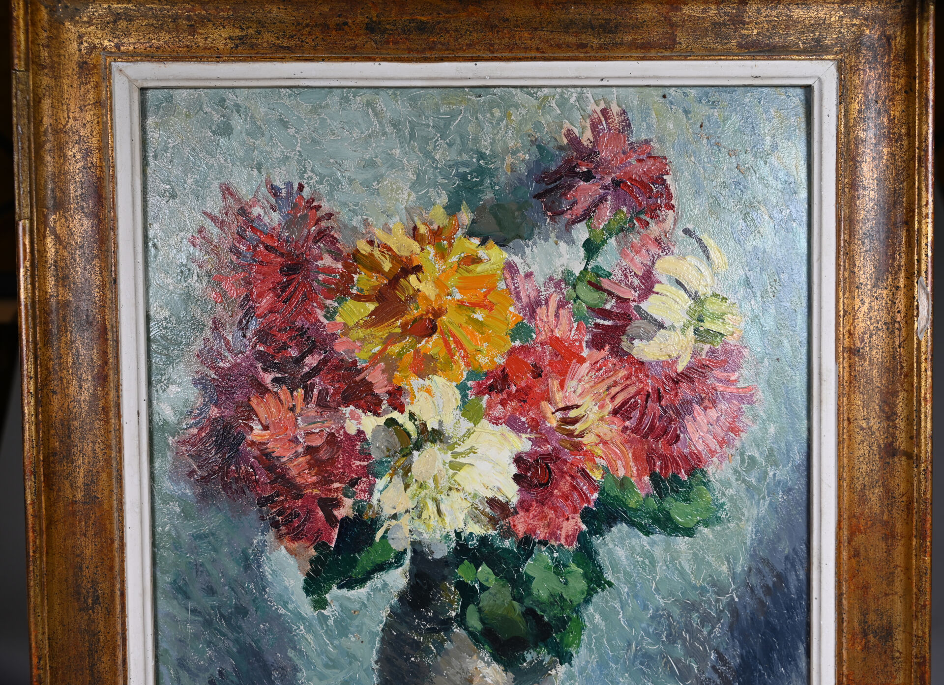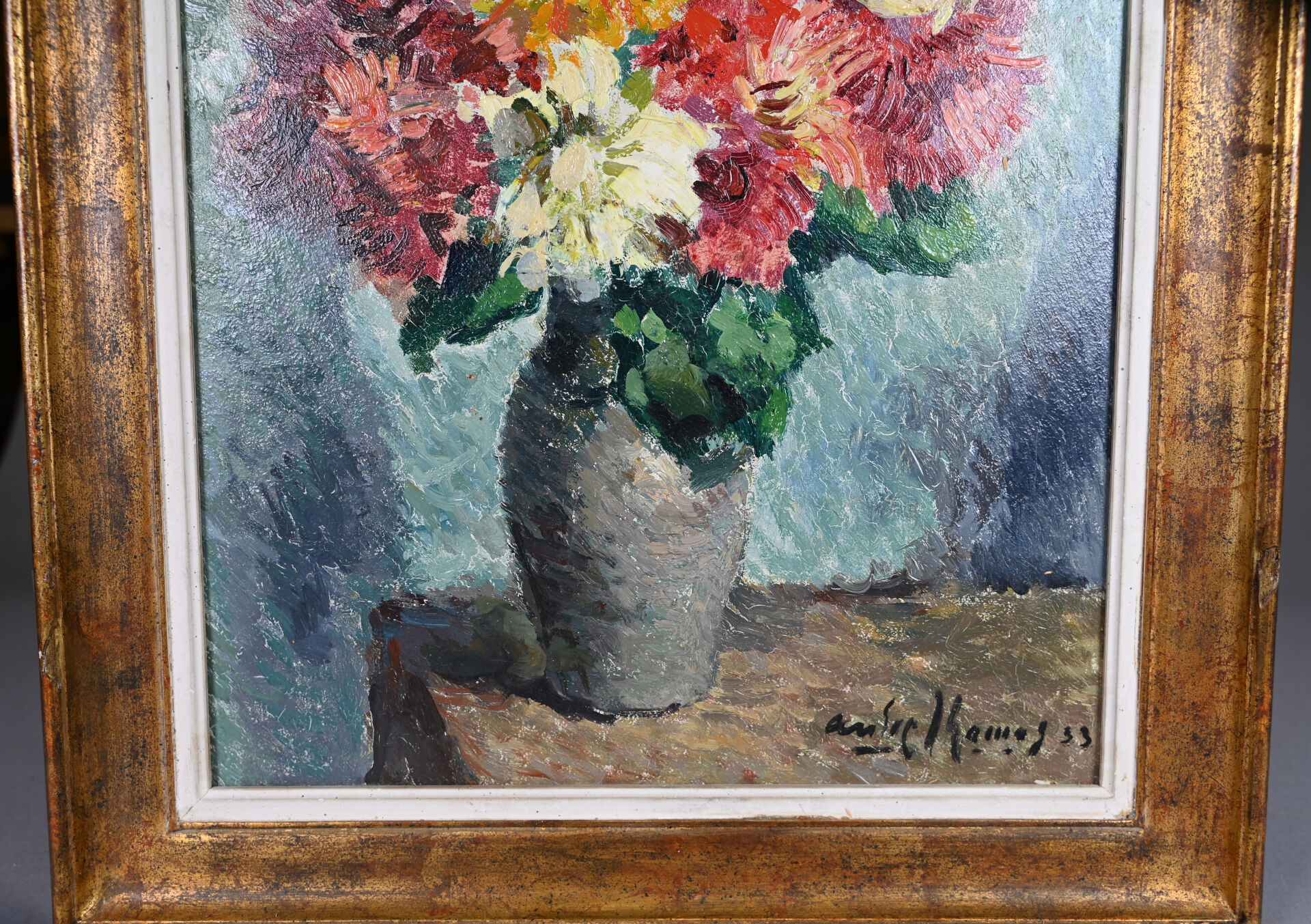André THOMAS (XXe siècle). Bouquet de chrysanthèmes dans un vase gris. Huile sur panneau signée et datée 1933 en bas à droite. 40 x 32 cm.