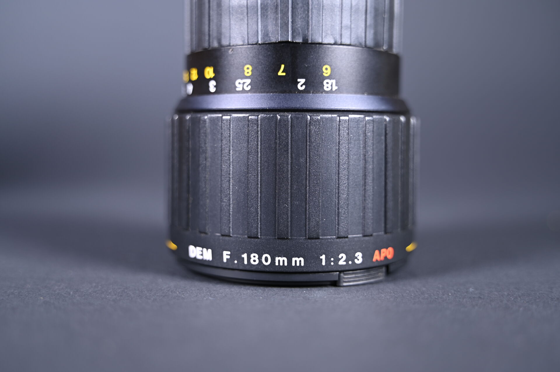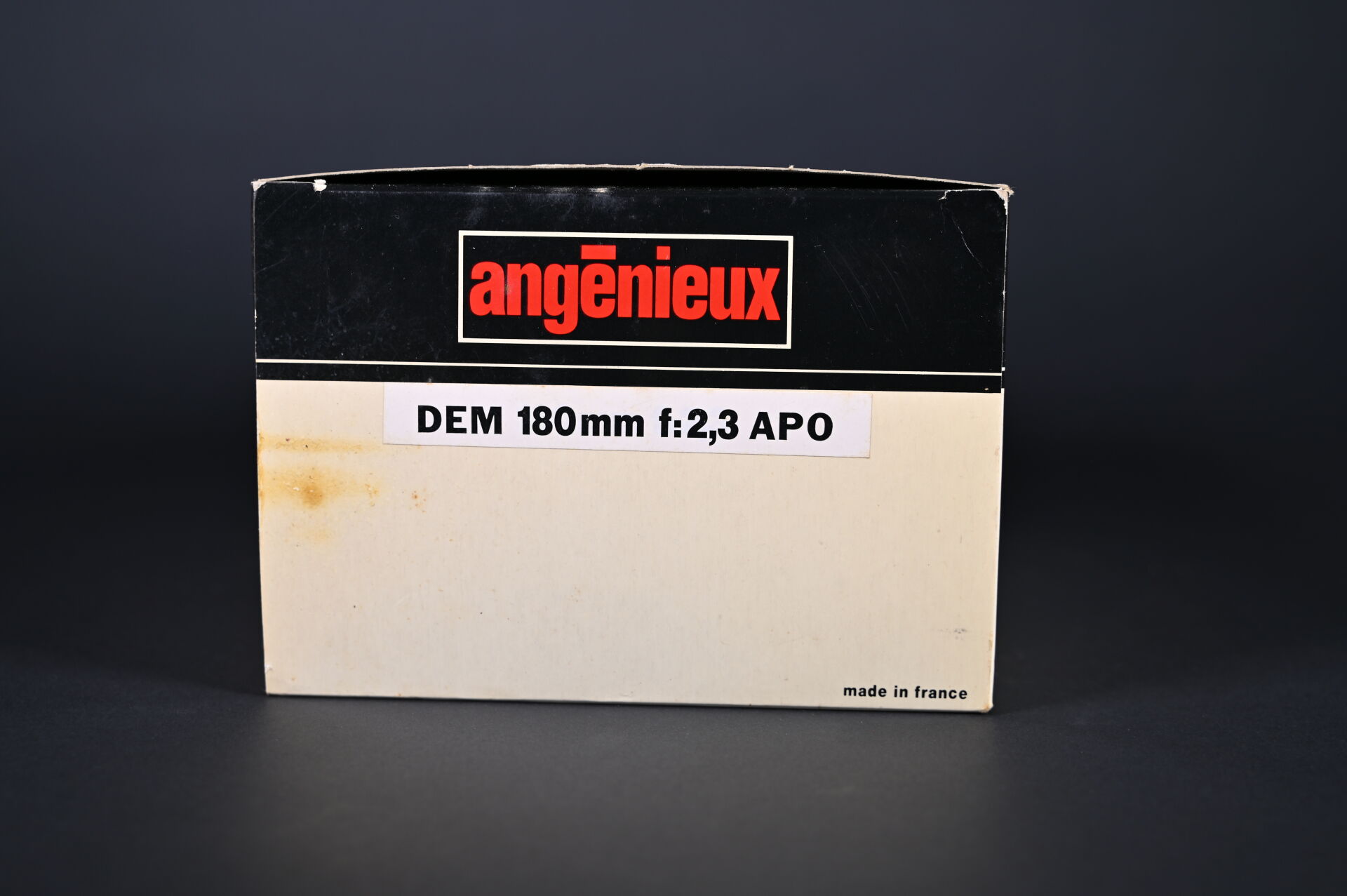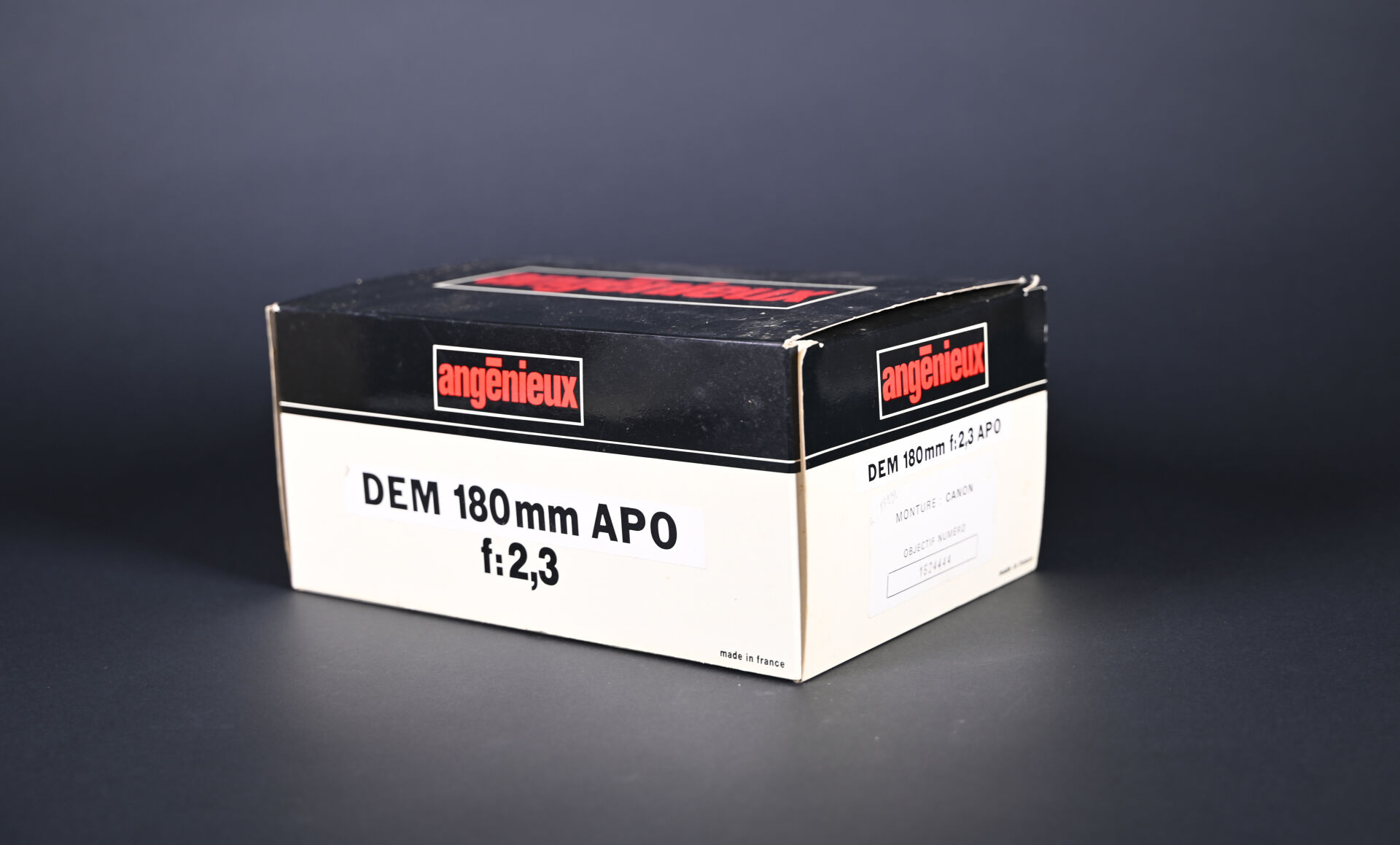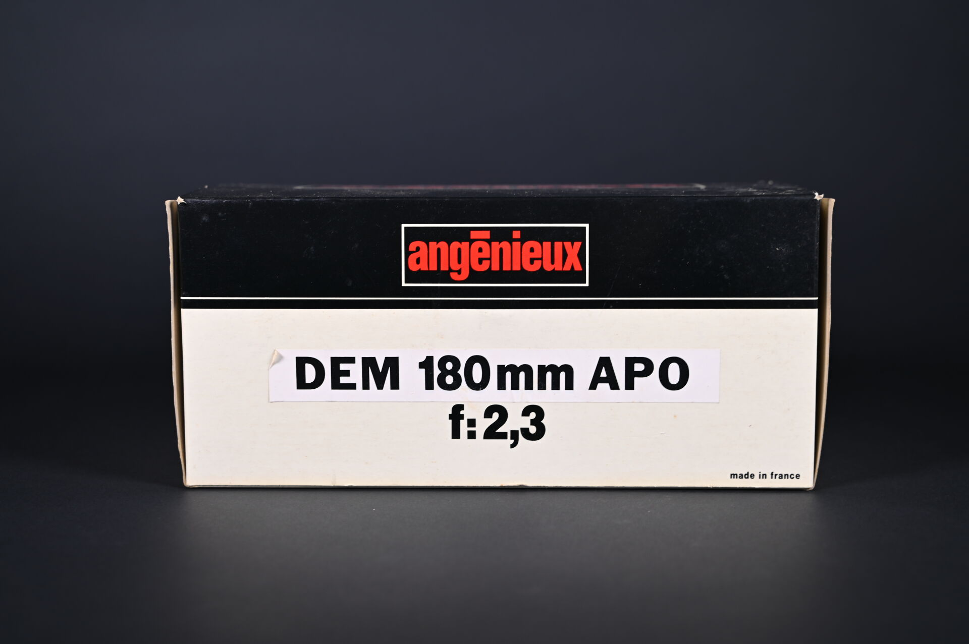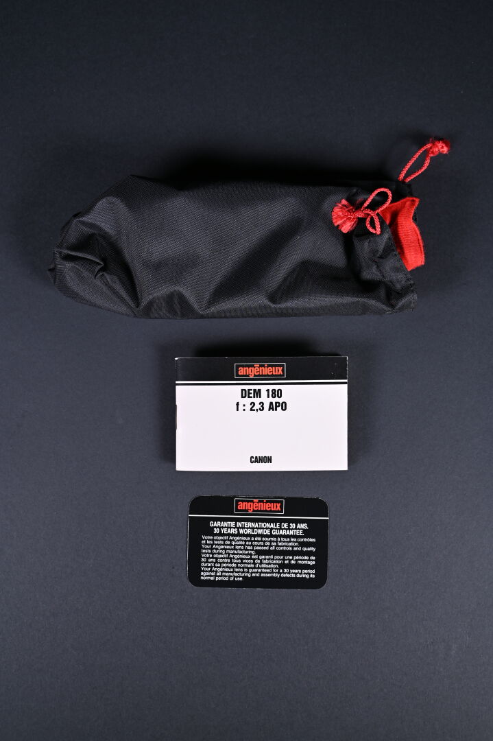 ANGENIEUX. Objectif Angénieux DEM 180 mm AP0 f:2,3 avec coffret, manuel, carte de garantie, carton d’origine (présence d’un insecte). N° de l’objectif 1524444. Neuf jamais servi. Idéal pour les portraits.