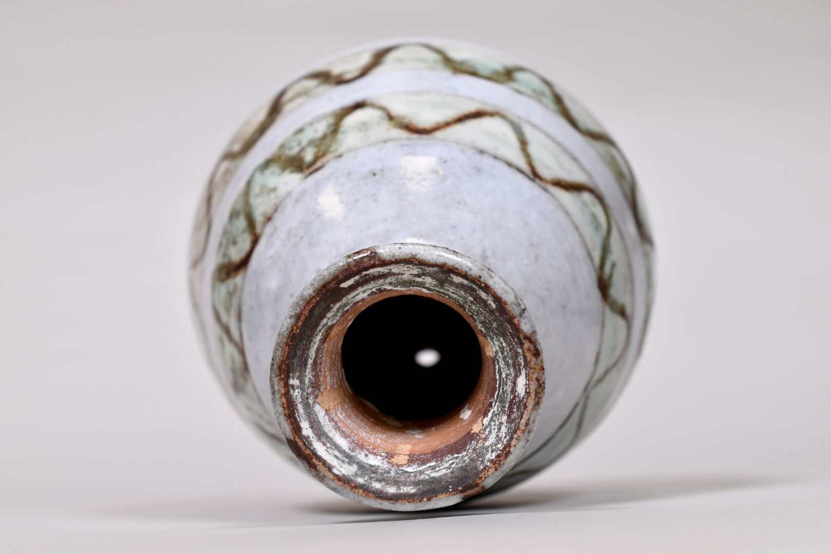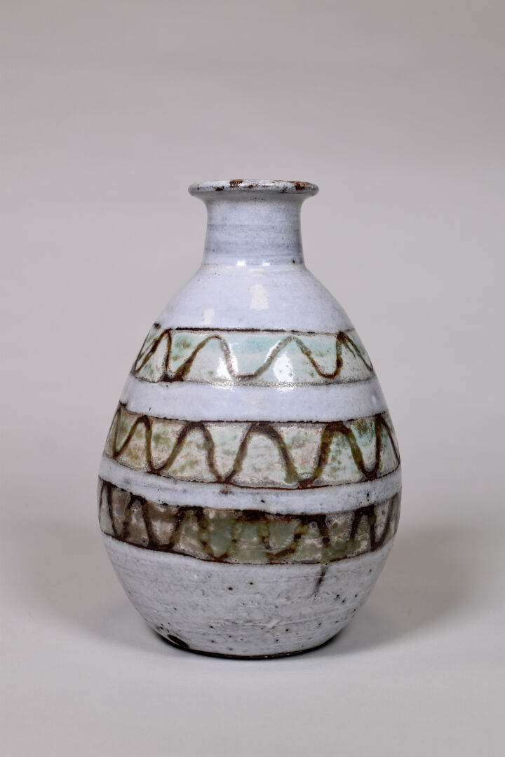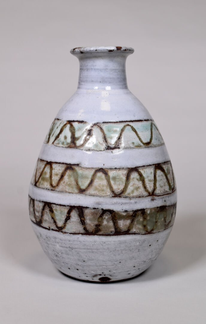 ANTOINE VALLAURIS. Vase bulbe en céramique émaillée crème à bandes vertes. Marqué au dessous. XXe siècle. Haut. : 24,5 cm.