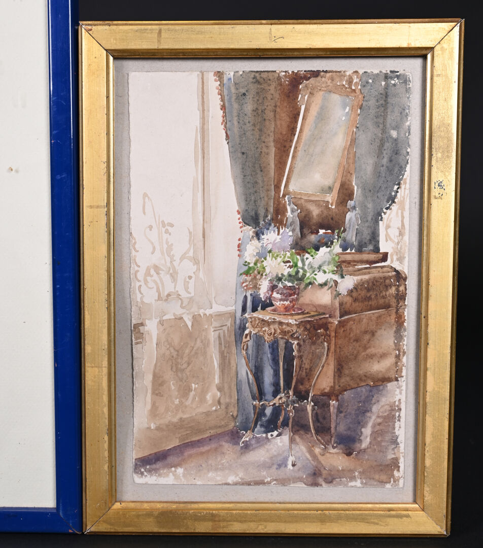 Antoinette MONTET-NOGANETS (XIXe siècle). Deux intérieurs bourgeois. Aquarelles, une signée en bas à gauche (mouillures, légèrement gondolées). 38,5 x 27,5 cm et 24 x 16 cm.