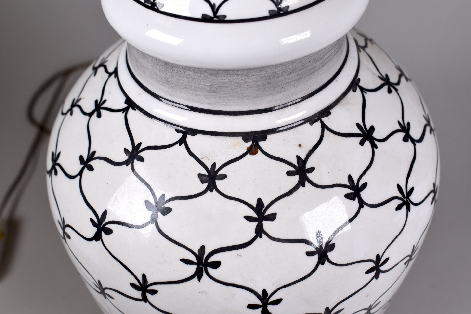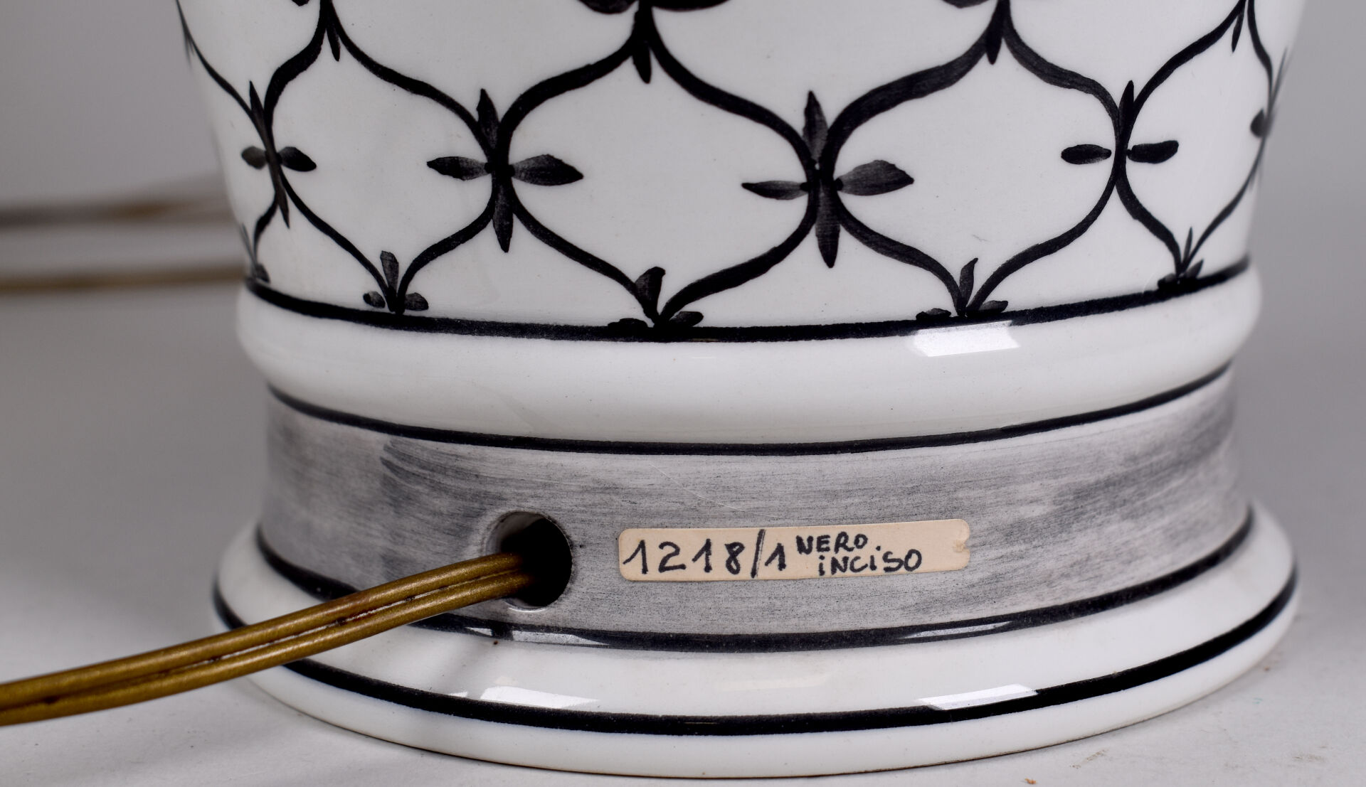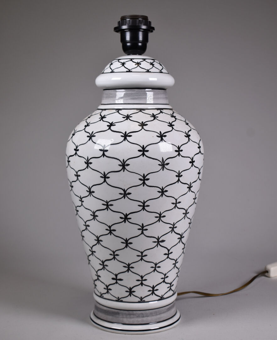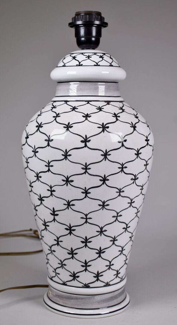 ANTONIO ZEN. Lampe balustre en porcelaine noir et blanche à décor de motifs géométriques. Haut. : 44 cm.