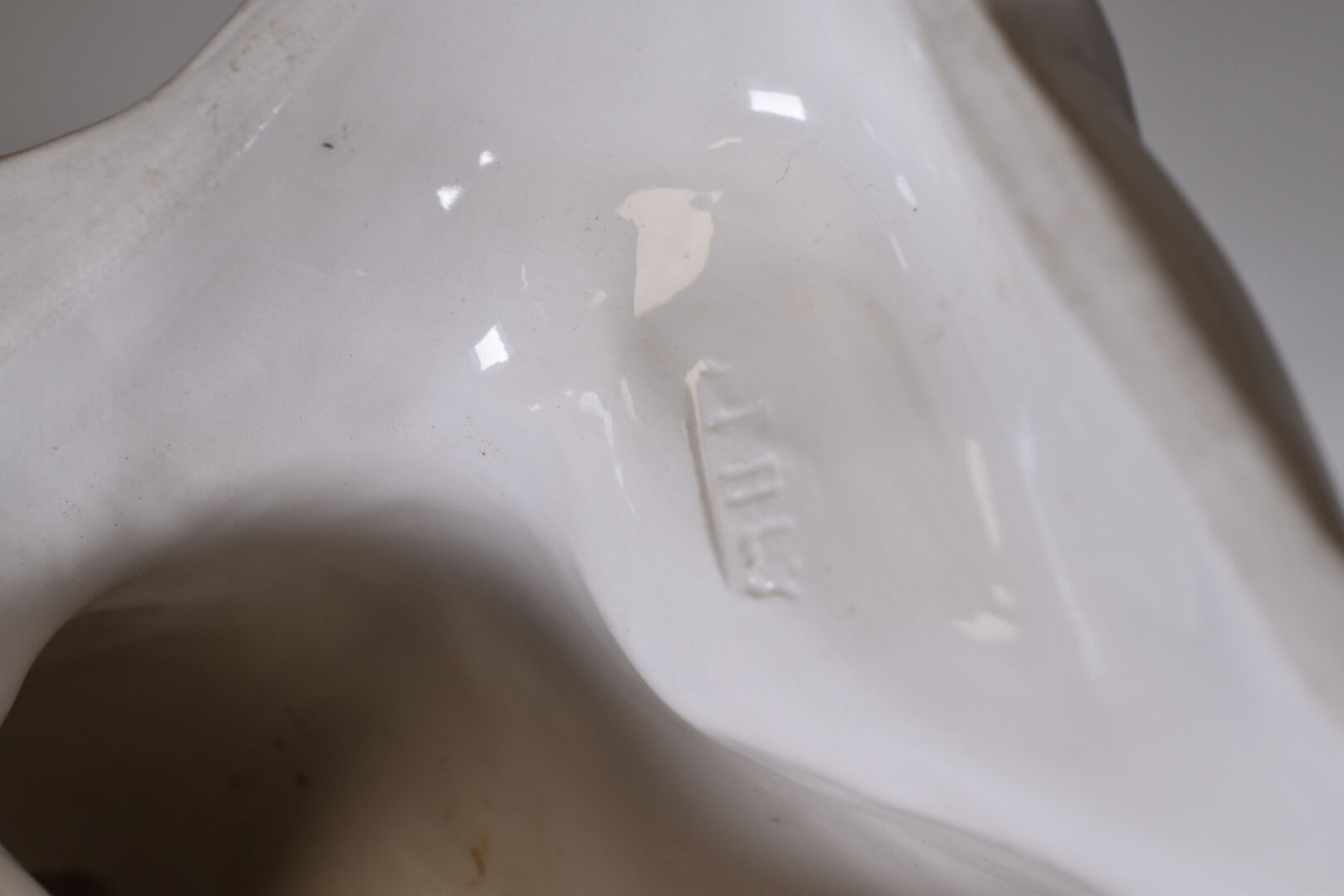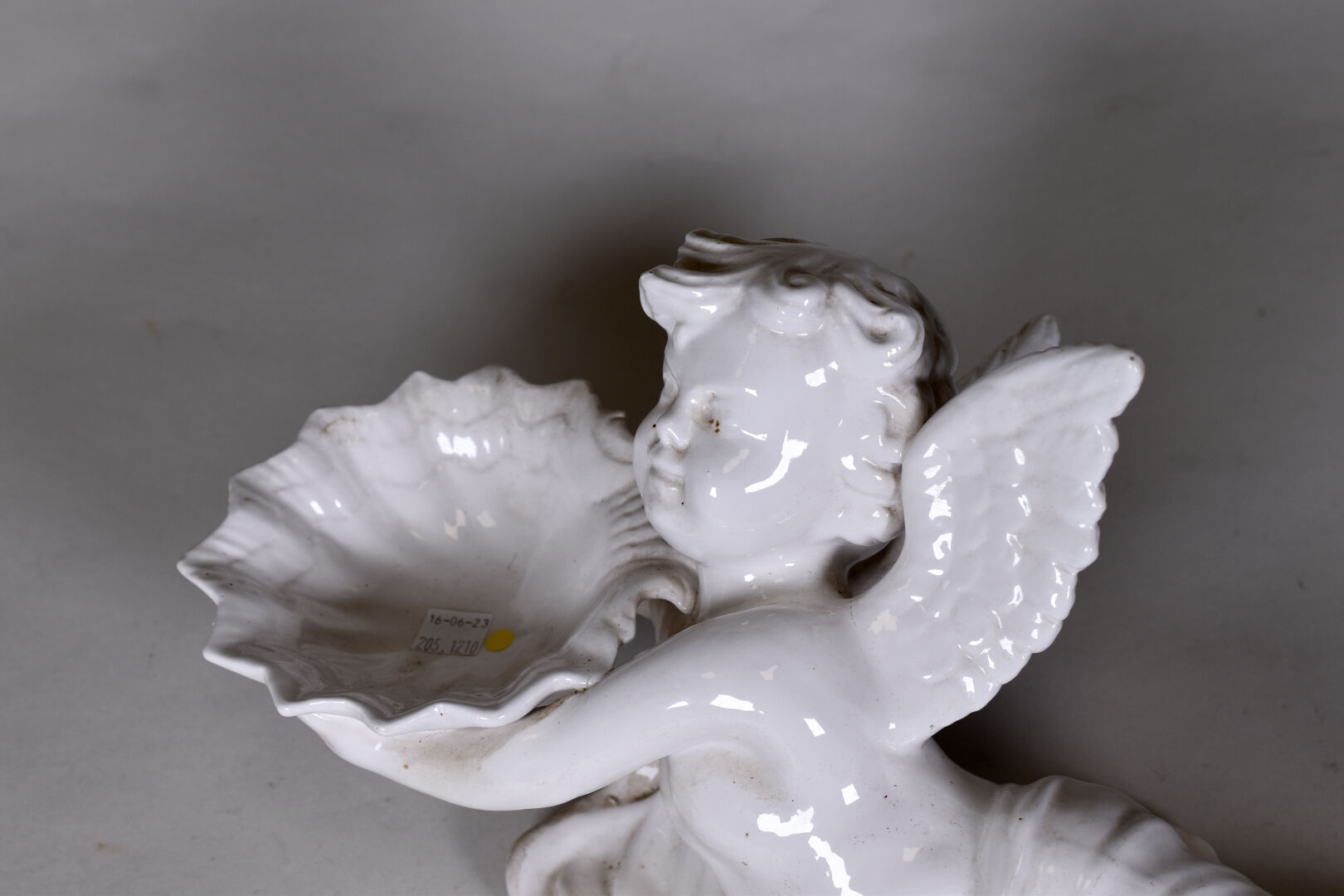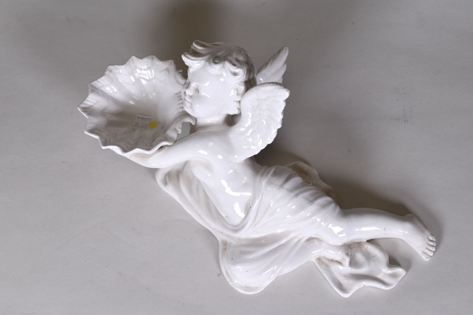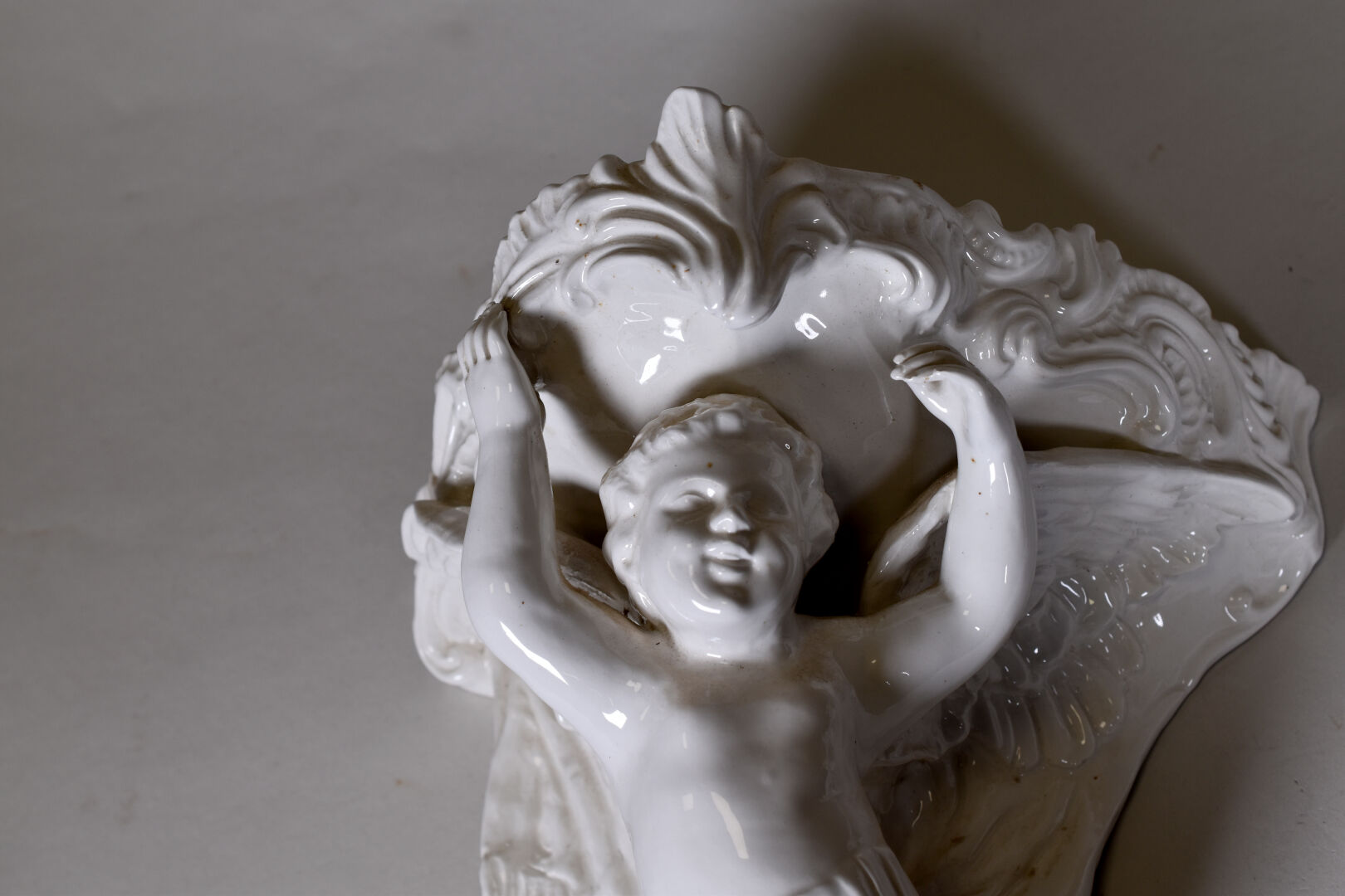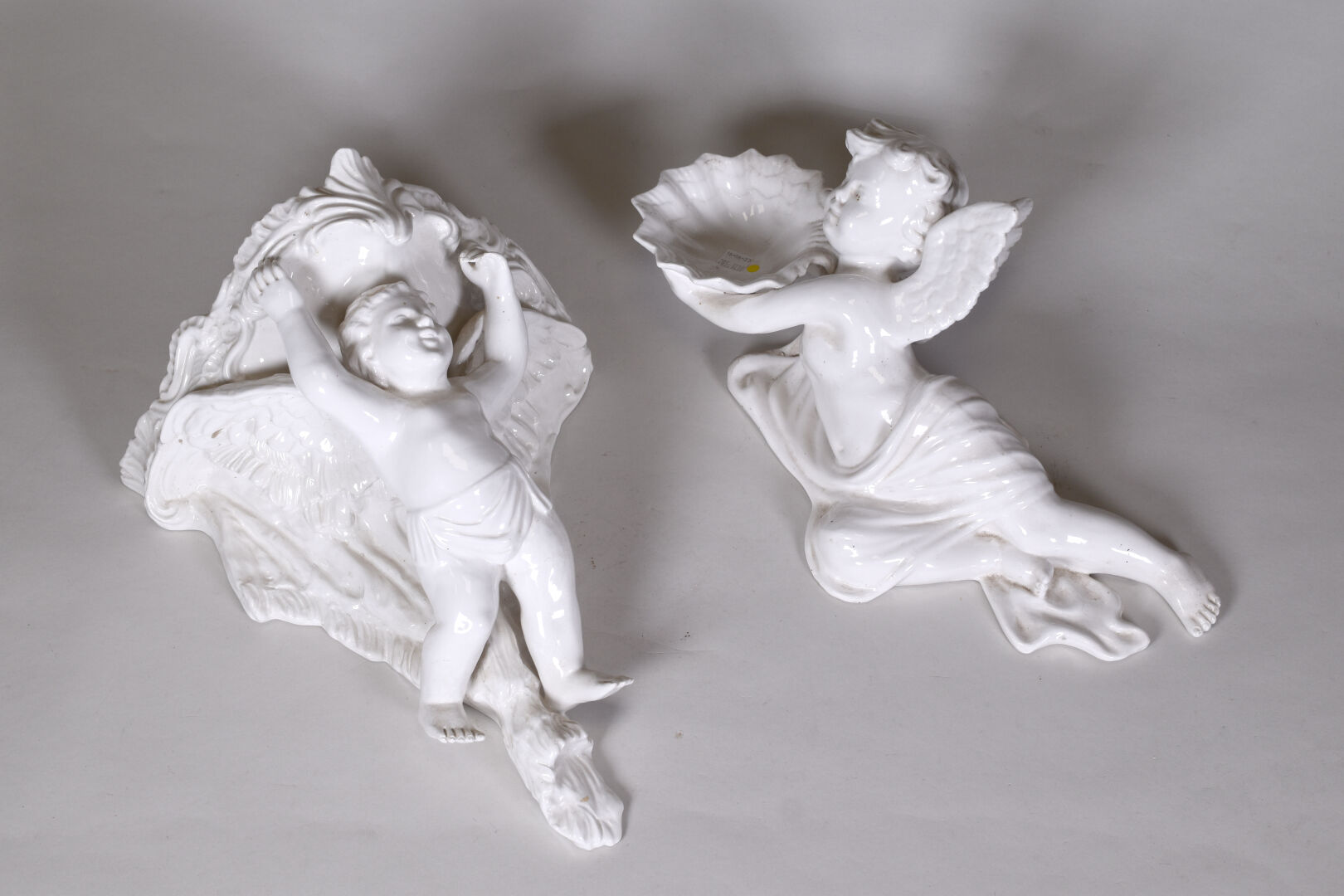 ANTONIO ZEN – NOVE (1895 – 1970). Ensemble en céramique blanche soit une console ornée d’un angelot et un surtout de table figurant un angelot tenant une coquille. DIm. console : Haut. : 37 cm – Larg. : 32 cm – Prof. : 21,5 cm et Dim. surtout : Haut. : 20 cm – Larg. : 44 cm – Prof. : 28 cm.