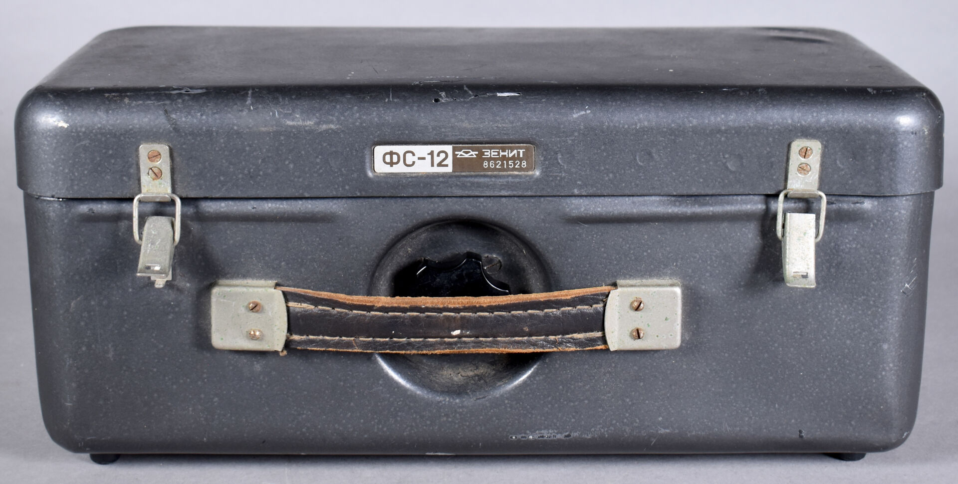 Appareil photo ZENIT modèle 12C avec plusieurs filtres, un objectif, nécessaire de transport et sa mallette.