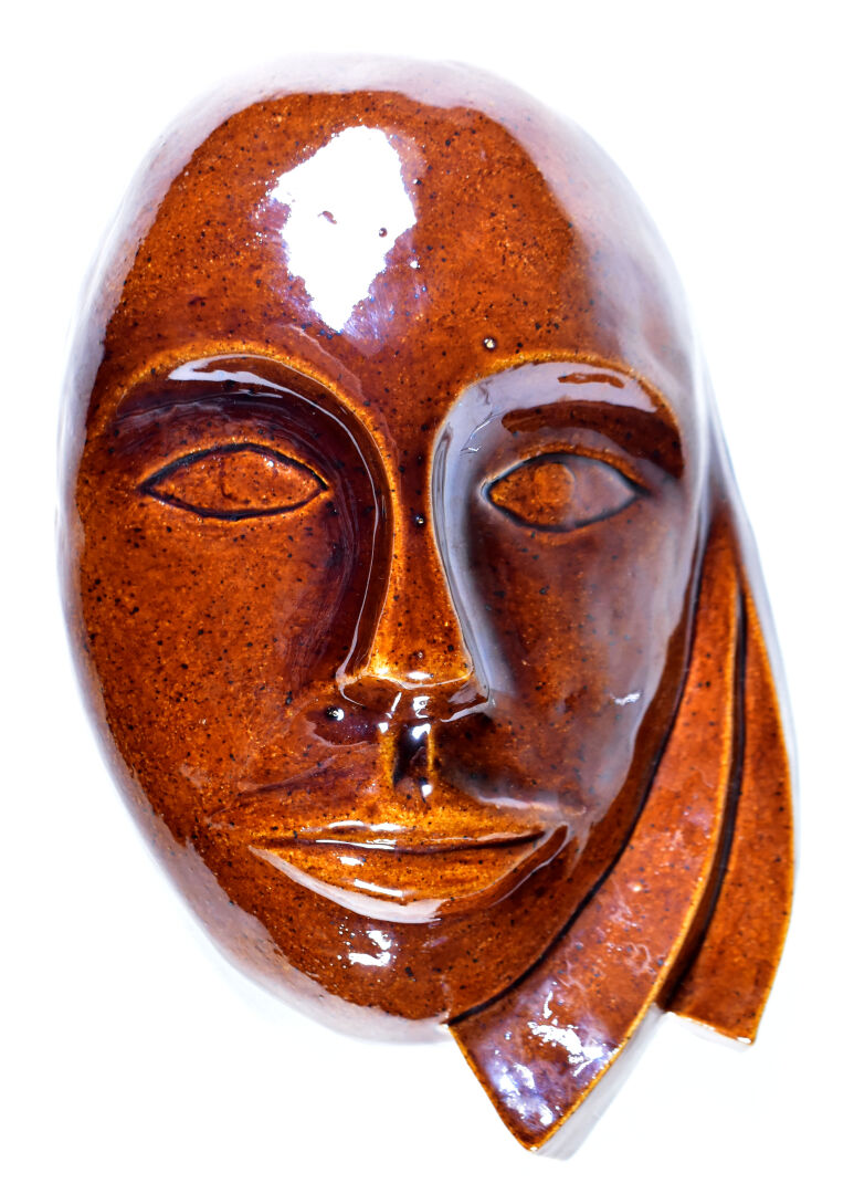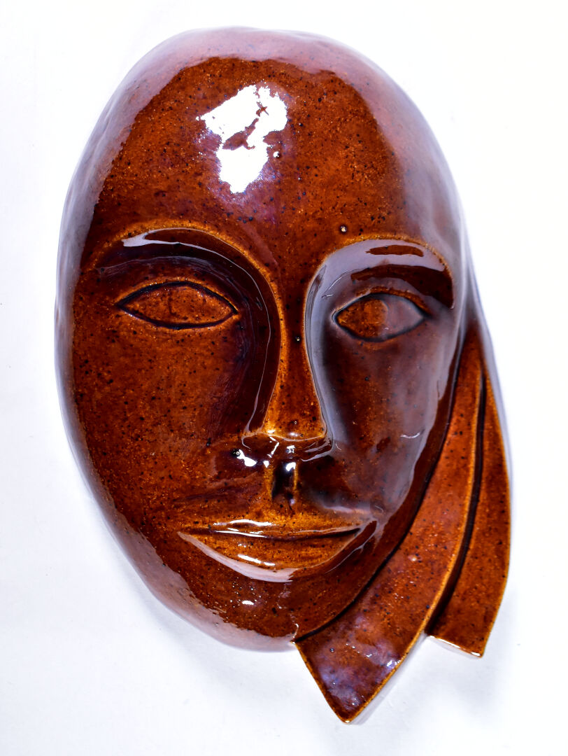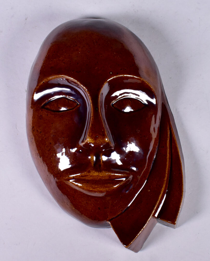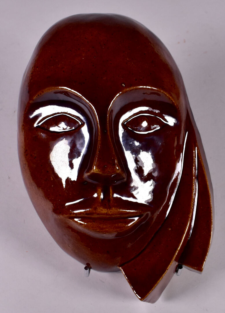 Applique en céramique émaillée chocolat représentant un masque. Monogramme JB, daté 1982. Haut. : 27 cm.