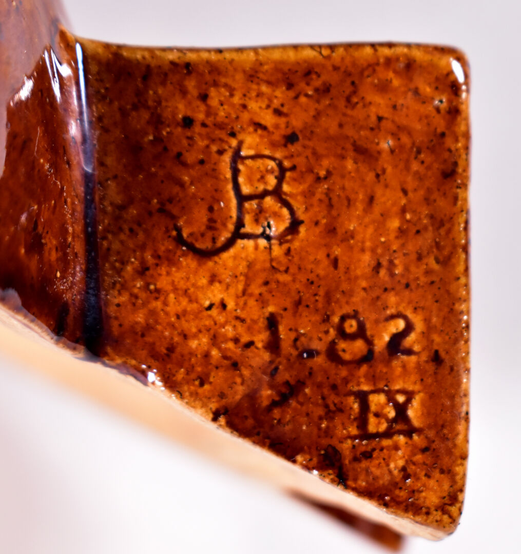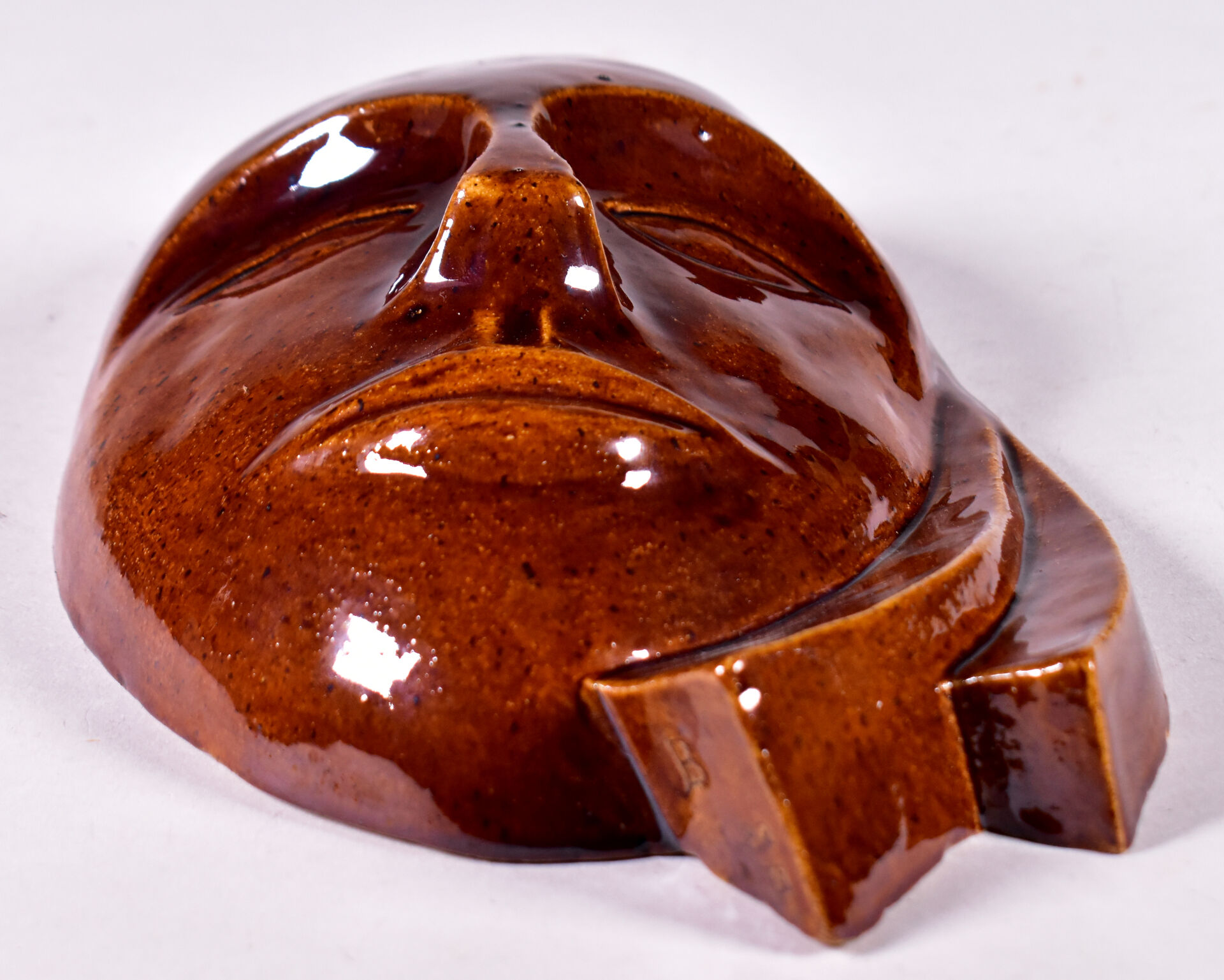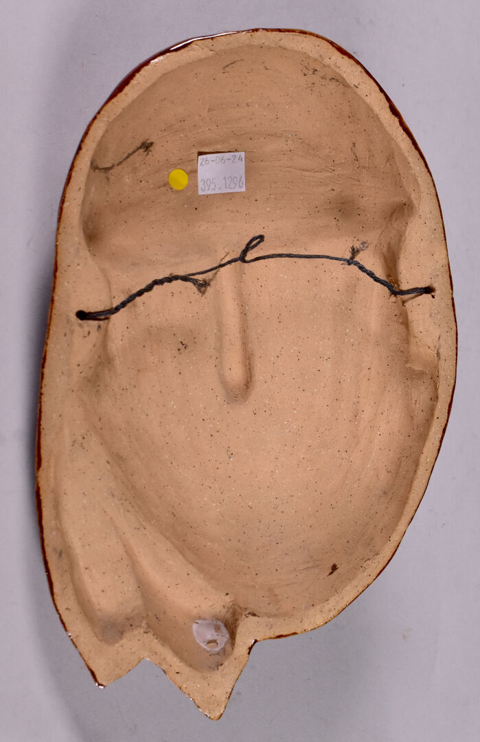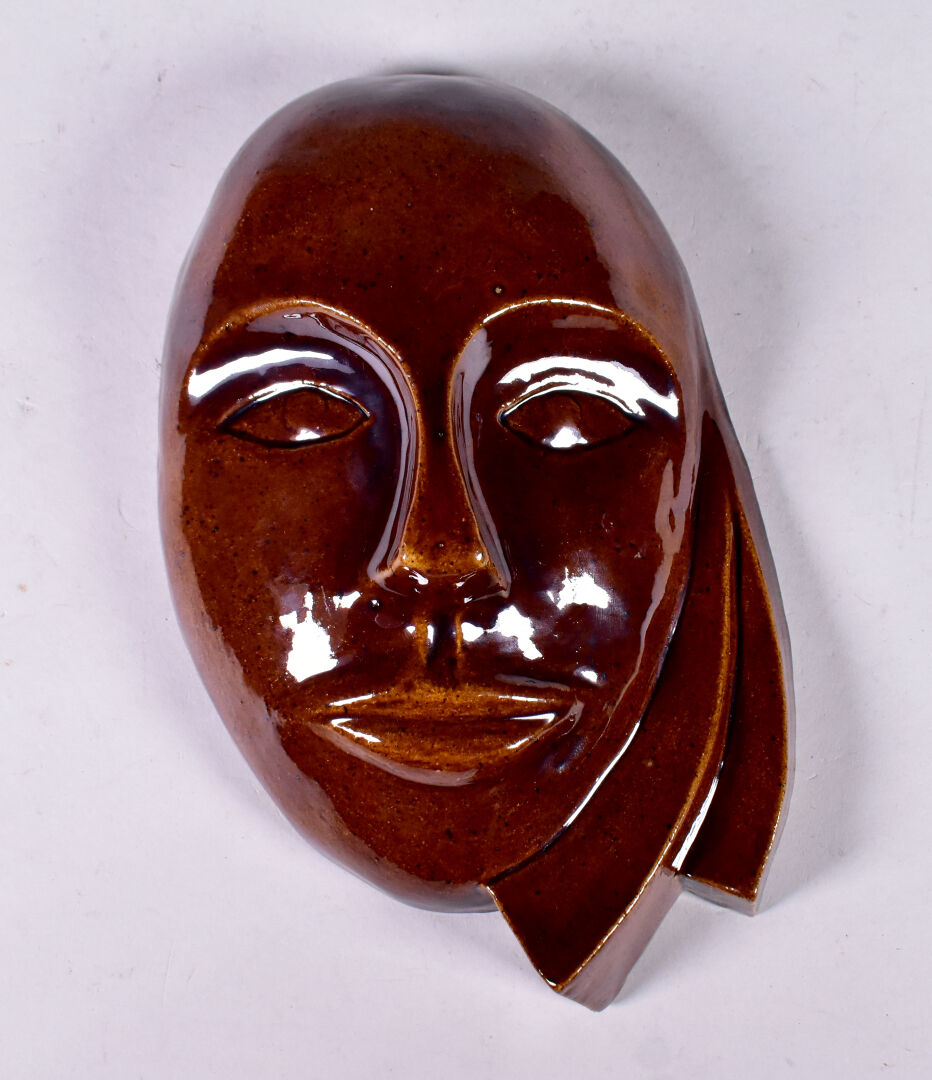 Applique en céramique émaillée chocolat représentant un masque. Monogramme JB, daté 1982. Haut. : 27 cm.