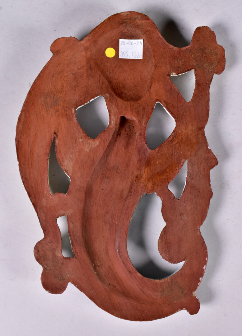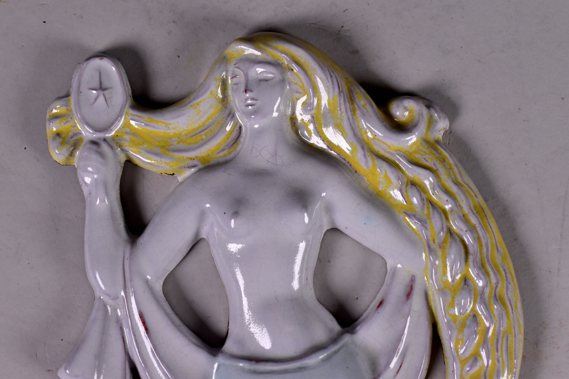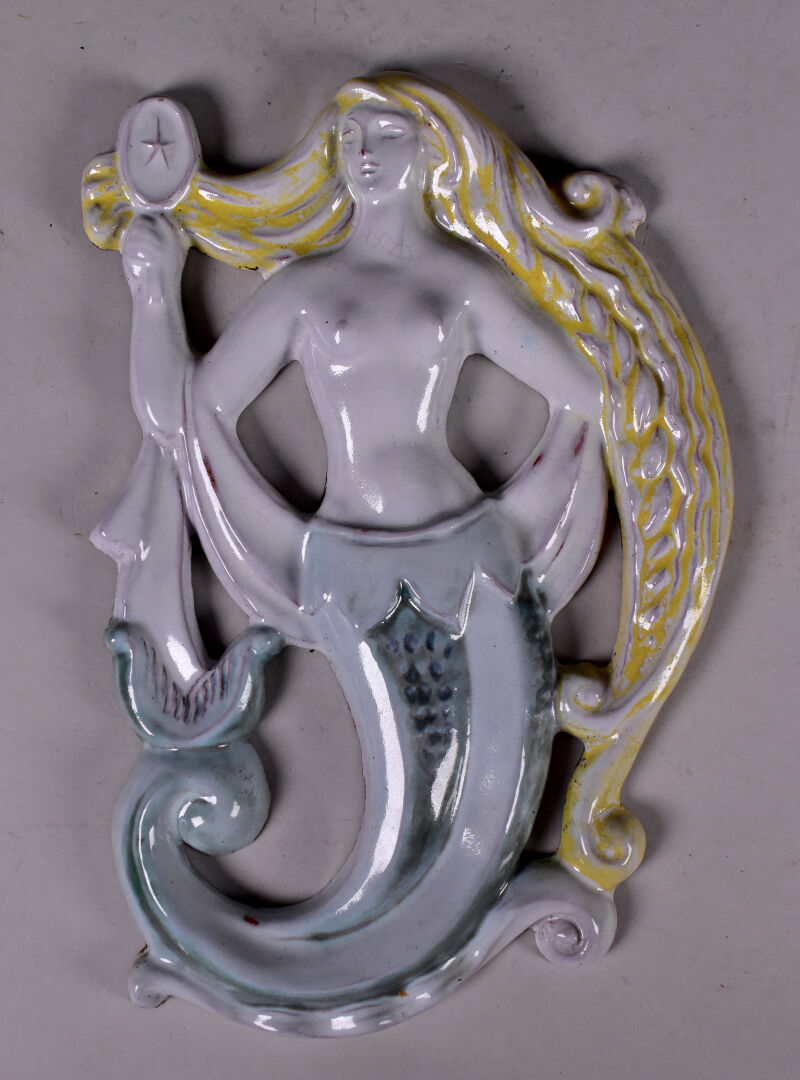 Applique en céramique émaillée en, polychromie représentant une sirène se mirant dans un face à main. Milieu du XXe siècle. Haut. : 26 cm.