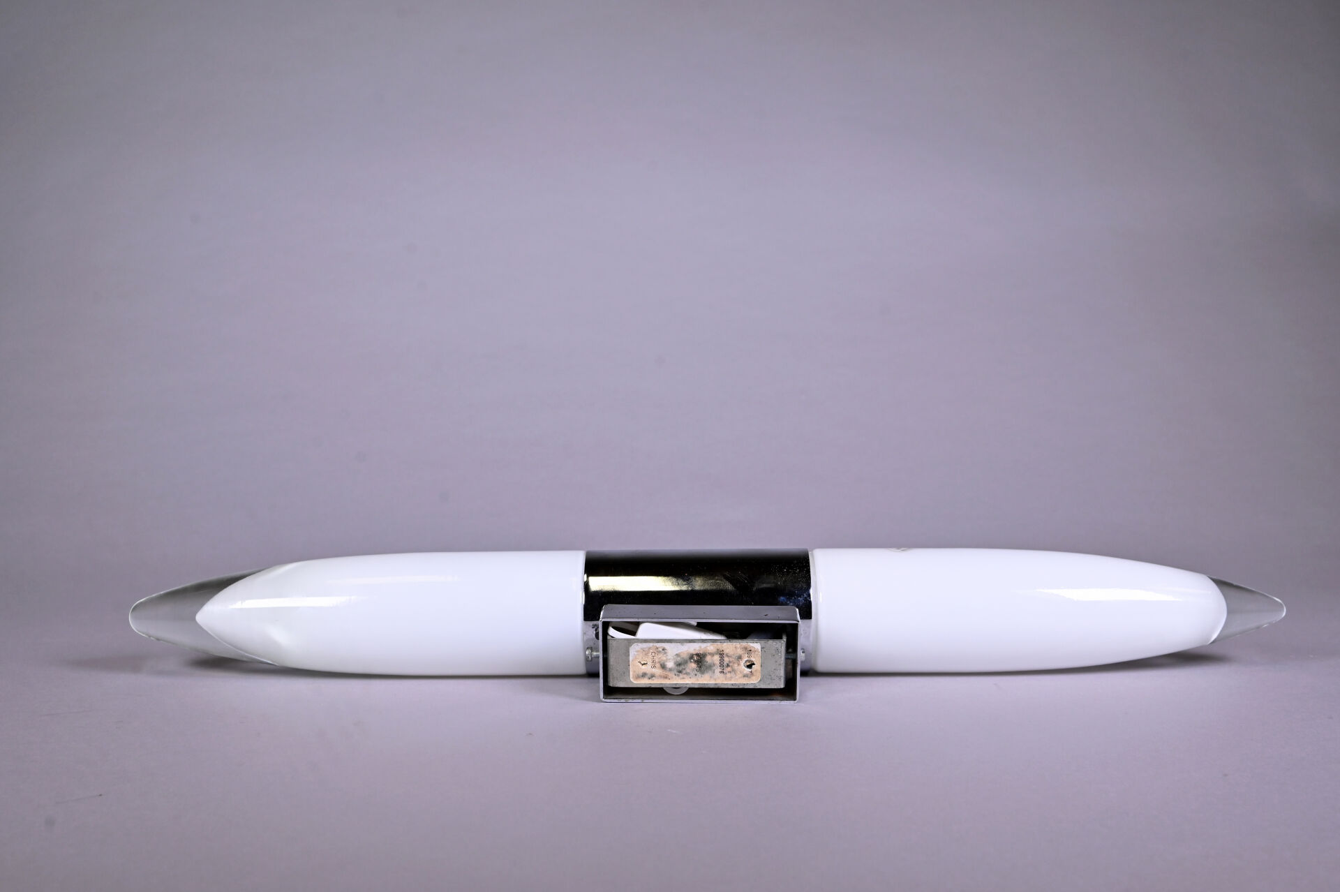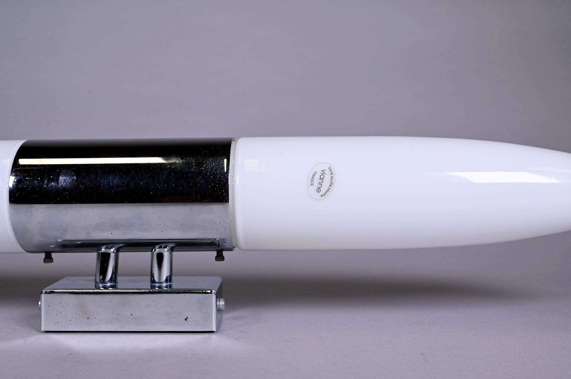 Applique « space age » en verre soufflé blanc, la monture en métal chromé (étiquette). Vianne, vers 1970/1980. Haut. : 58 cm.