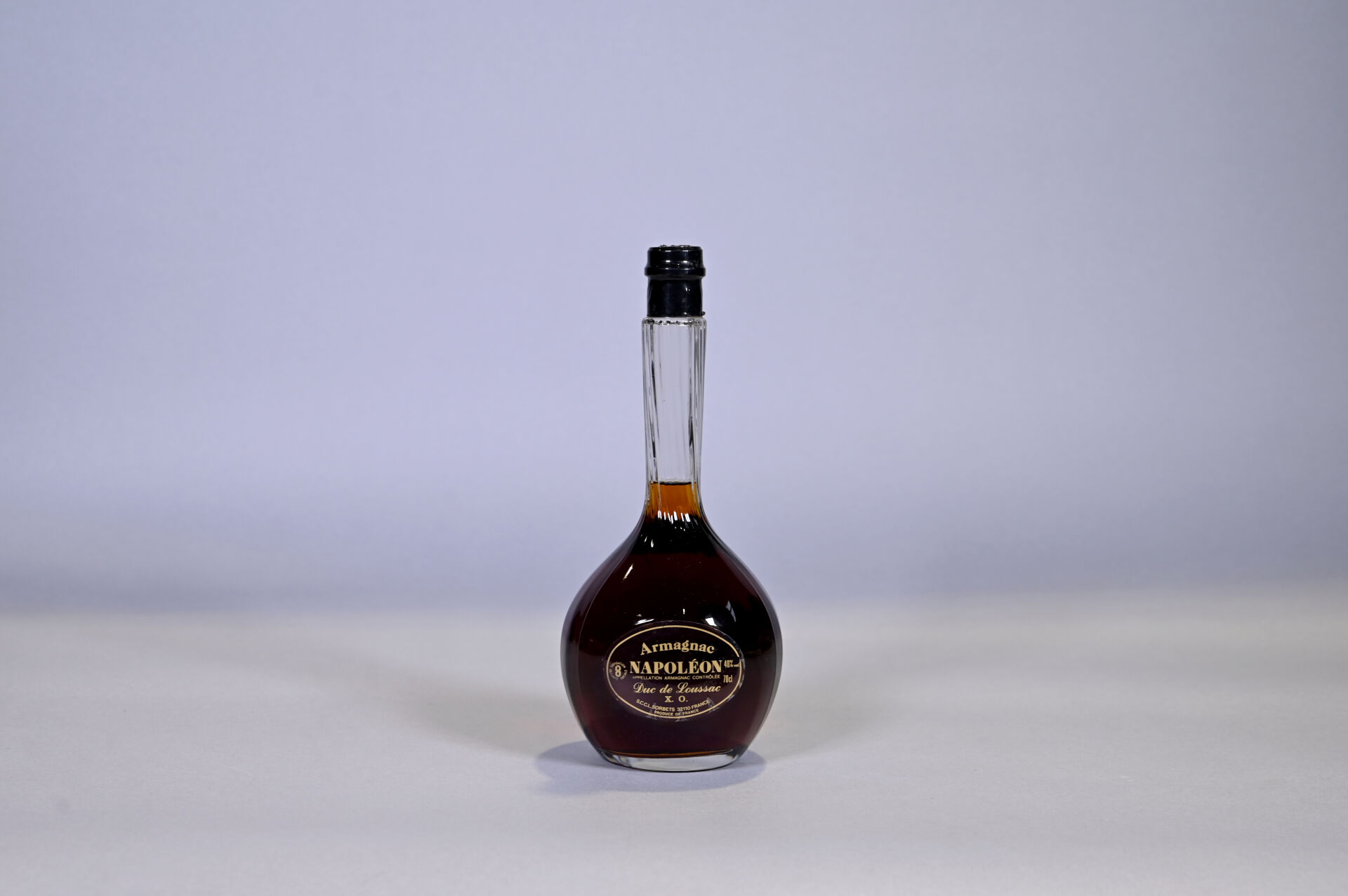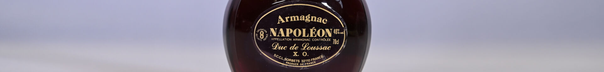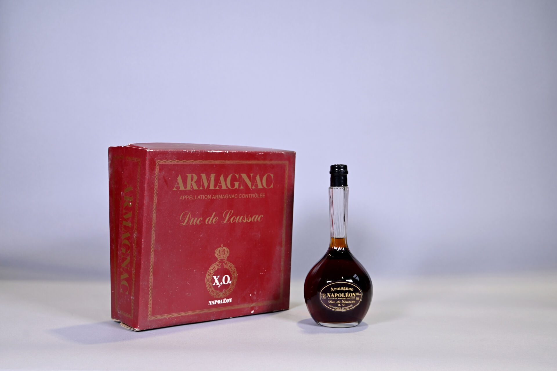 ARMAGNAC – 1 bouteille, Armagnac, Duc de Loussac, XO, Napoléon. En coffret d’origine avec ses 4 verres de dégustation. Niveau légèrement bas. Capsule sale. Etiquette avec quelques petits points de décollement.