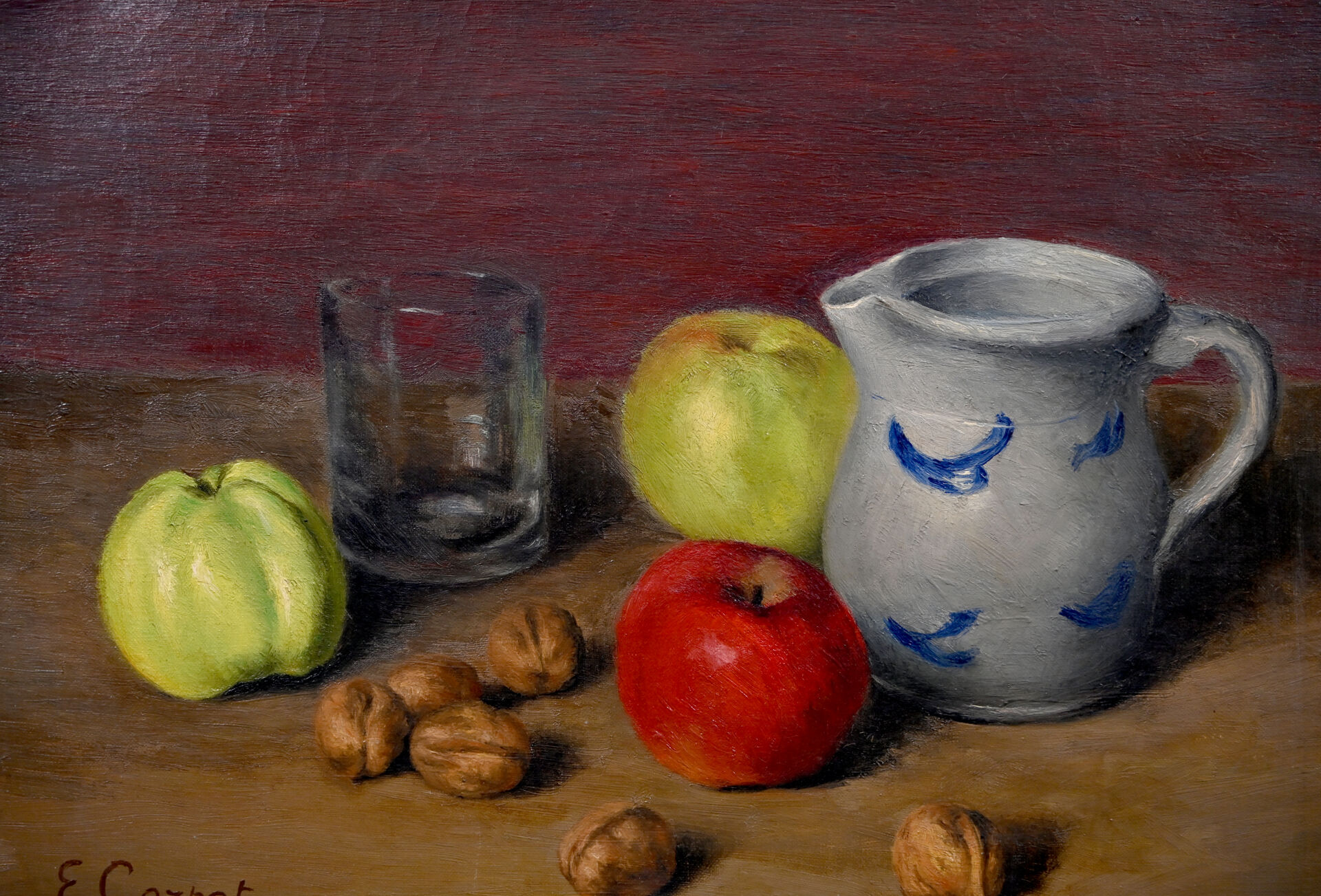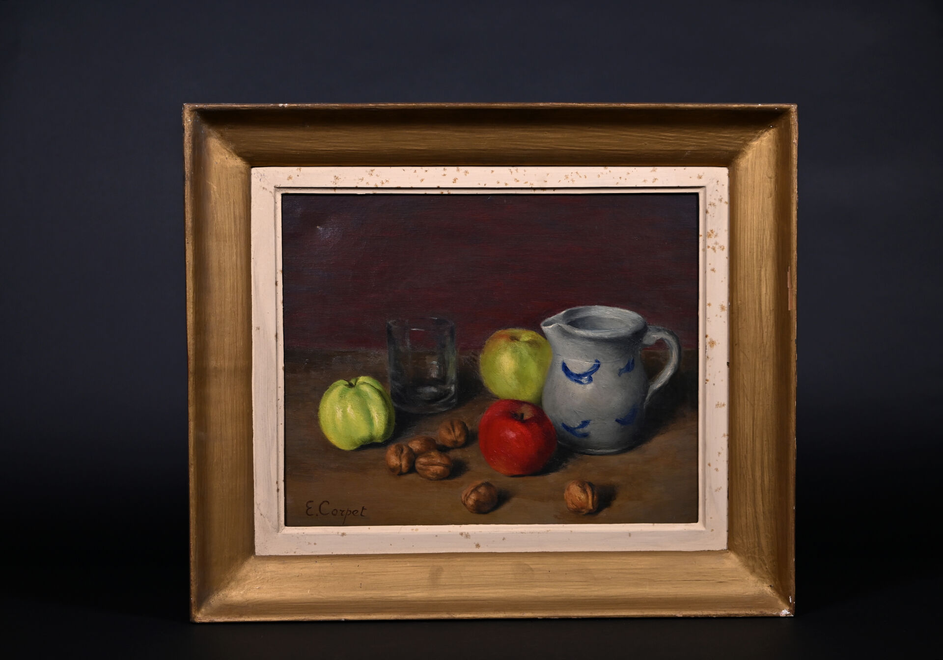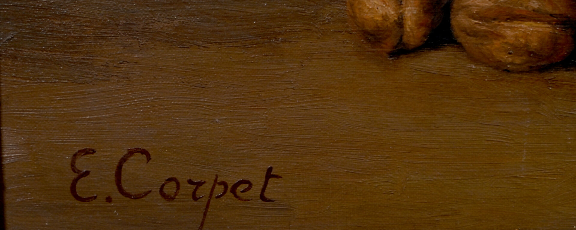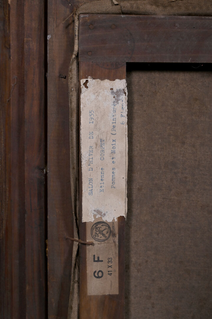 Armand Etienne CORPET (1877-1954). « Pommes et noix ». Huile sur toile signée en bas à gauche, titrée au dos avec étiquettes de salon. 33 x 41 cm.