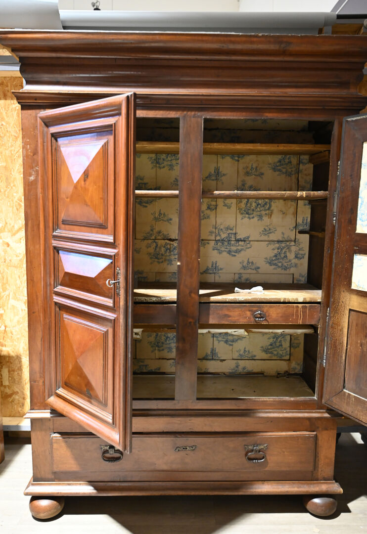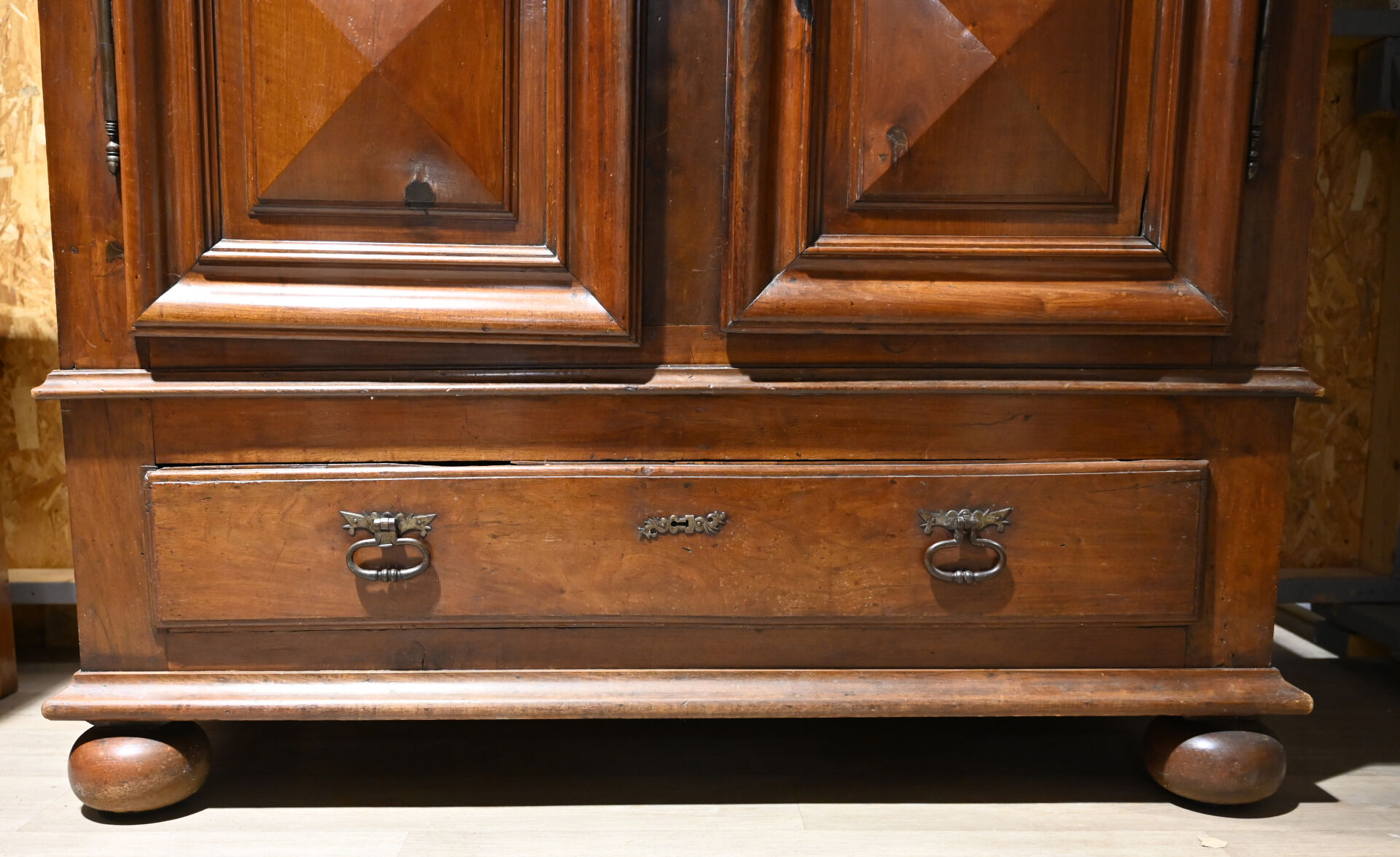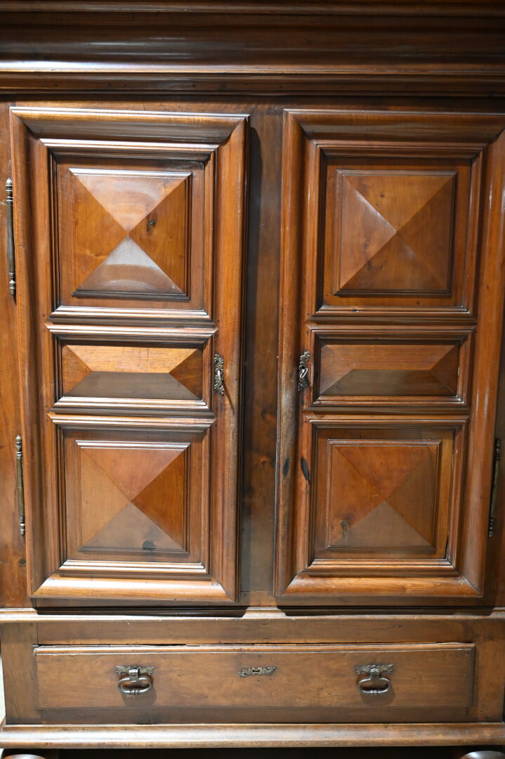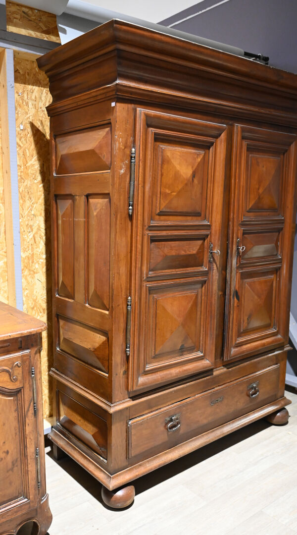 Armoire en noyer mouluré sculpté de pointes de diamant ouvrant à deux portes et un tiroir en partie basse (usures d’usage, restaurations). Style Louis XIII. Haut. : 232 cm – Larg. : 163 cm – Prof. : 67 cm.