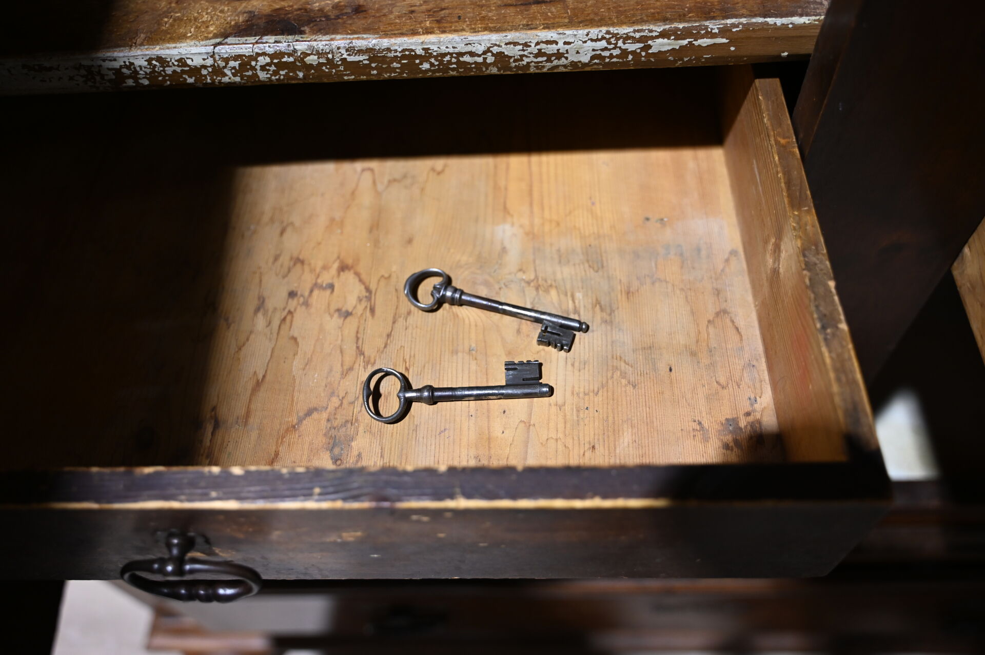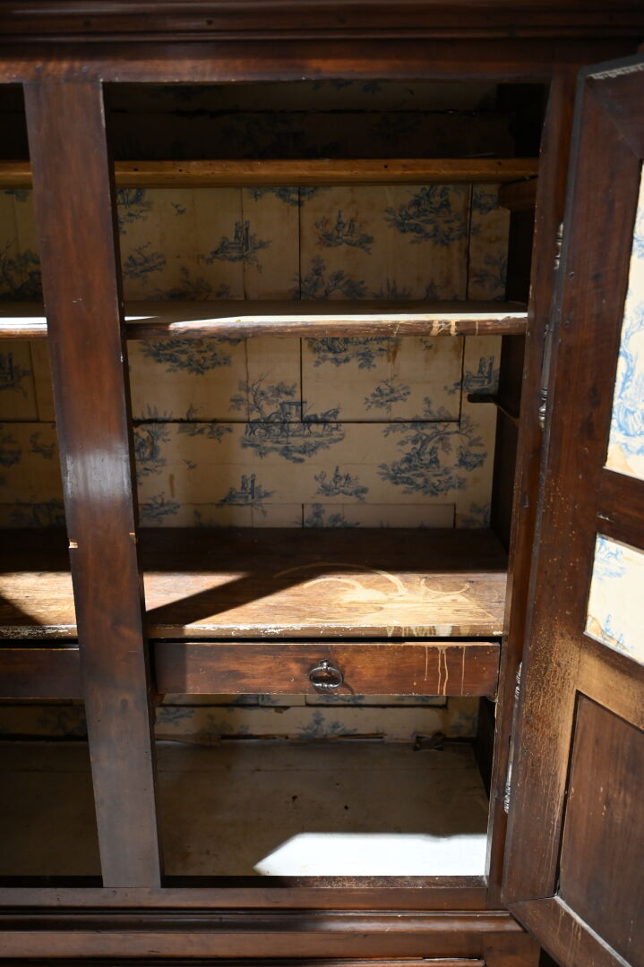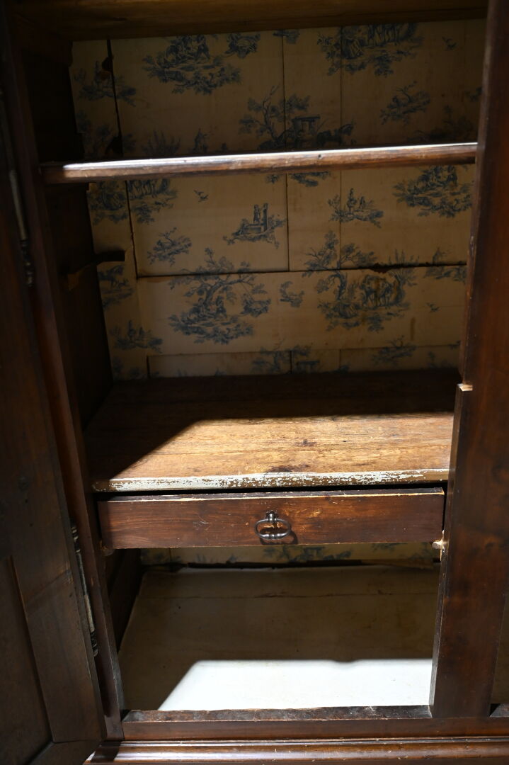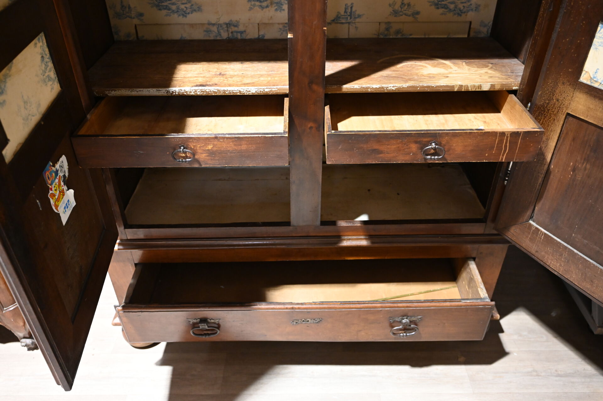 Armoire en noyer mouluré sculpté de pointes de diamant ouvrant à deux portes et un tiroir en partie basse (usures d’usage, restaurations). Style Louis XIII. Haut. : 232 cm – Larg. : 163 cm – Prof. : 67 cm.