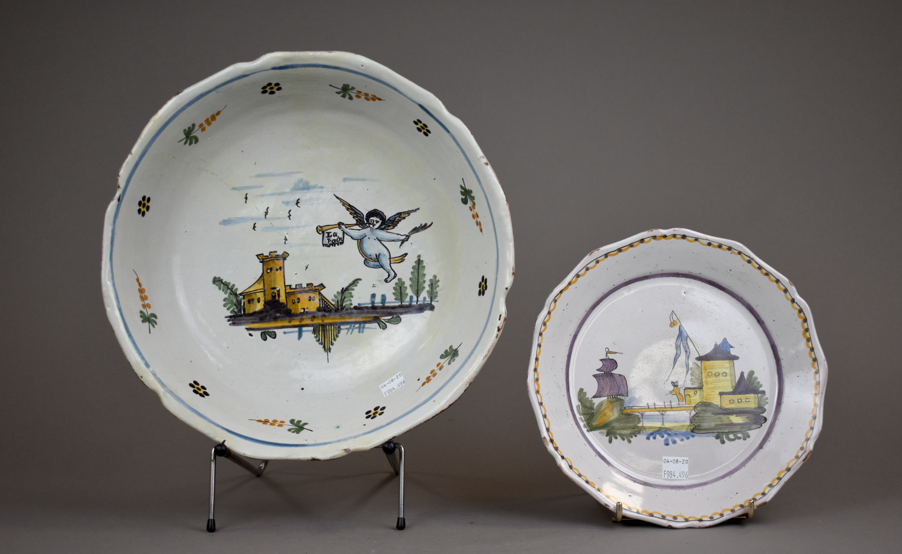 Assiette et plat creux en faïence dans le goût de Nevers (accidents restaurés). XIXe siècle. Diam. plat : 30 cm.