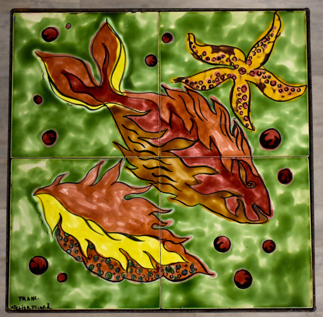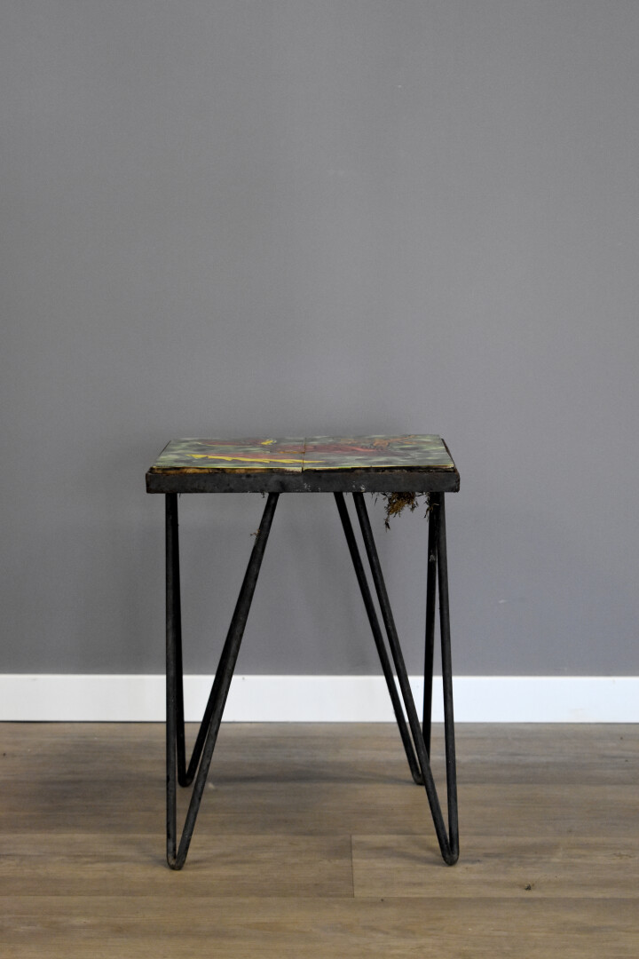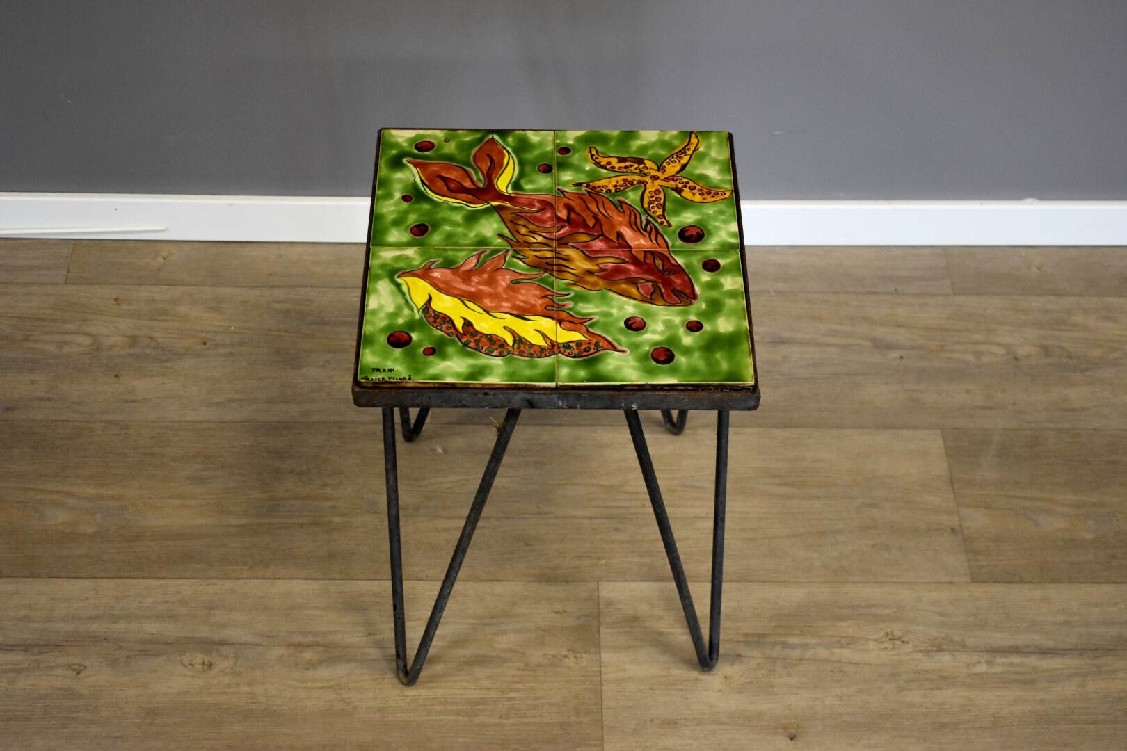 ATELIER PICARD. Petite table à pietement en métal laqué noir, le plateau à quatre carreaux de céramique émaillés en polychromie de poisson sur fond vert (usures). Milieu du XXe siècle. Haut. : 41,5 cm – Plateau : 31,5 x 31,5 cm.