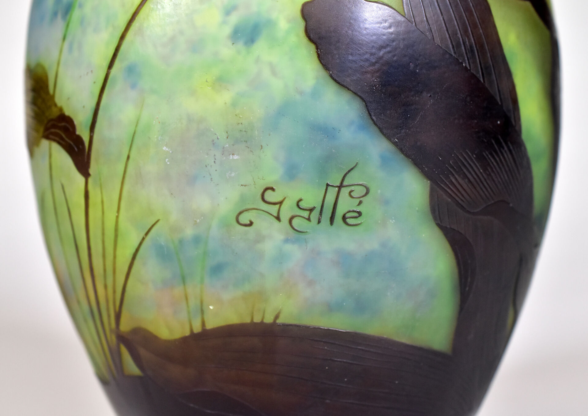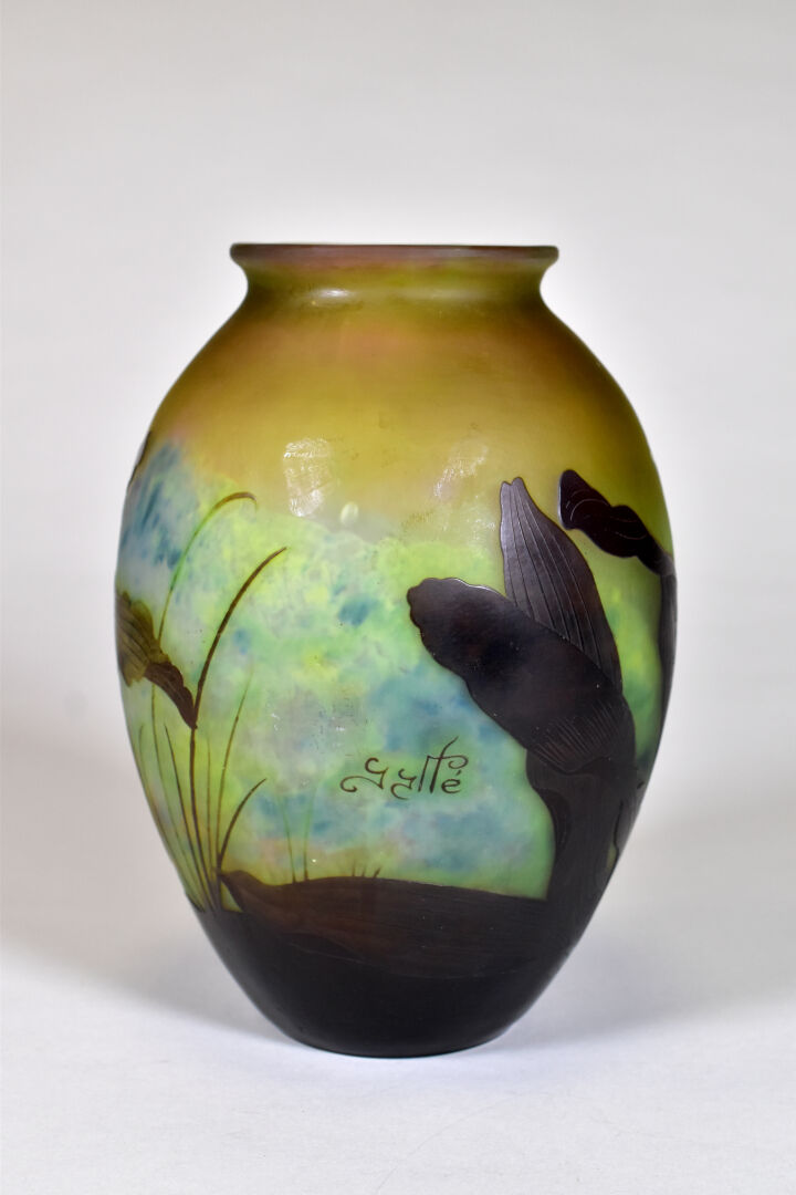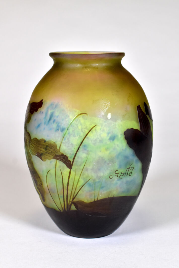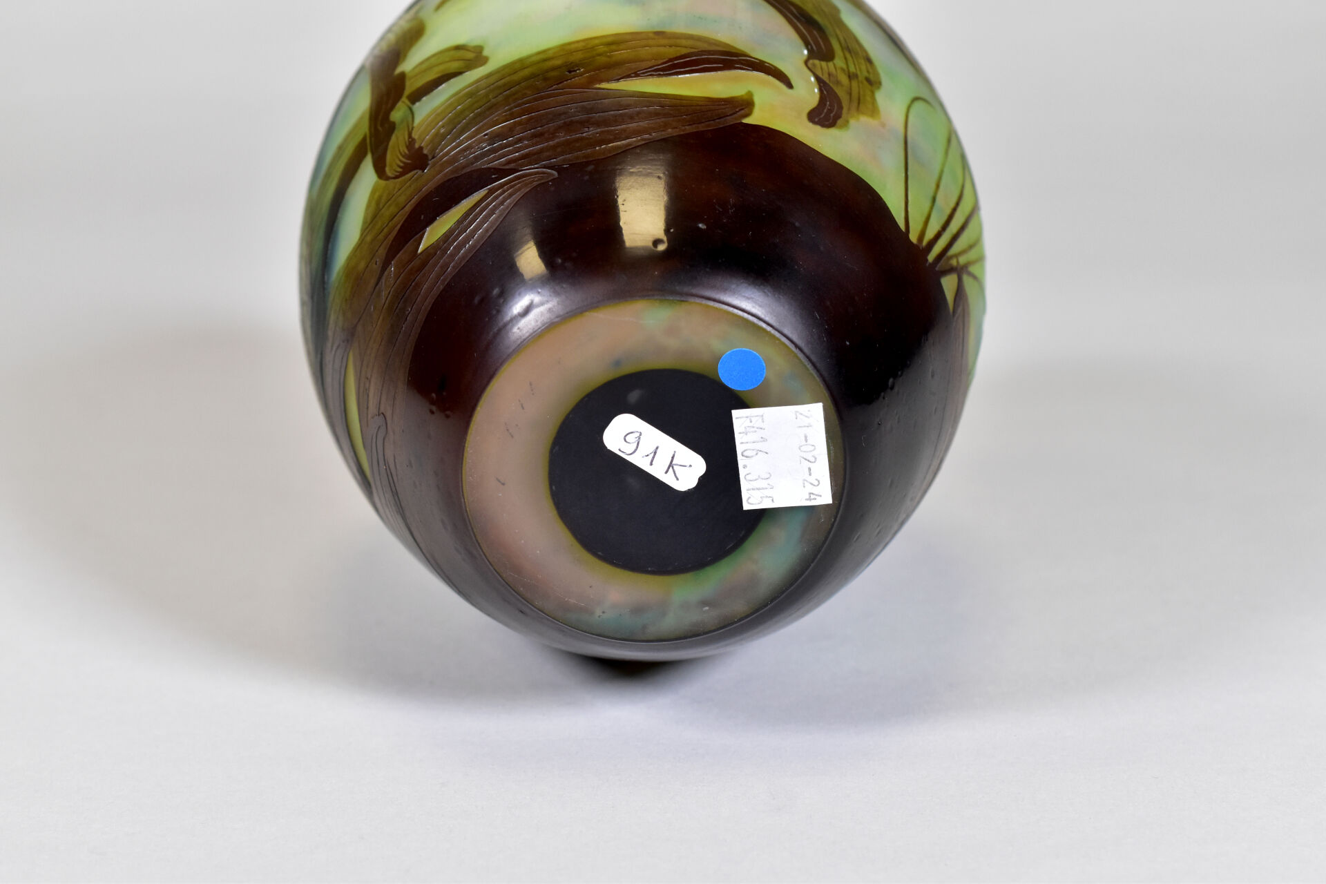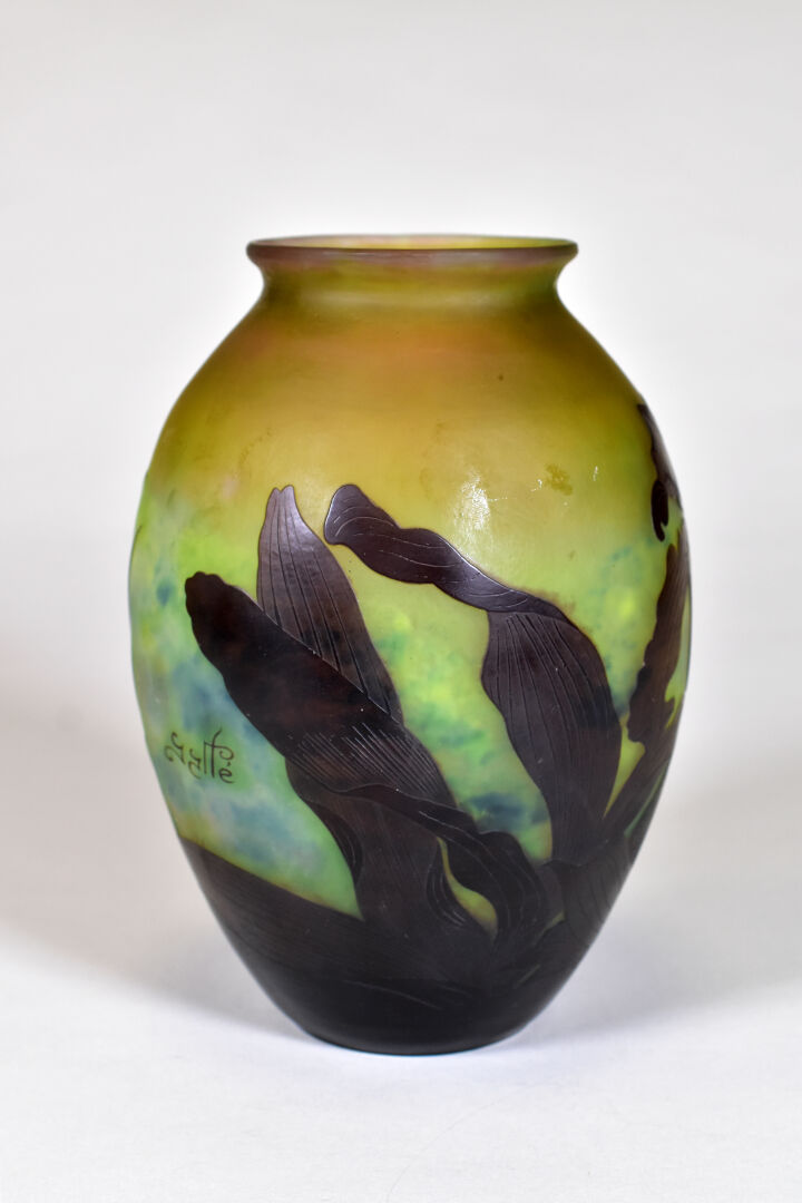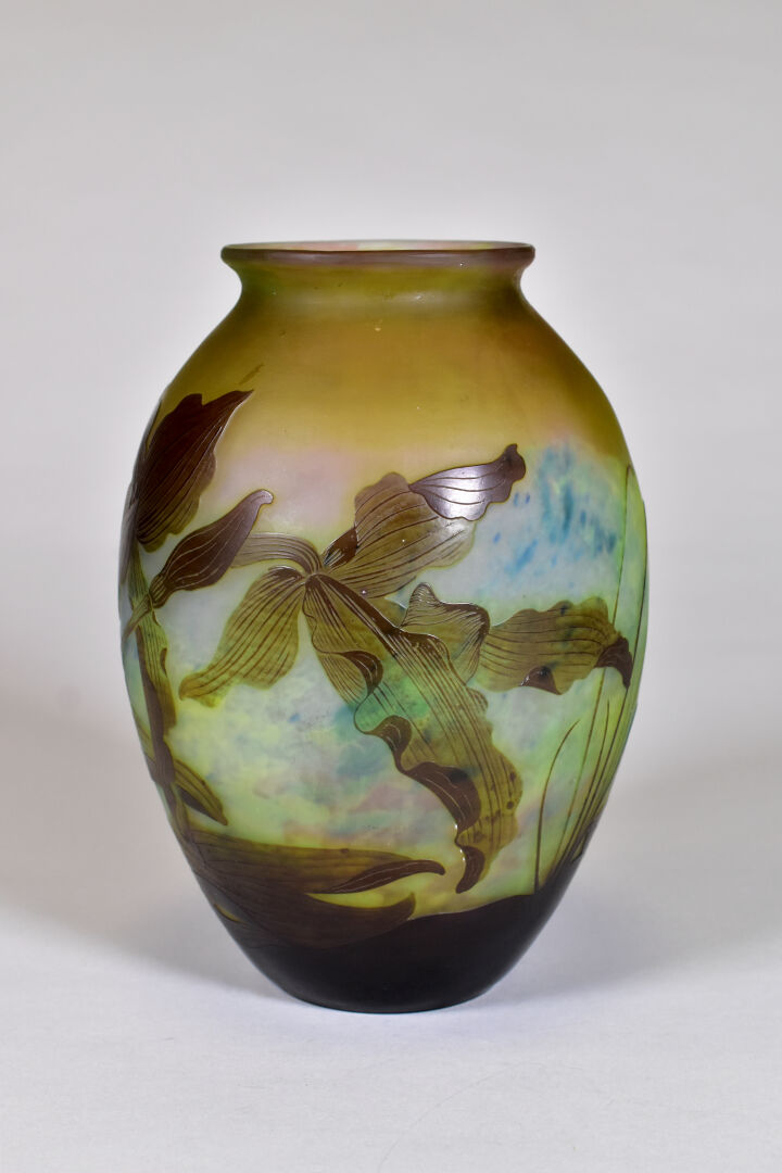 Ateliers Émile GALLÉ. Vase ovoïde en verre multicouche à décor dégagé à l’acide d’orchidées en brun sur fond marmoréen jaune, vert et bleu. Signé. Haut. : 22 cm.