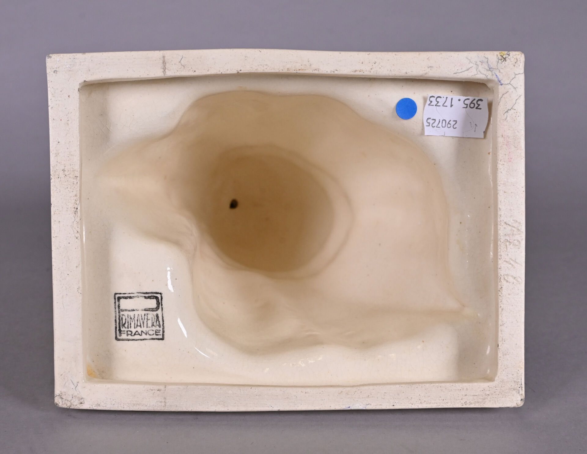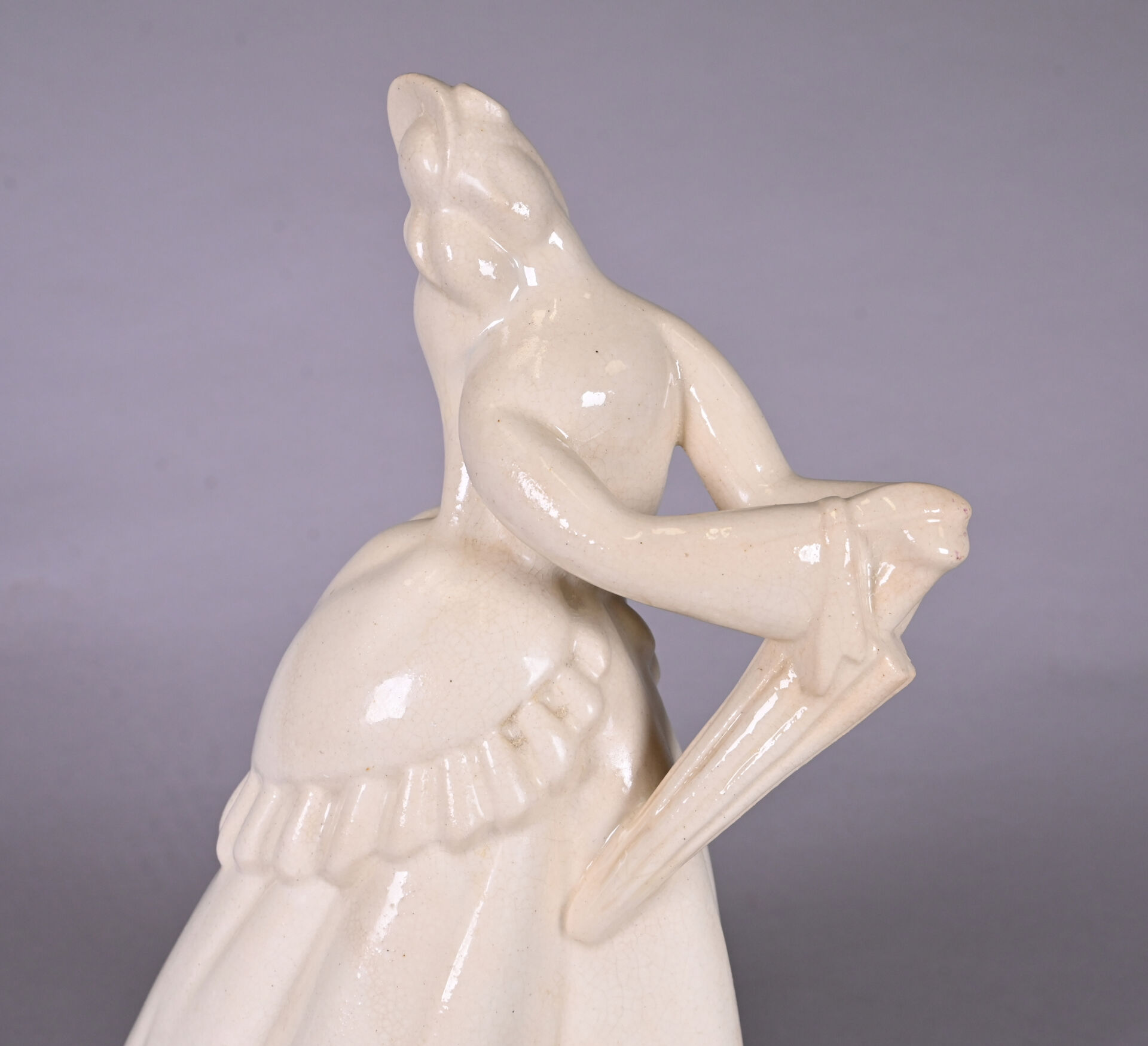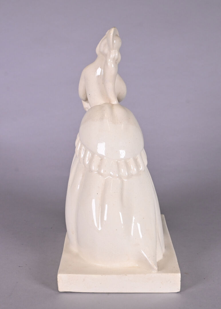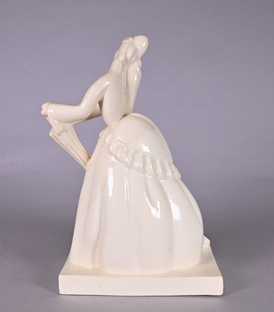 ATELIERS PRIMAVERA. Elegante à l’ombrelle en céramique émaillée crème légèrement craquelée. Vers 1930. Marquée au dessous. Haut. : 30 cm.