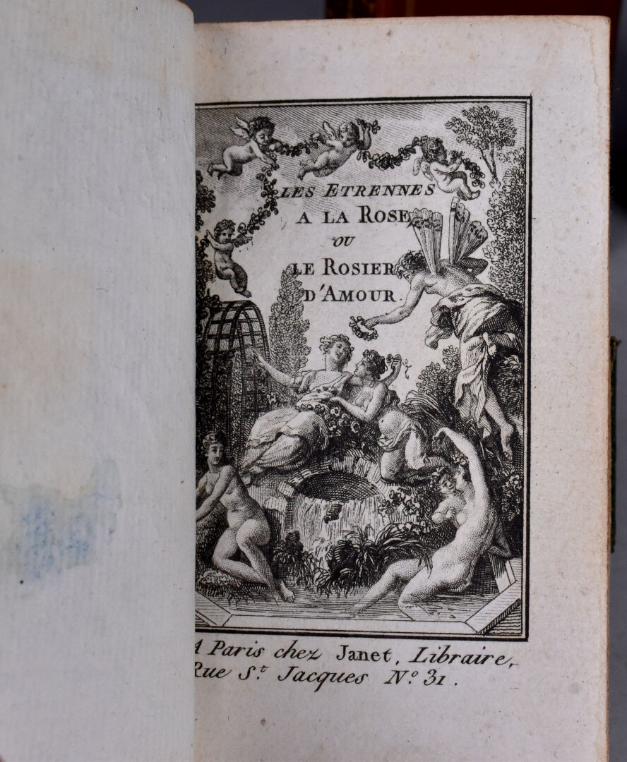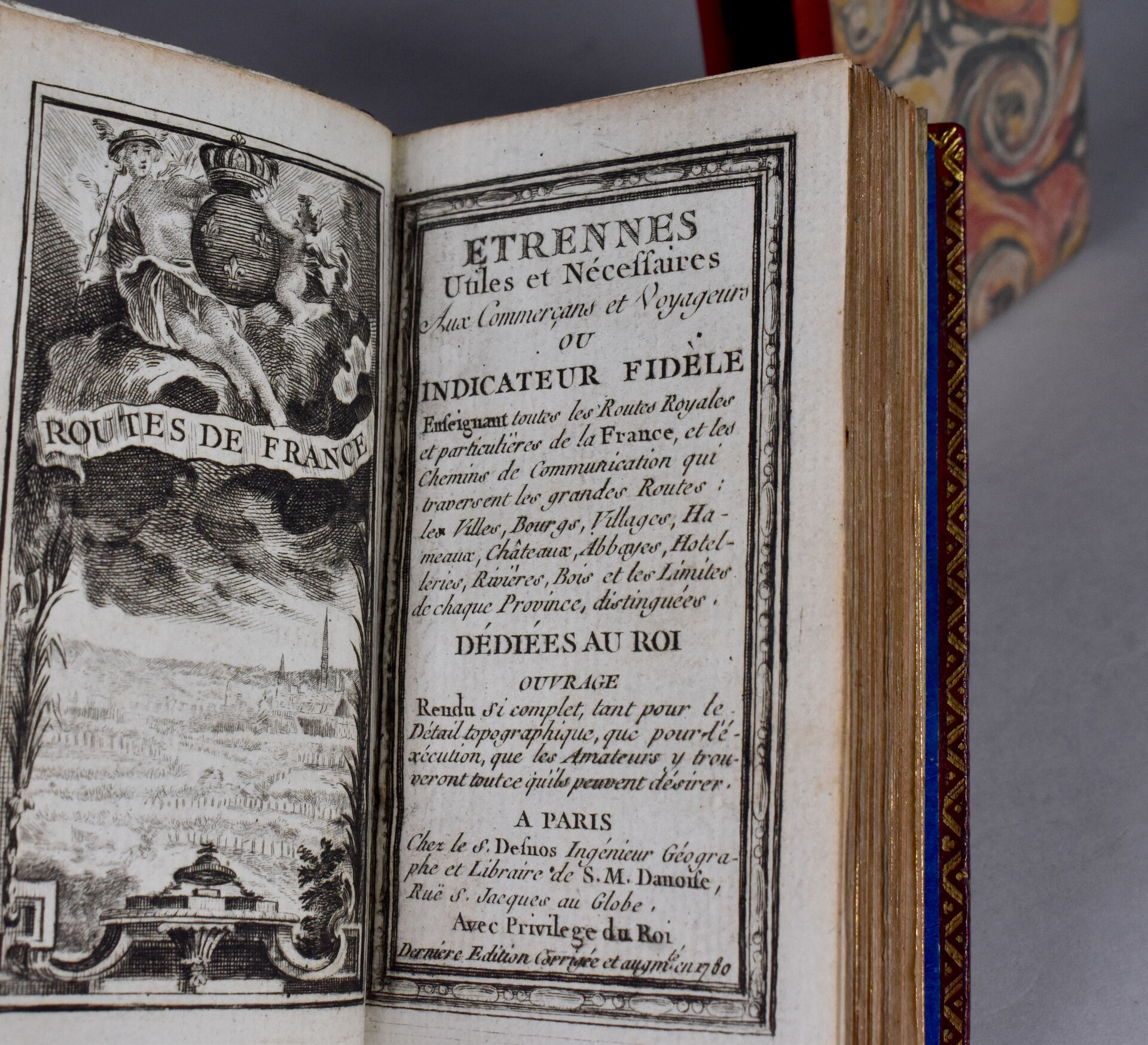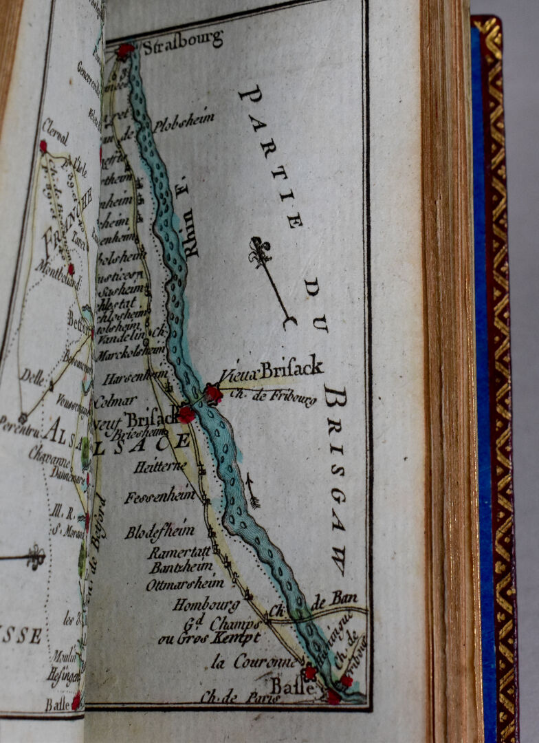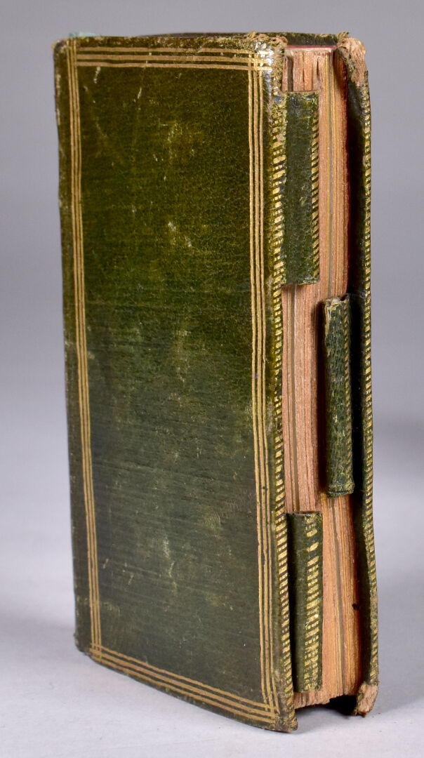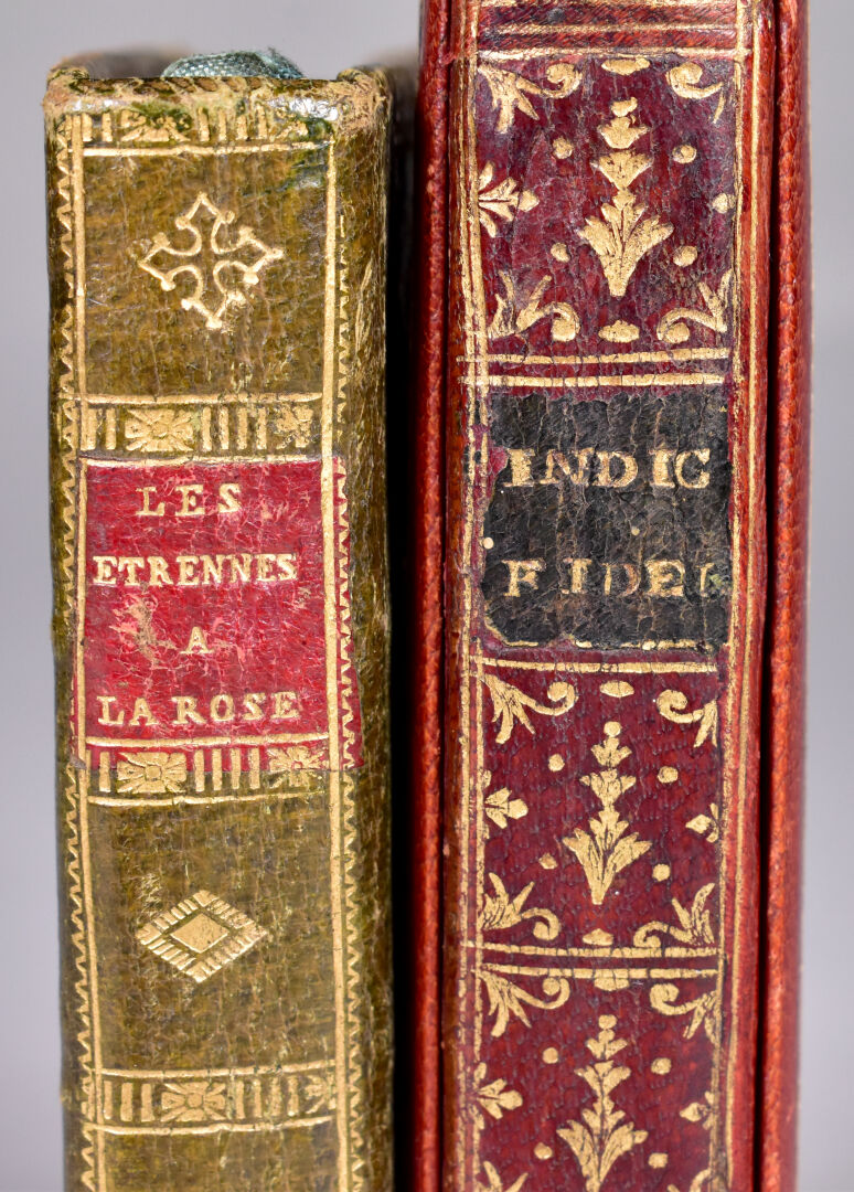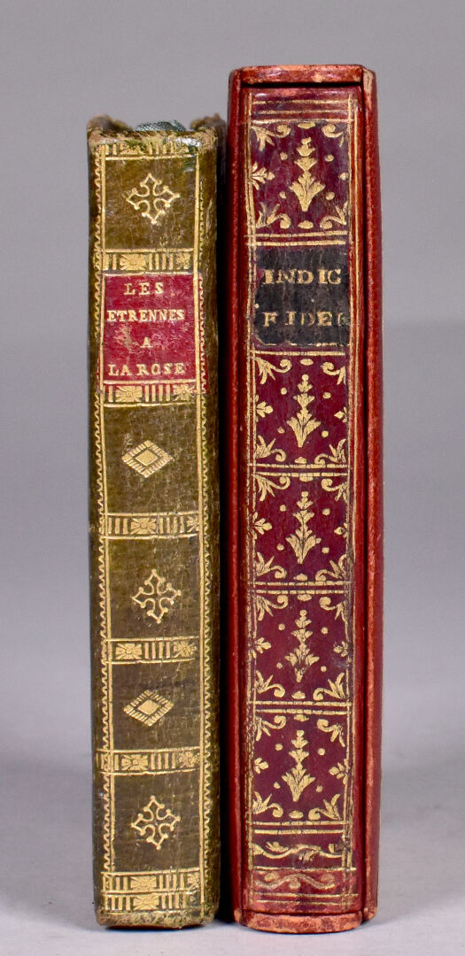 [ATLAS]. ÉTRENNES UTILES ET NÉCESSAIRES AUX COMMERÇANTS ET VOYAGEURS ou Indicateur fidèle enseignant toutes les Routes Royales et particulières de la France. P., Desnos, 1780. In-18 maroquin rouge, plats ornés d’un triple encadrement doré, dos lisse cloisonné et orné, pièce de titre, bordure intérieure, tranches dorées, étui bordé (Reliure de l’époque) ; frontispice illustré, titre, carte et plan à double page, 176-45 pp. DERNIÈRE ÉDITION, corrigée et augmentée en 1780. Une CARTE générale des routes de France et un PLAN des Environs de Paris à double-page, 157 pages d’ITINÉRAIRES rehaussés à l’aquarelle. BEL EXEMPLAIRE. ¶ Grand-Carteret, n°581. JOINT : LES ÉTRENNES À LA ROSE ou Le Rosier d’Amour. P., Janet, [1801]. In-18 maroquin vert, plats ornés d’un triple encadrement doré, dos lisse cloisonné et orné, pièce de titre, tranches dorées, 3 petits compartiments latéraux pour crayon (manquant) (Reliure de l’époque). Titre illustré et 12 gravures h.-t. ¶ Pas dans Grand-Carteret.