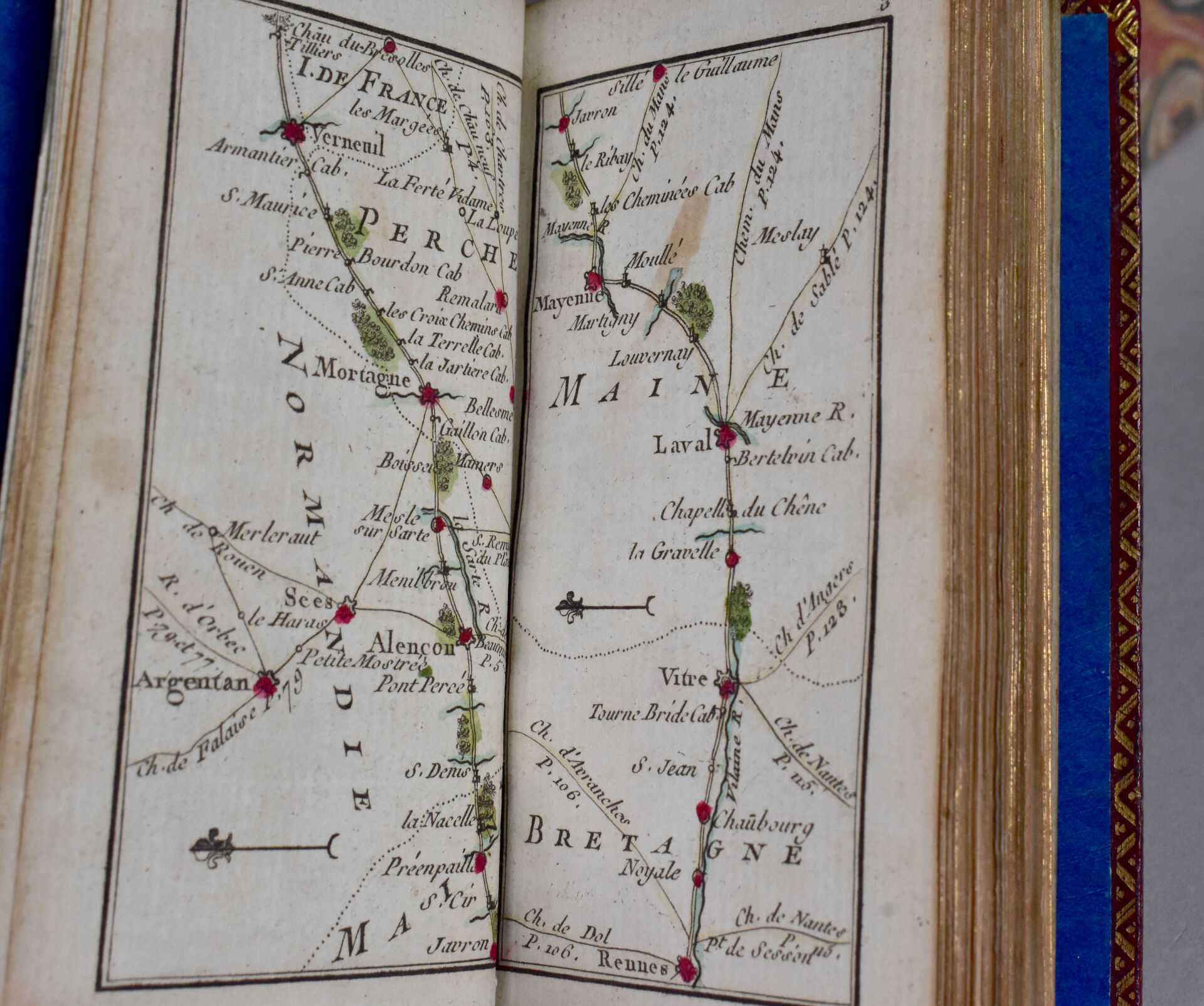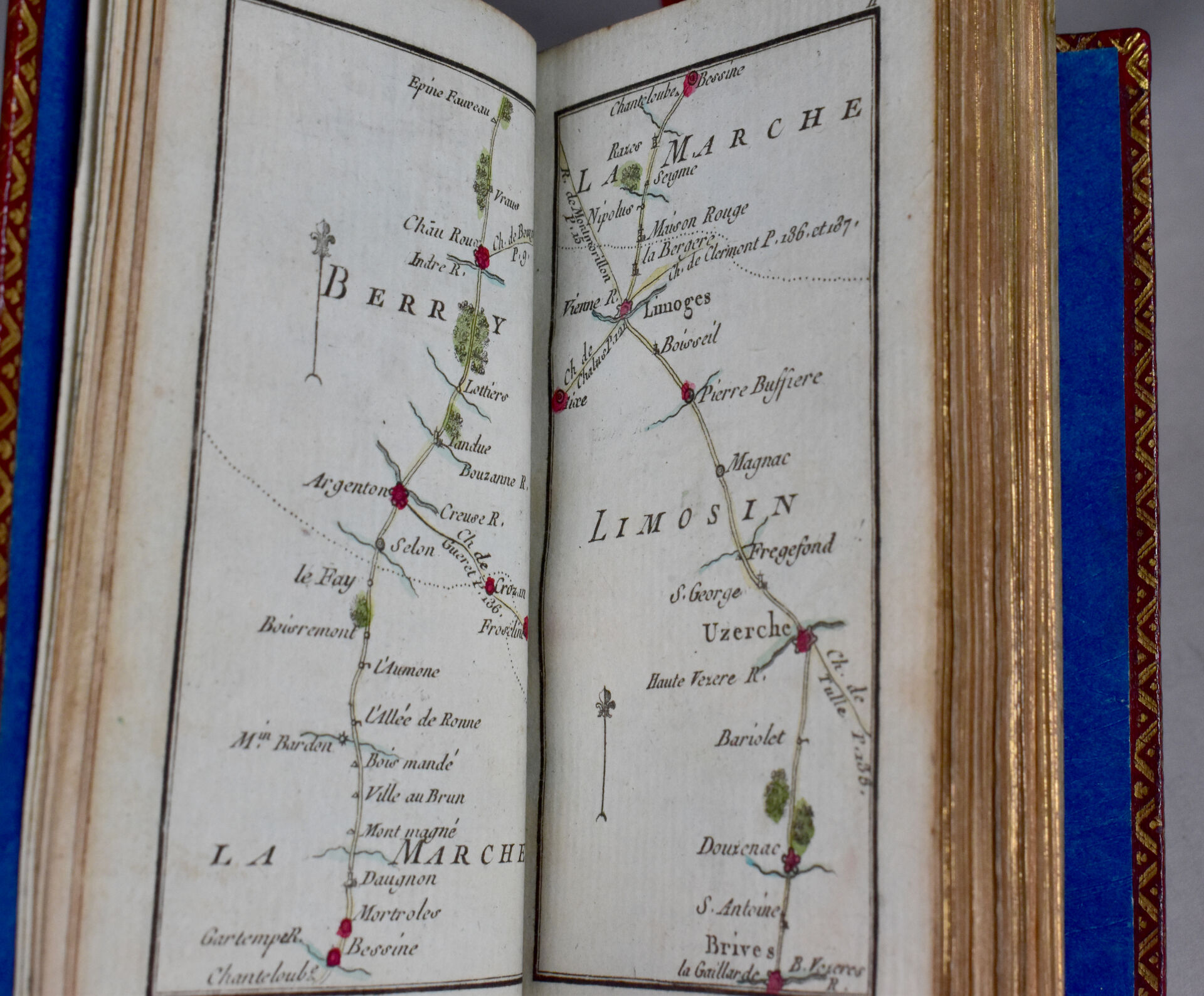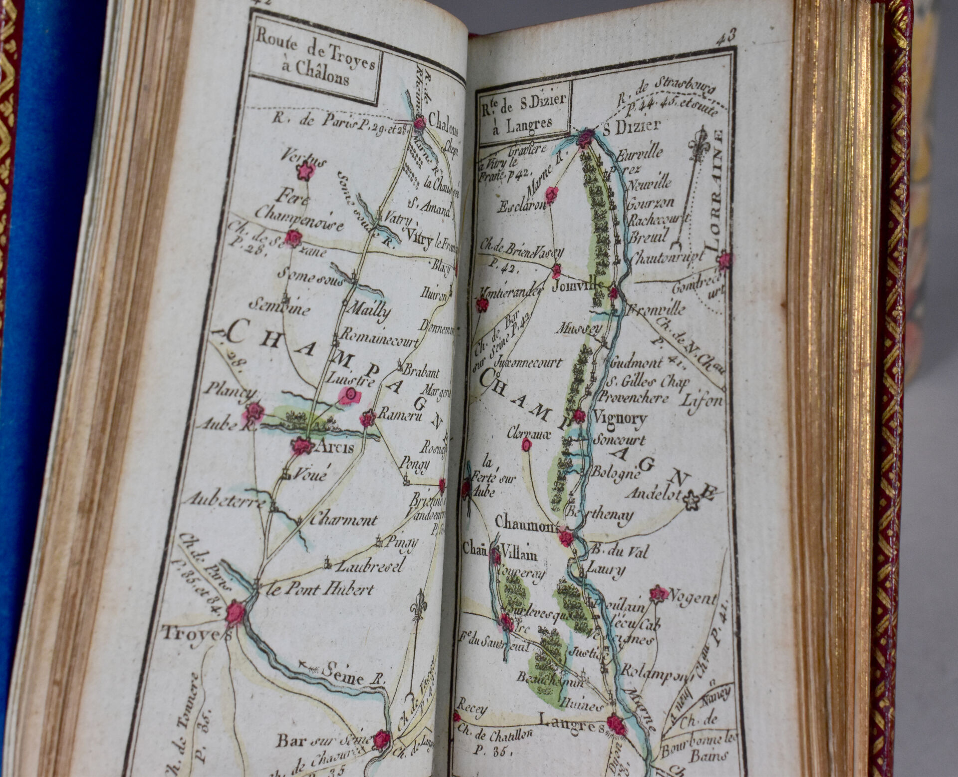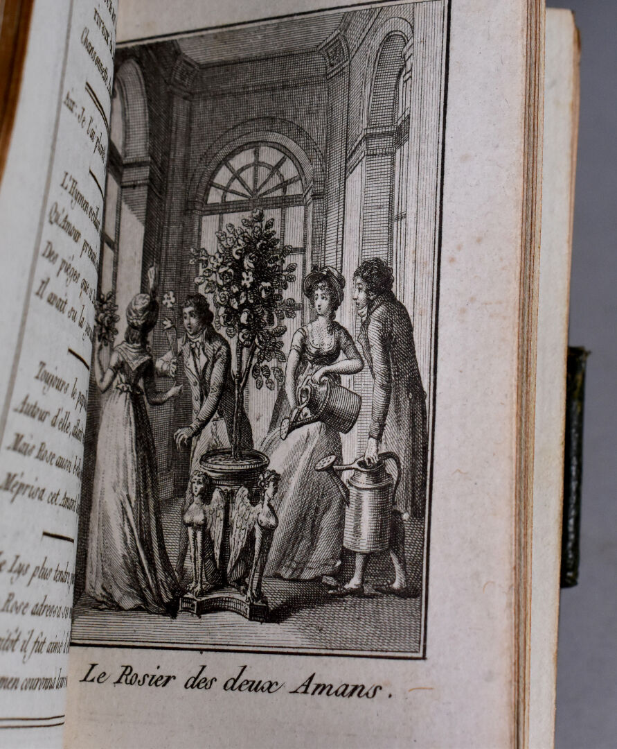 [ATLAS]. ÉTRENNES UTILES ET NÉCESSAIRES AUX COMMERÇANTS ET VOYAGEURS ou Indicateur fidèle enseignant toutes les Routes Royales et particulières de la France. P., Desnos, 1780. In-18 maroquin rouge, plats ornés d’un triple encadrement doré, dos lisse cloisonné et orné, pièce de titre, bordure intérieure, tranches dorées, étui bordé (Reliure de l’époque) ; frontispice illustré, titre, carte et plan à double page, 176-45 pp. DERNIÈRE ÉDITION, corrigée et augmentée en 1780. Une CARTE générale des routes de France et un PLAN des Environs de Paris à double-page, 157 pages d’ITINÉRAIRES rehaussés à l’aquarelle. BEL EXEMPLAIRE. ¶ Grand-Carteret, n°581. JOINT : LES ÉTRENNES À LA ROSE ou Le Rosier d’Amour. P., Janet, [1801]. In-18 maroquin vert, plats ornés d’un triple encadrement doré, dos lisse cloisonné et orné, pièce de titre, tranches dorées, 3 petits compartiments latéraux pour crayon (manquant) (Reliure de l’époque). Titre illustré et 12 gravures h.-t. ¶ Pas dans Grand-Carteret.