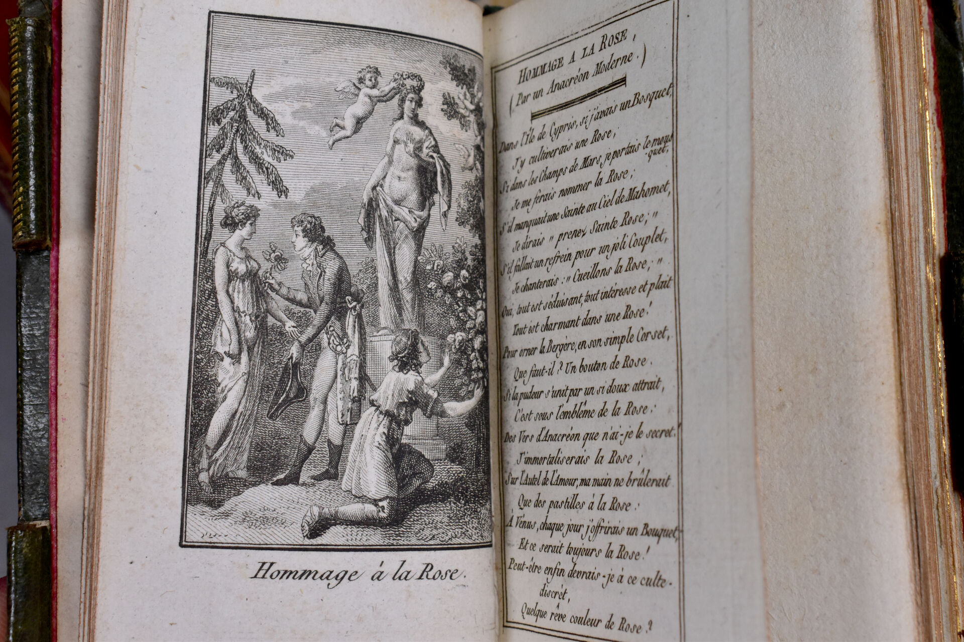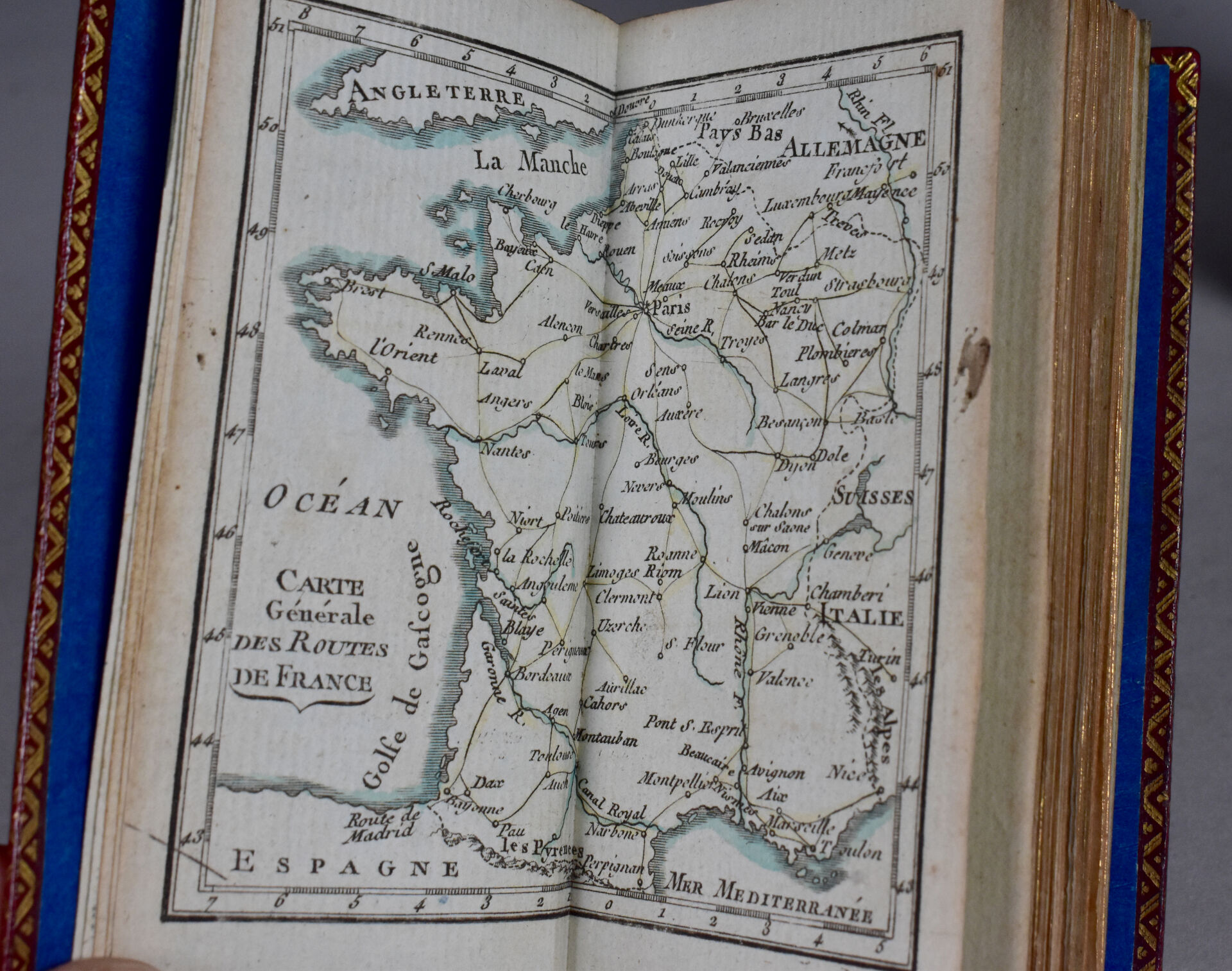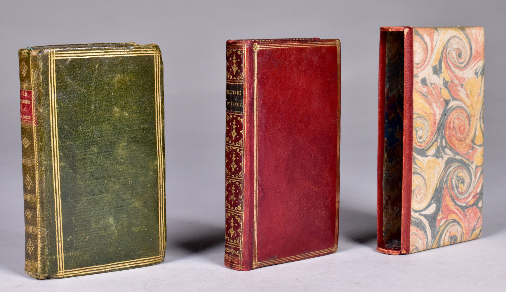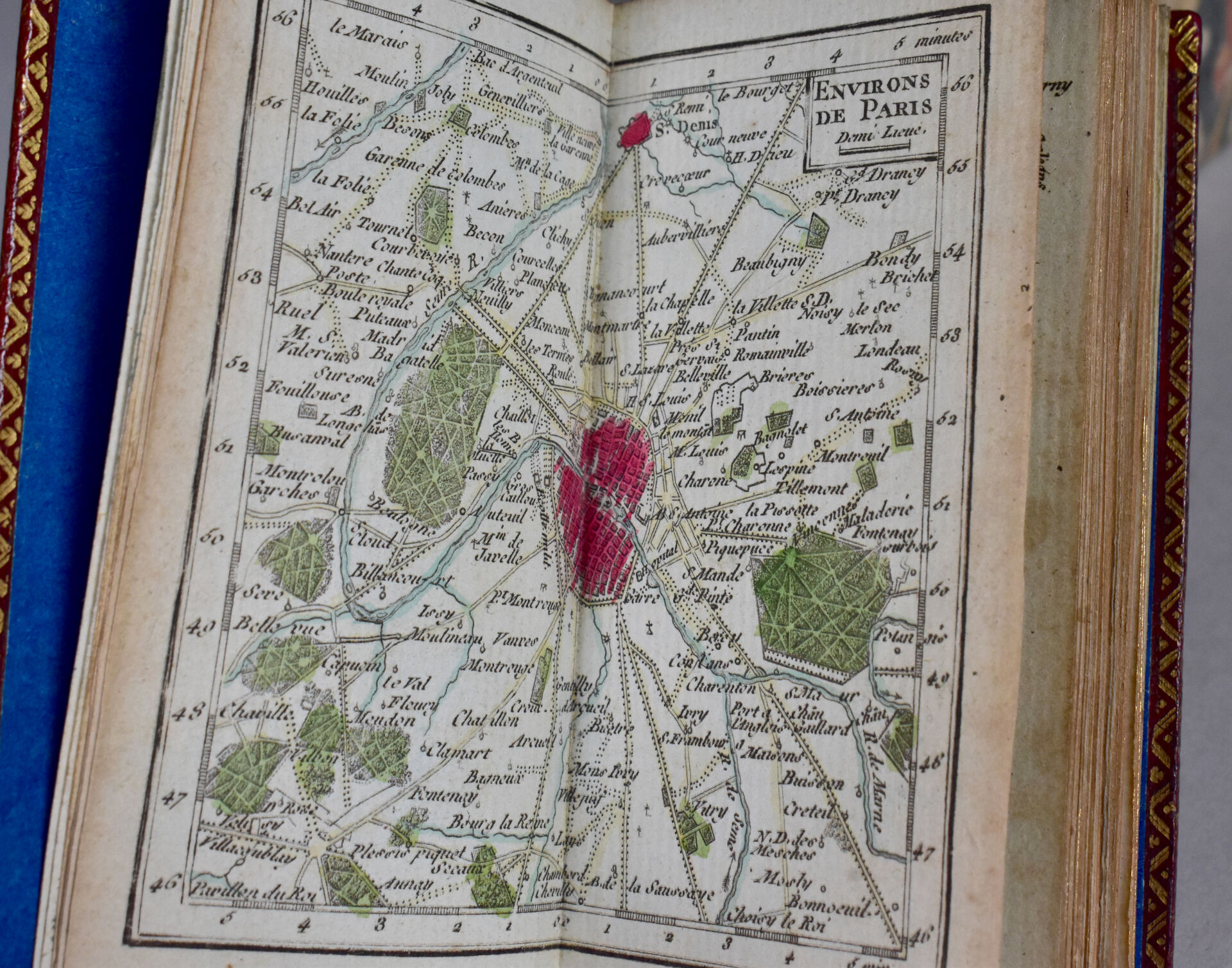 [ATLAS]. ÉTRENNES UTILES ET NÉCESSAIRES AUX COMMERÇANTS ET VOYAGEURS ou Indicateur fidèle enseignant toutes les Routes Royales et particulières de la France. P., Desnos, 1780. In-18 maroquin rouge, plats ornés d’un triple encadrement doré, dos lisse cloisonné et orné, pièce de titre, bordure intérieure, tranches dorées, étui bordé (Reliure de l’époque) ; frontispice illustré, titre, carte et plan à double page, 176-45 pp. DERNIÈRE ÉDITION, corrigée et augmentée en 1780. Une CARTE générale des routes de France et un PLAN des Environs de Paris à double-page, 157 pages d’ITINÉRAIRES rehaussés à l’aquarelle. BEL EXEMPLAIRE. ¶ Grand-Carteret, n°581. JOINT : LES ÉTRENNES À LA ROSE ou Le Rosier d’Amour. P., Janet, [1801]. In-18 maroquin vert, plats ornés d’un triple encadrement doré, dos lisse cloisonné et orné, pièce de titre, tranches dorées, 3 petits compartiments latéraux pour crayon (manquant) (Reliure de l’époque). Titre illustré et 12 gravures h.-t. ¶ Pas dans Grand-Carteret.