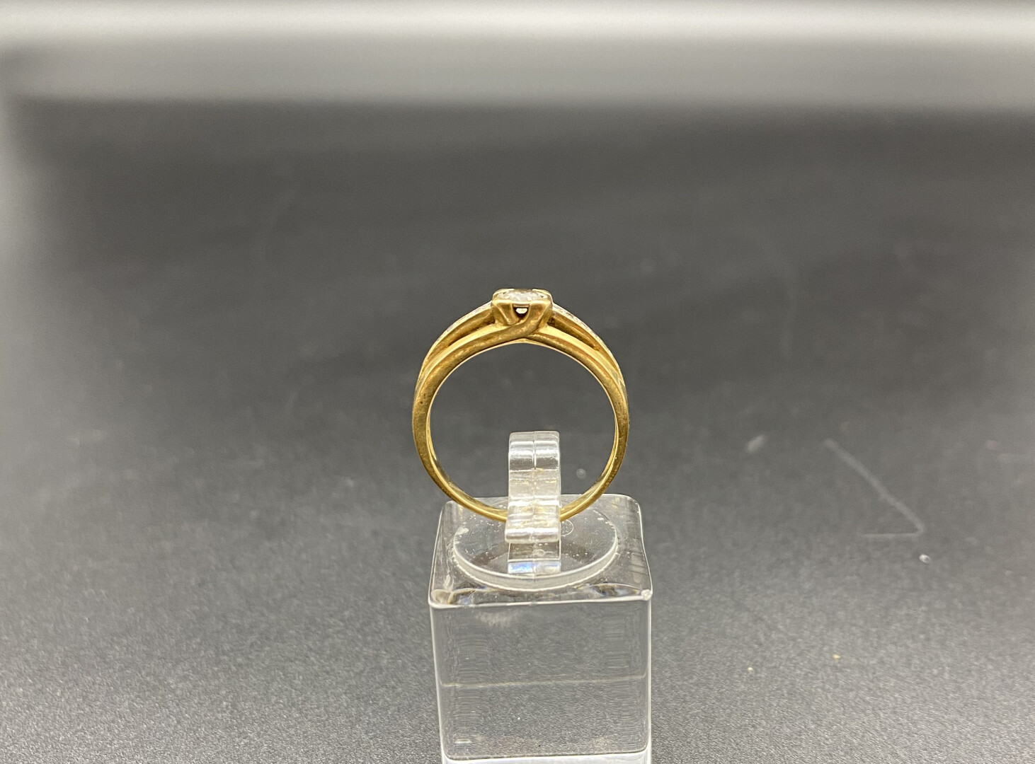 * ATTENTION LOT JUDICIAIRE REGLEMENT EXIGE SOUS 10 JOURS SOUS PEINE D’ANNULATION DU BORDEREAU ET POURSUITES. Bague en or jaune 18K 750/1000e sertie en son centre d’un diamant de taille ancienne d’environ 0,15/0,17 carat (anneau déformé, usures). TDD. : 53. Poids brut : 3,30 g. réf B021900650C