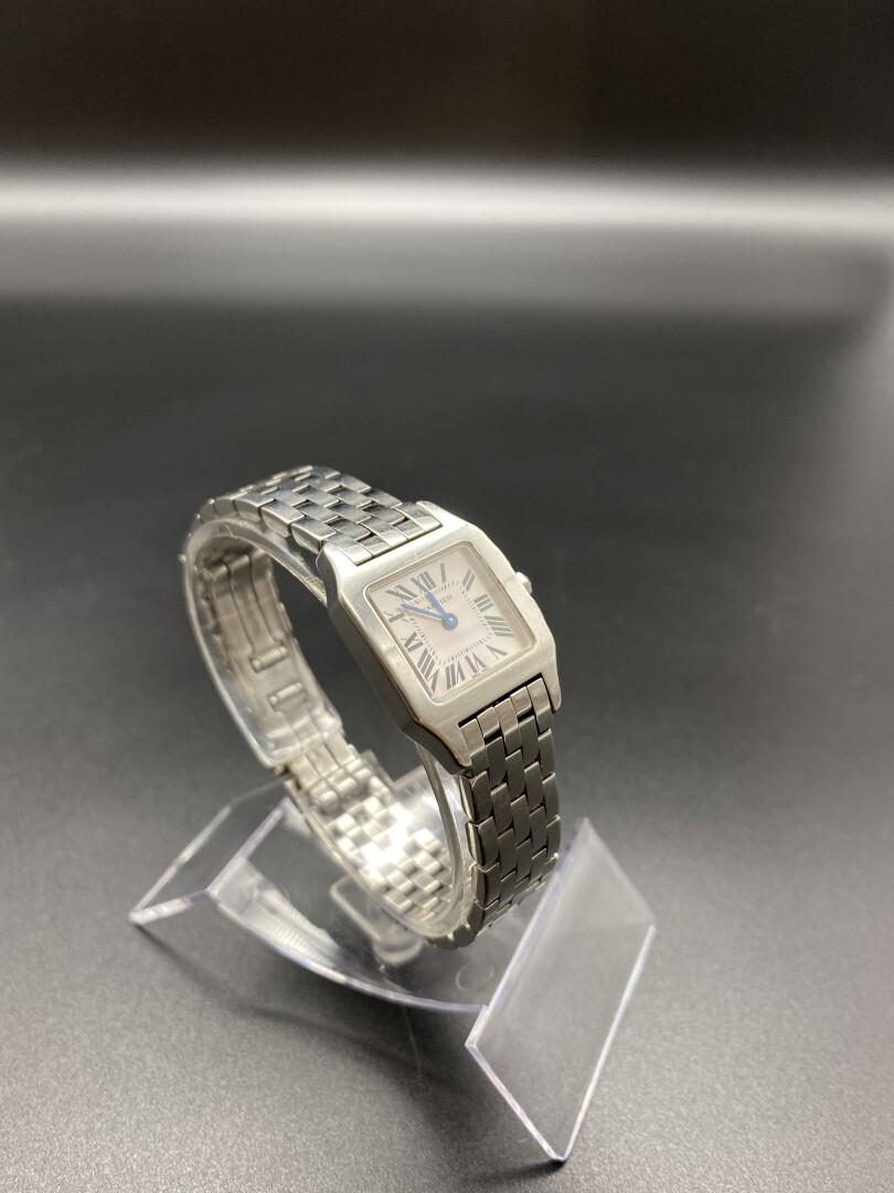 * ATTENTION LOT JUDICIAIRE REGLEMENT EXIGE SOUS 10 JOURS SOUS PEINE D’ANNULATION DU BORDEREAU ET POURSUITES. CARTIER. Montre bracelet de dame en acier modèle tank. Modèle 2698 « Santos Demoiselle » – Ref 616496 PB – Cadran à fond nacré signé, chiffres romains pour les heures. Bracelet souple à boucle déployante. Numérotée 616496PB 2698 (usures d’usage). Ecrin. réf. : B021900667X