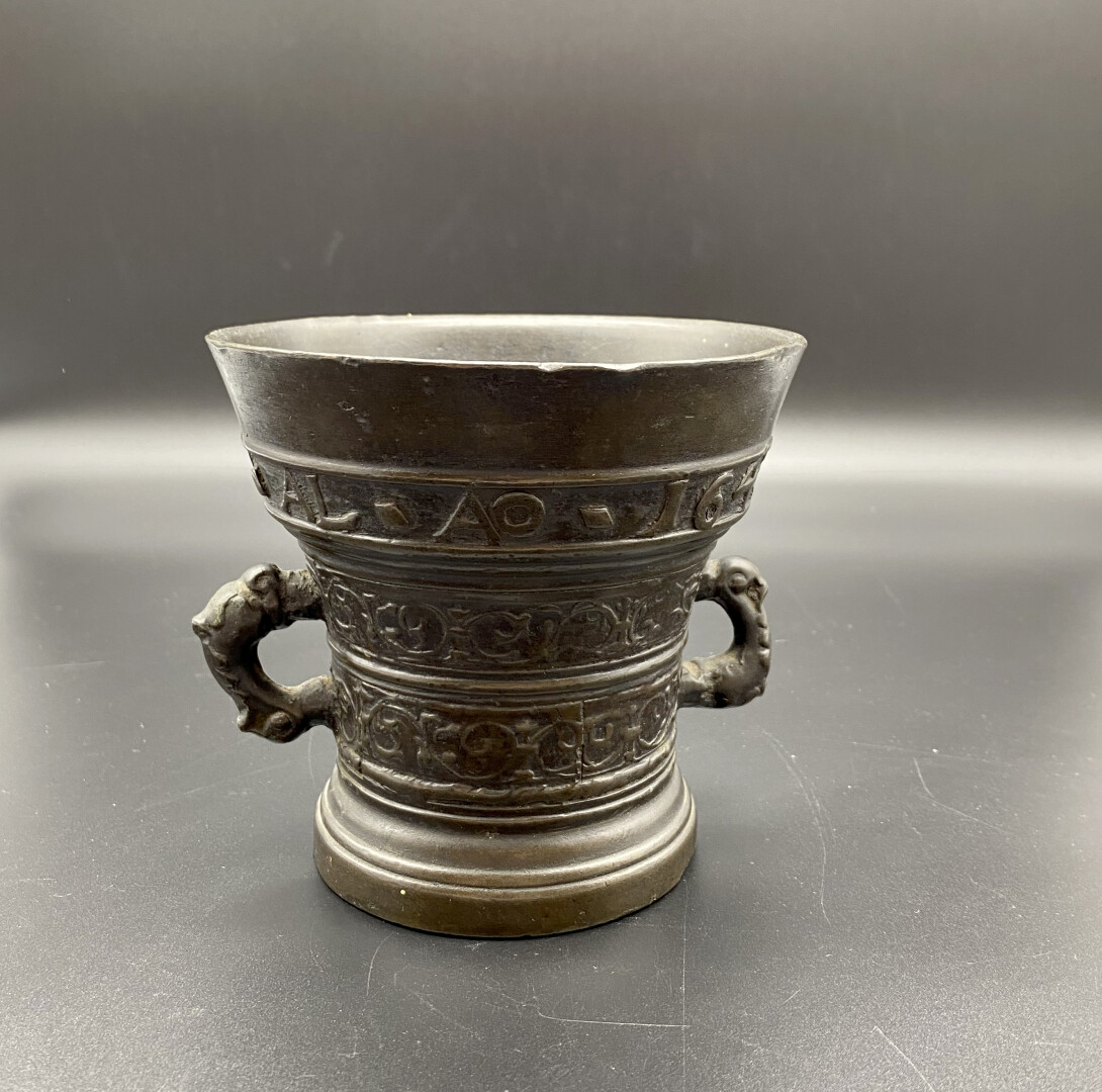 * ATTENTION LOT JUDICIAIRE REGLEMENT EXIGE SOUS 10 JOURS SOUS PEINE D’ANNULATION DU BORDEREAU ET POURSUITES. Deux mortiers d’apoticaire en bronze : un du XVIIe siècle daté 1643 (usures et chocs). Haut. : 11,5 cm. réf B022100216G