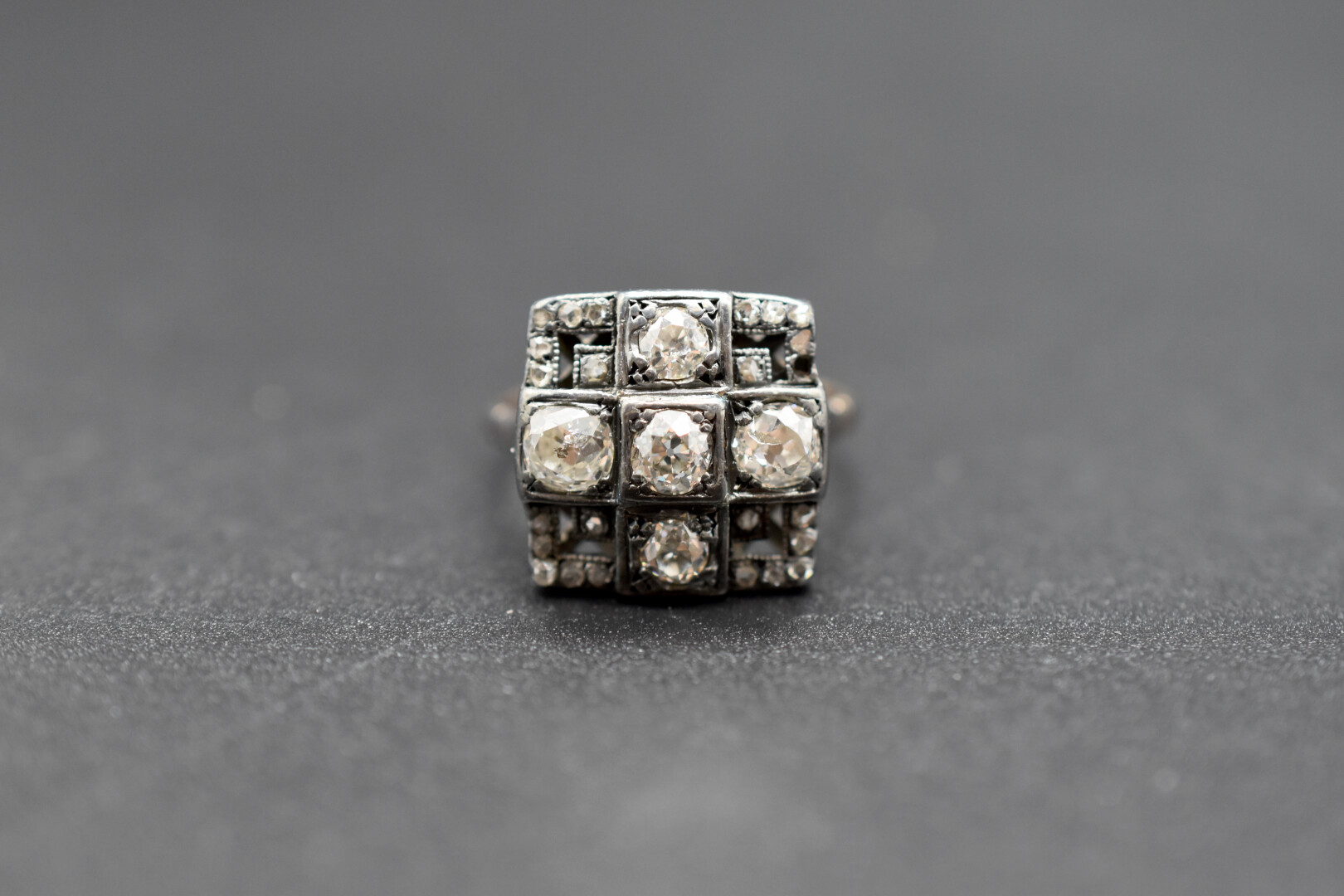 ATTENTION LOT JUDICIAIRE REGLEMENT EXIGE SOUS 10 JOURS SOUS PEINE D’ANNULATION DU BORDEREAU ET POURSUITES. Ensemble en or gris 18K 750/1000e soit une alliance américaine sertie de petits diamants de taille brillant d’environ 0.05 carat chacun (déformation), une bague à chaton hexagonal sertie en son centre d’un rubis de taille ovale dans un double entourage de petits diamants et une bague en or 14K 585/1000e à chaton carré orné de 5 diamants de taille ancienne d’environ 0.22 carat chacun. TDD 50-55-56 . Poids brut total : 15,90 g. réf B021901368S